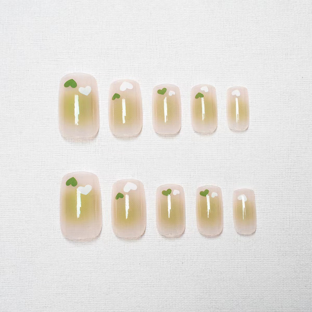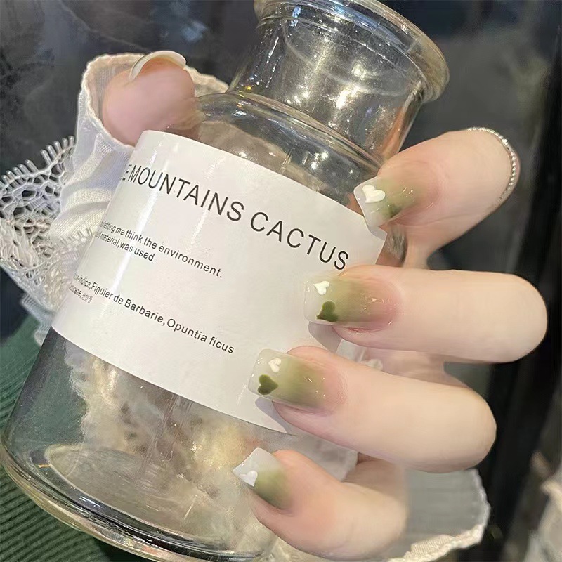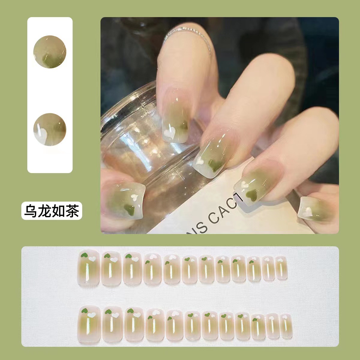 乌龙如茶奶绿色晕染渐变爱心中长款假指甲成品批发穿戴式可拆卸