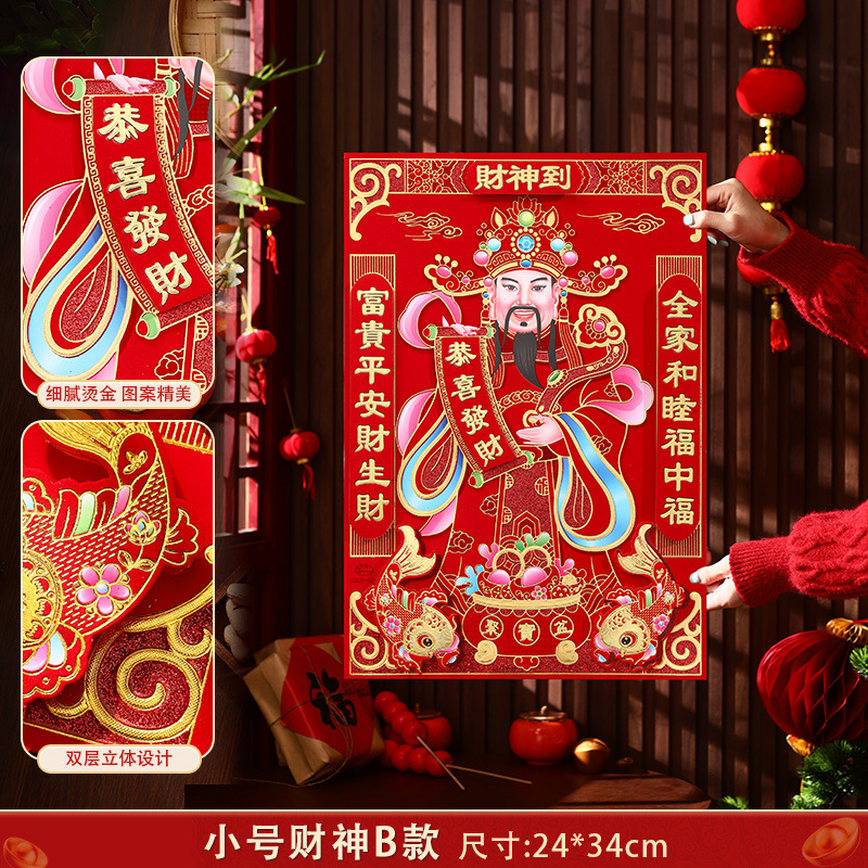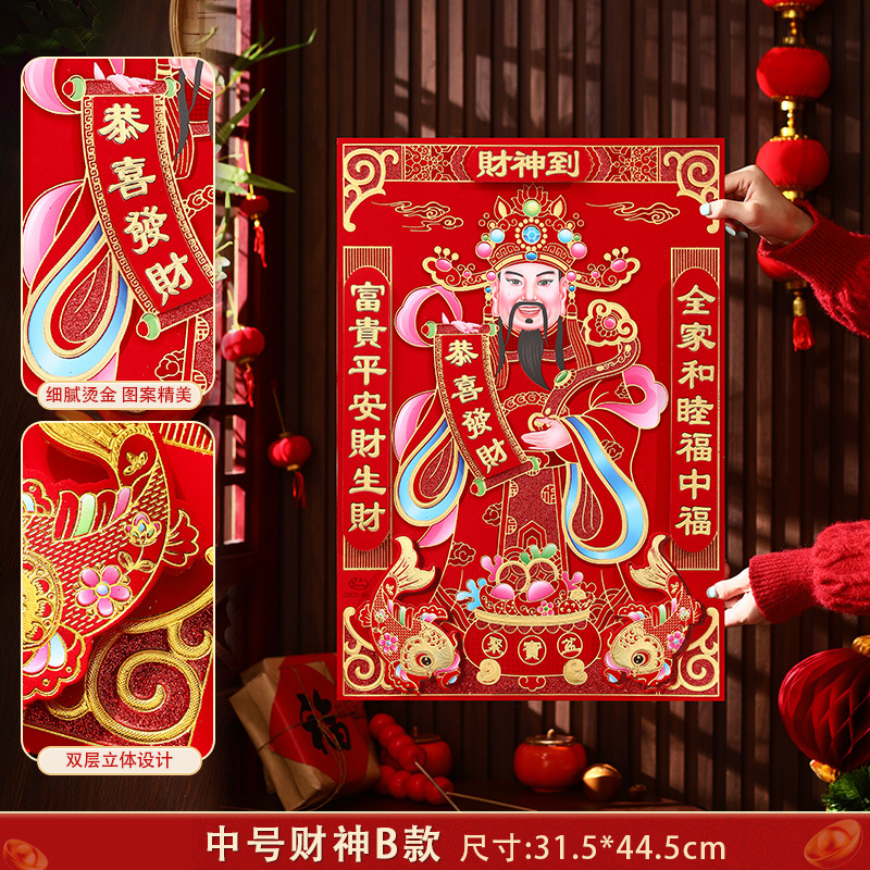 财神爷年画2025蛇年立体植绒五路财神画像贴纸财神到门贴春节用品