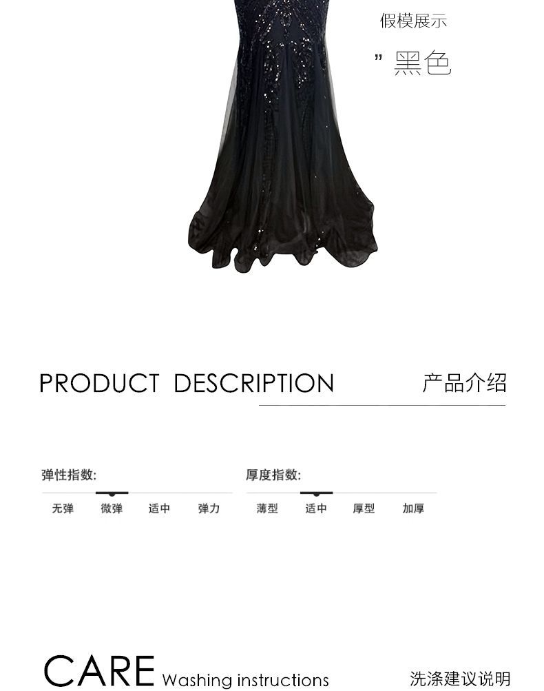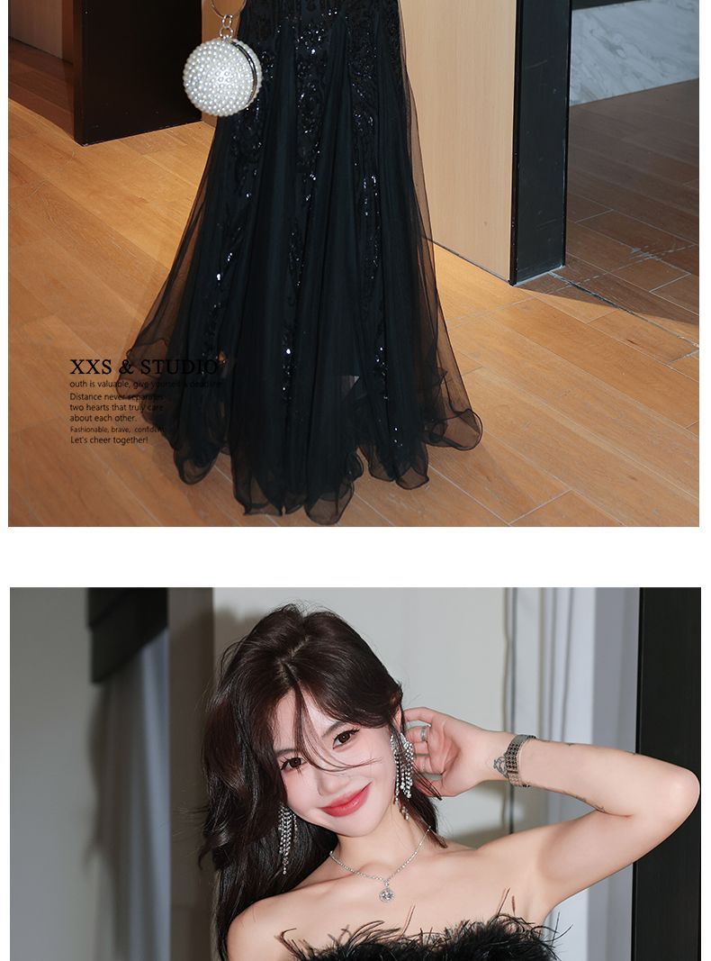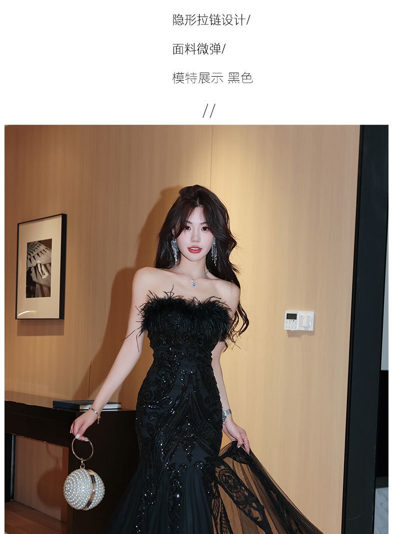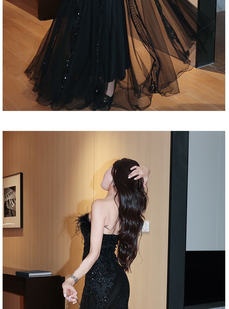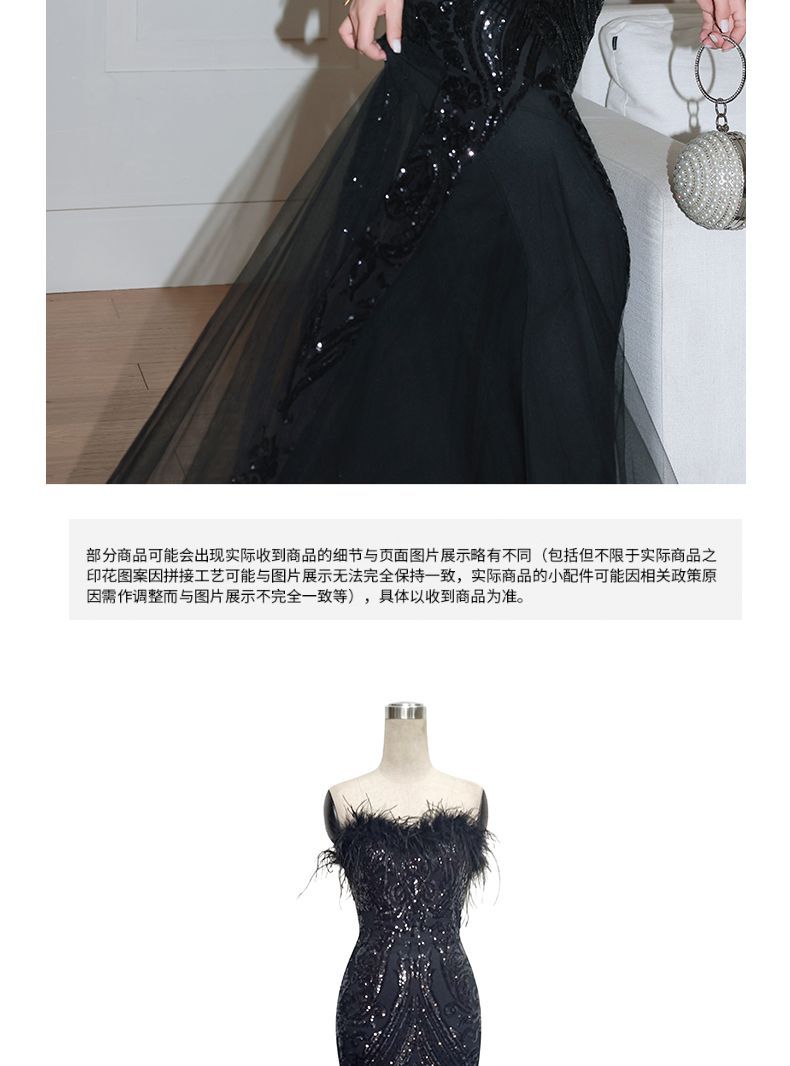 成人晚礼服女黑色鸵鸟毛亮片鱼尾纱裙重工主持人宴会结婚艺考生日