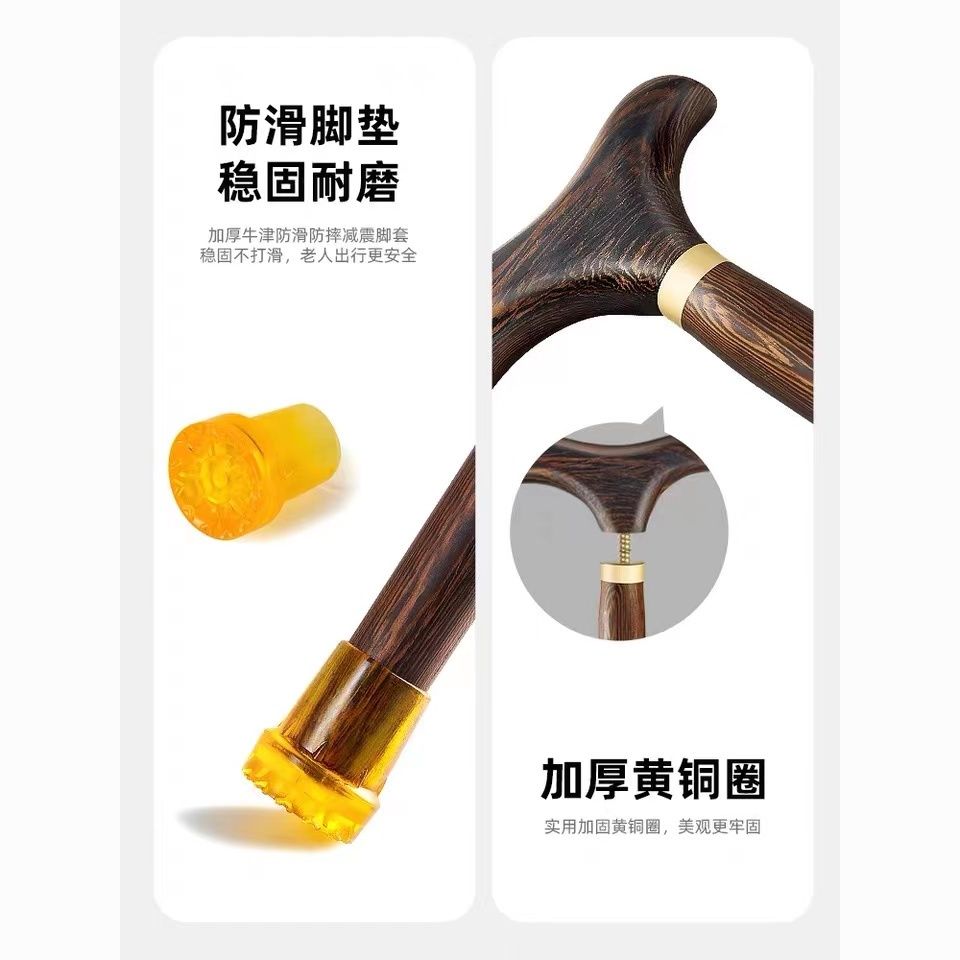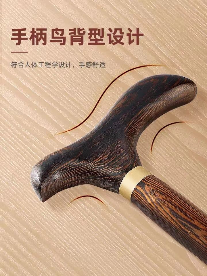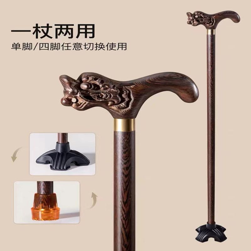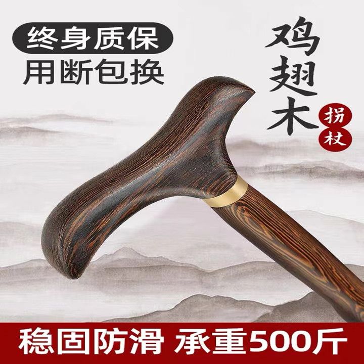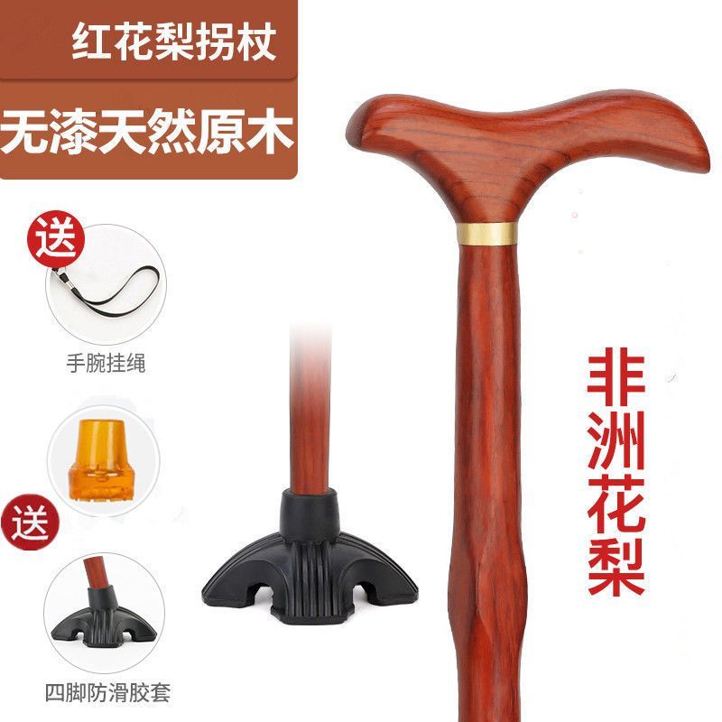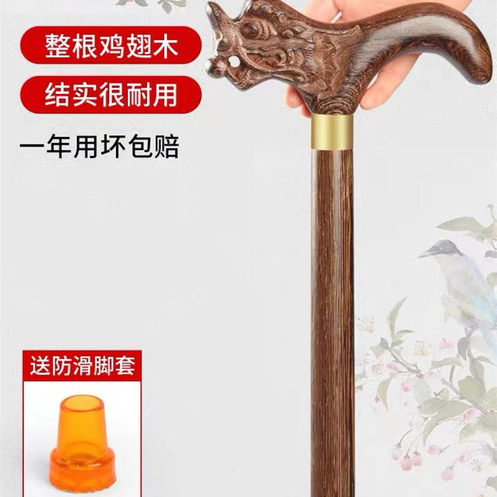 高档拐杖鸡翅木红木实木一体手杖老人助行器四脚防滑龙头防摔神器