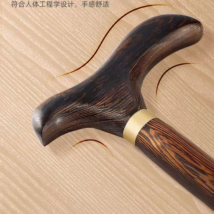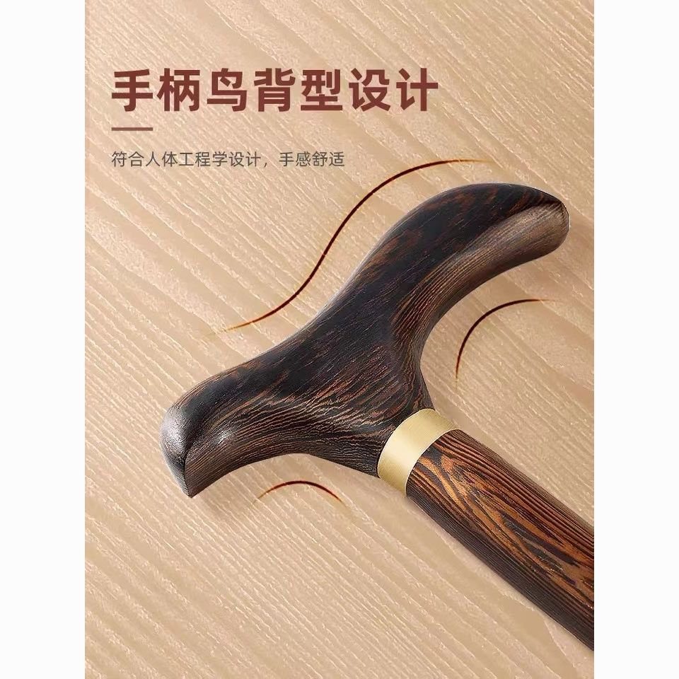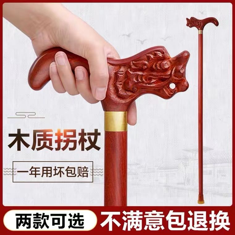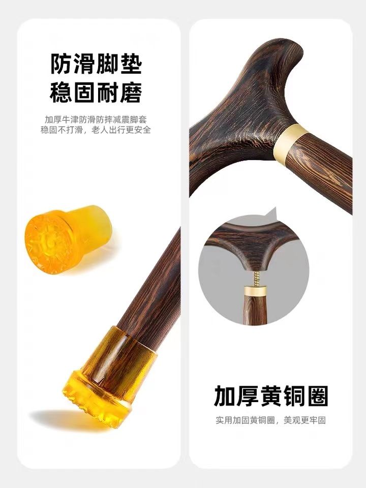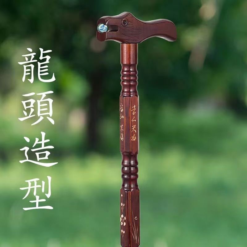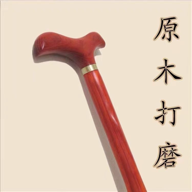 高档拐杖鸡翅木红木实木一体手杖老人助行器四脚防滑龙头防摔神器