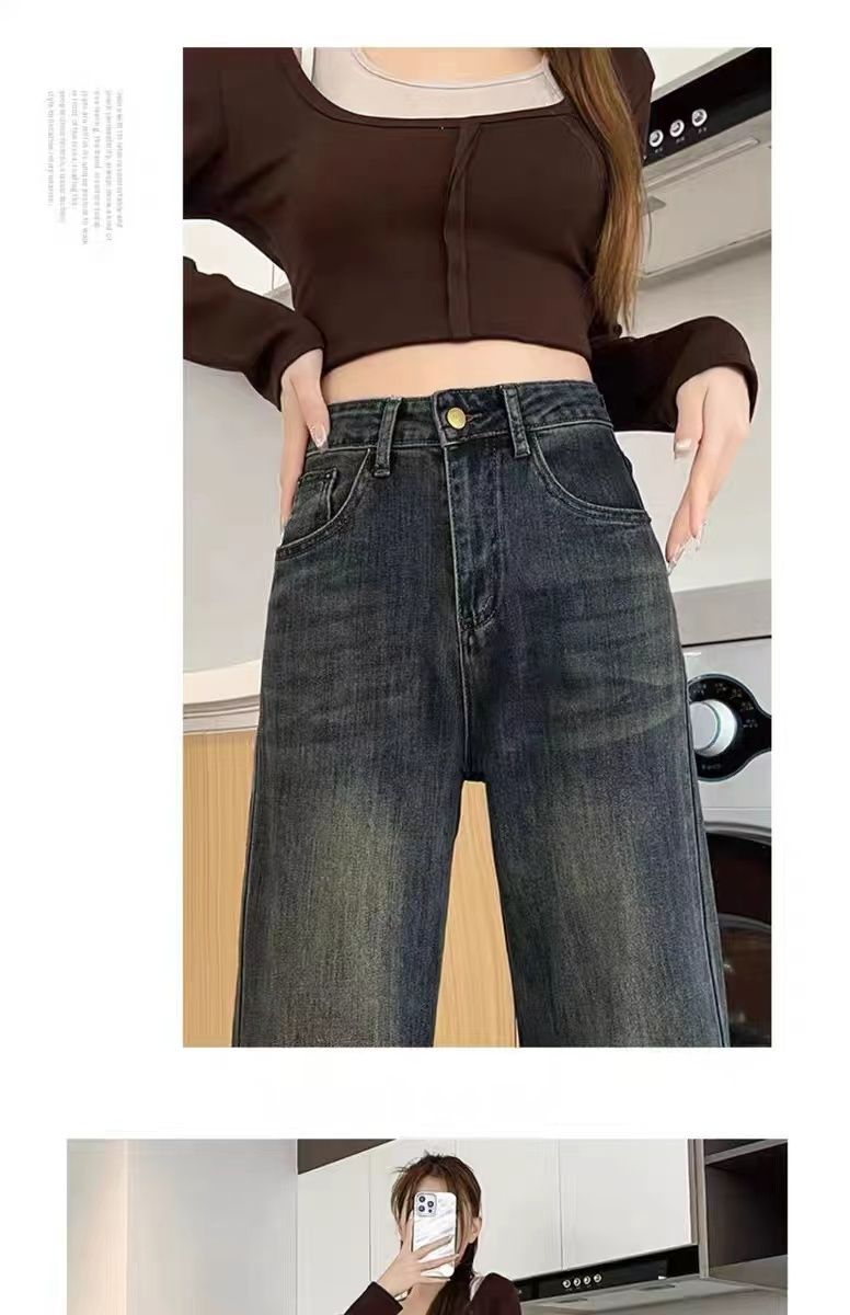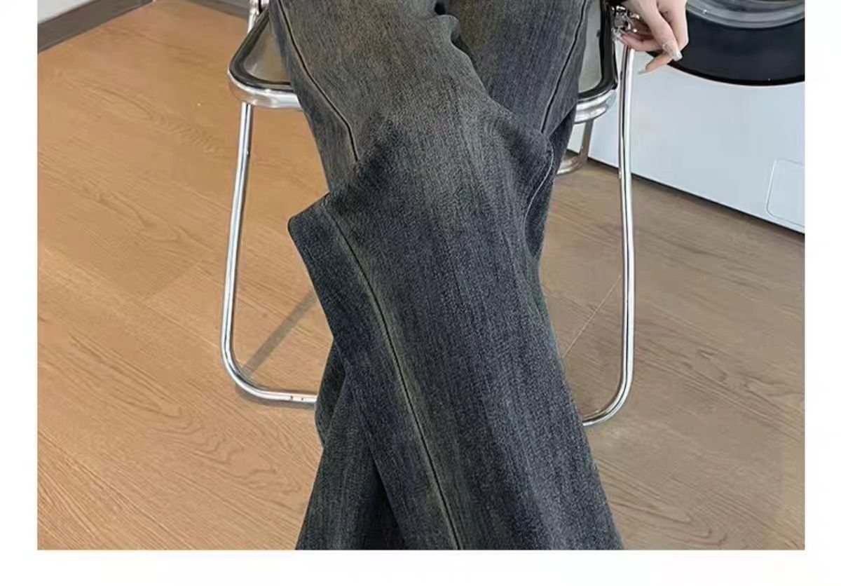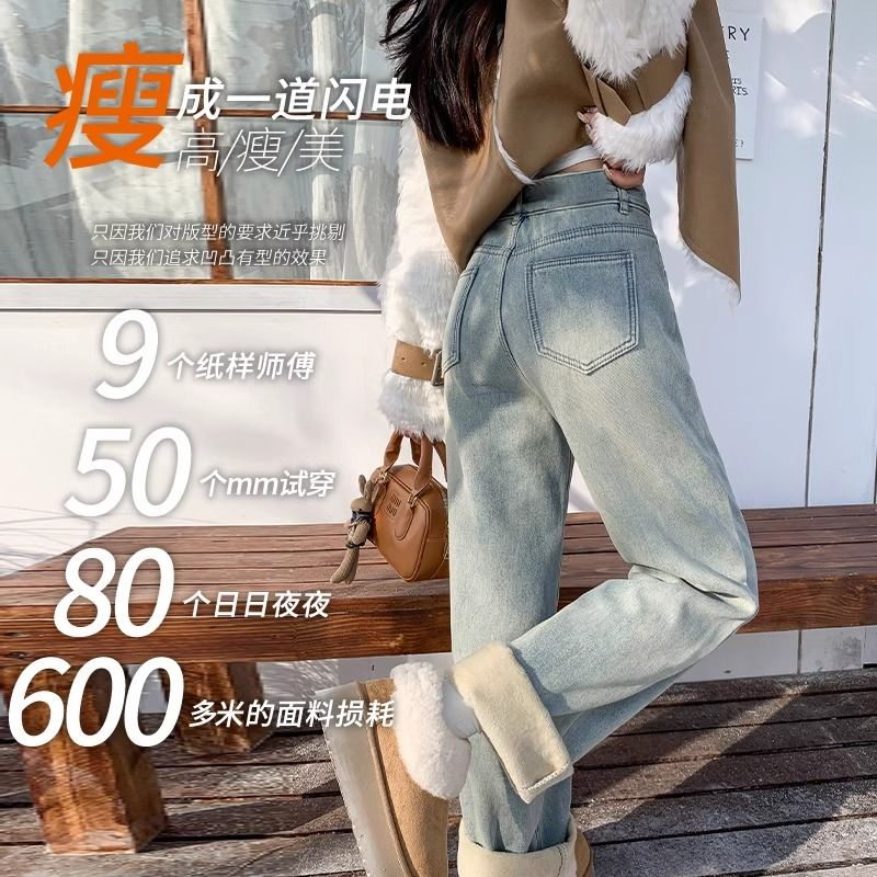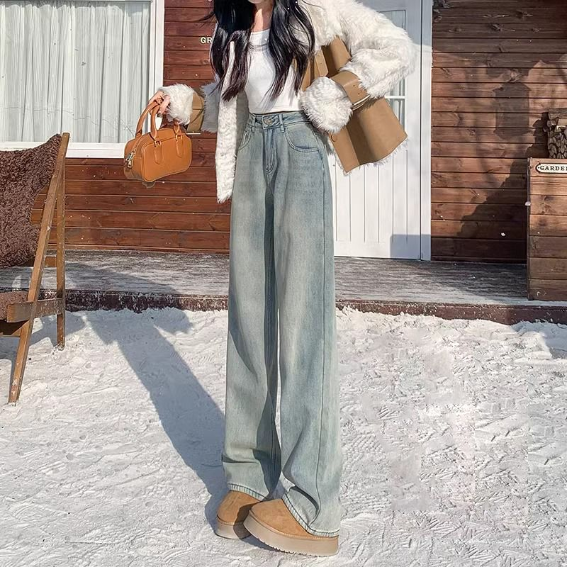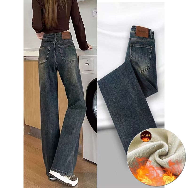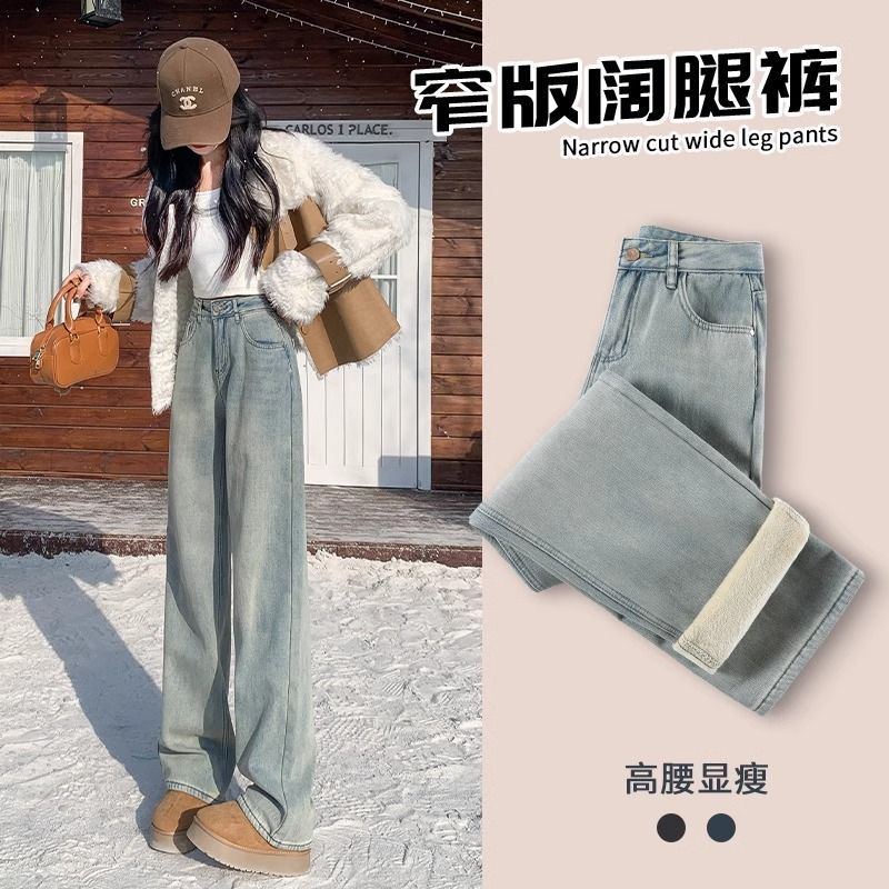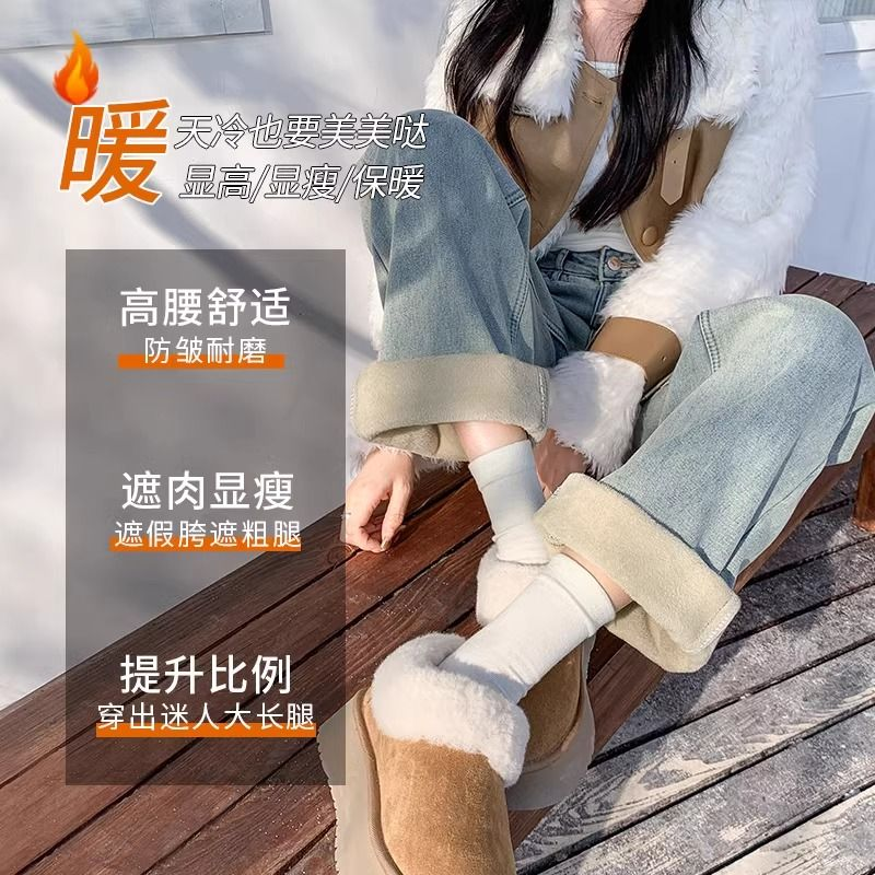 高腰直筒加绒牛仔裤女士裤子秋冬季阔腿裤百搭垂坠感显高显瘦加厚