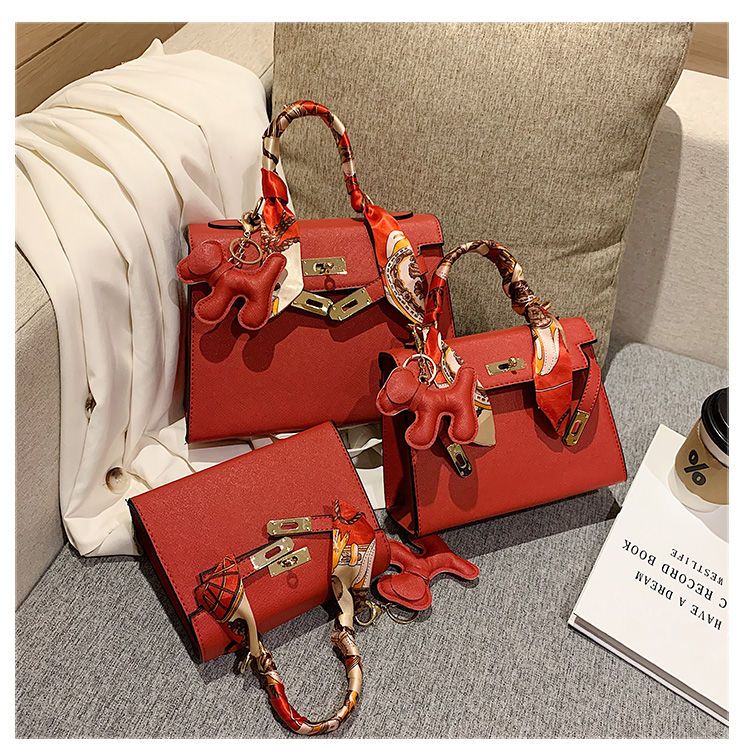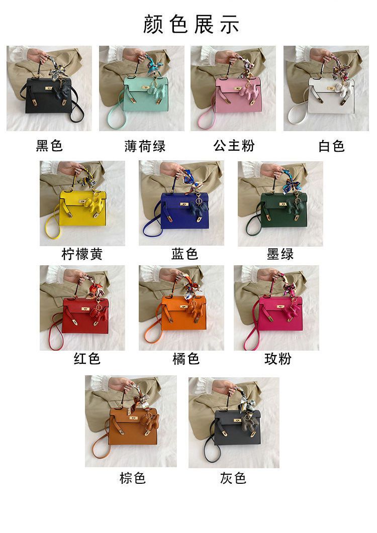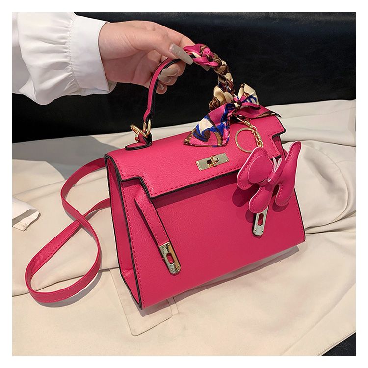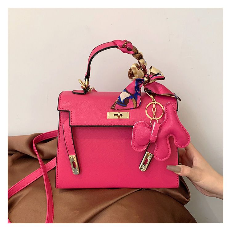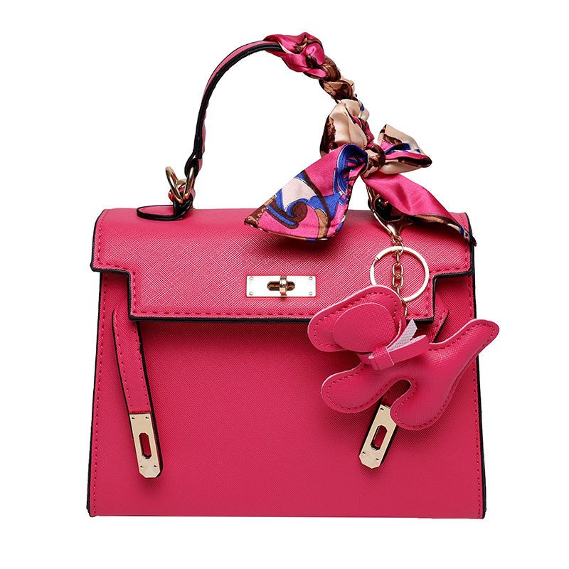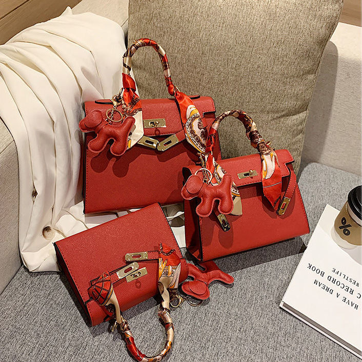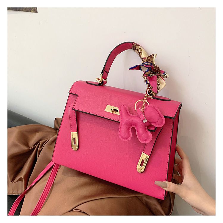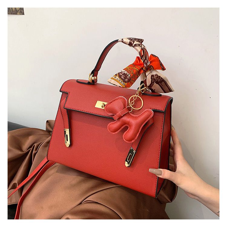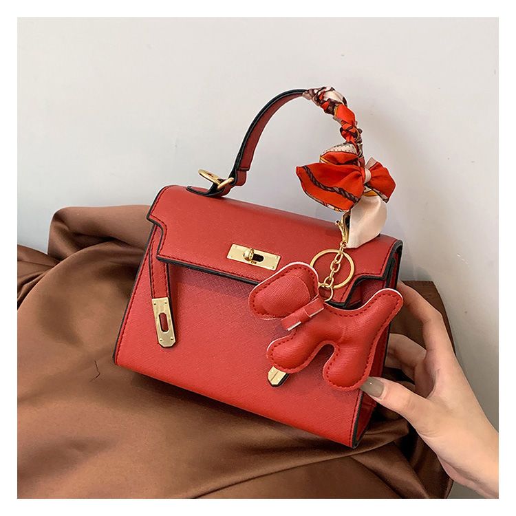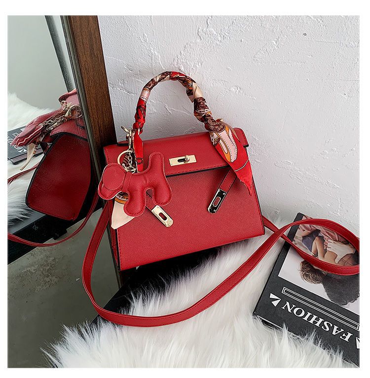 新款百搭大容量气质凯莉单肩包红色手提婚包丝巾小狗挂件斜挎小包
