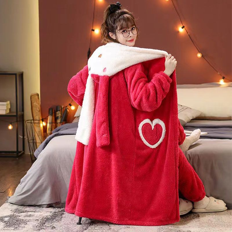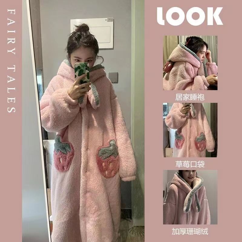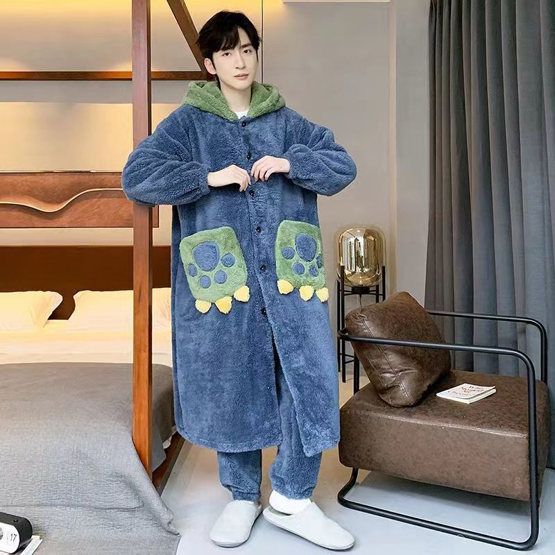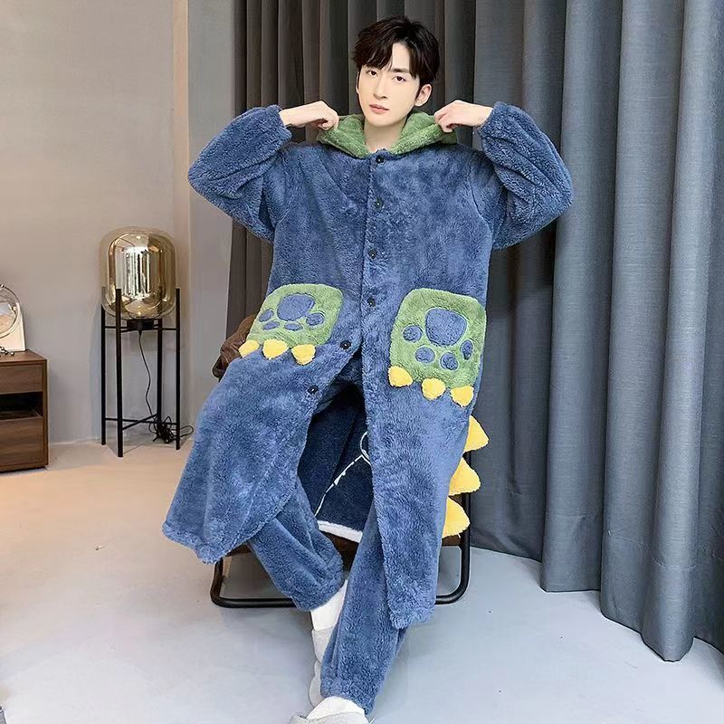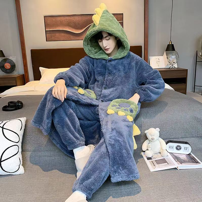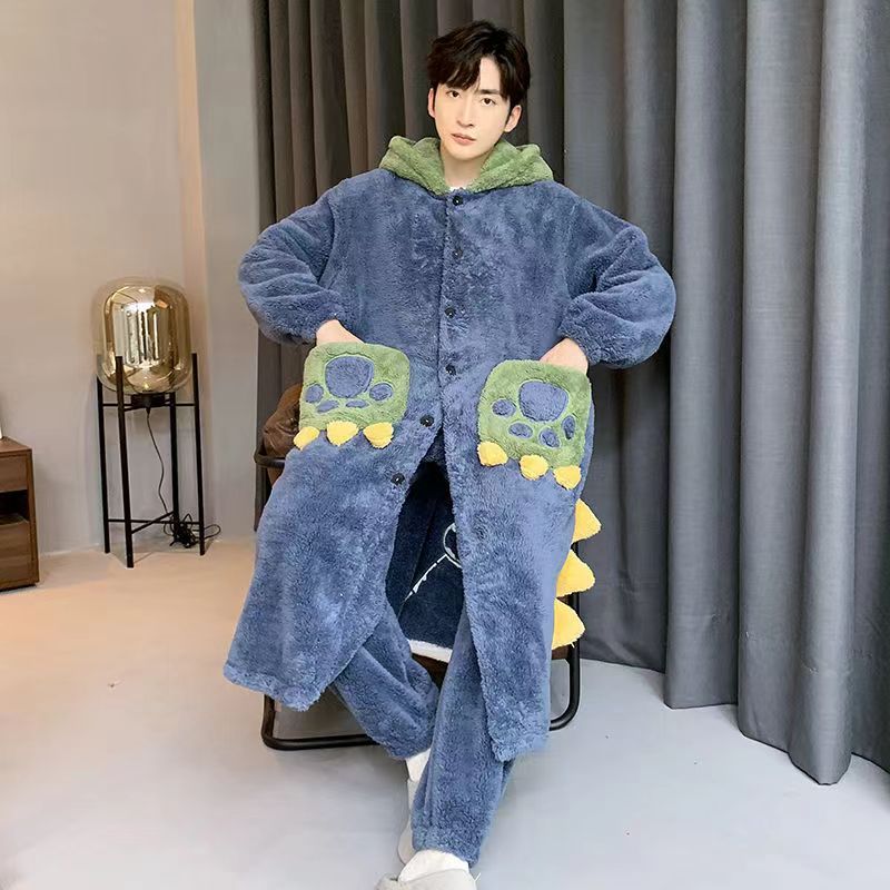 恐龙珊瑚绒睡袍男女同款可爱冬季加厚保暖睡衣套装中长款秋天浴袍
