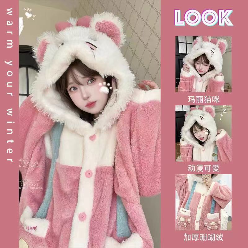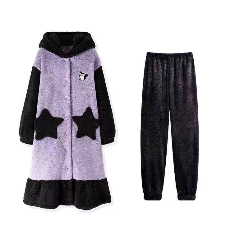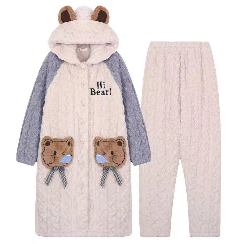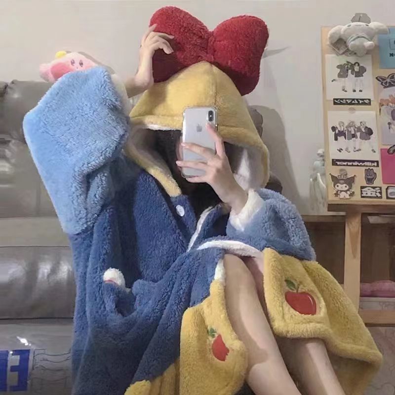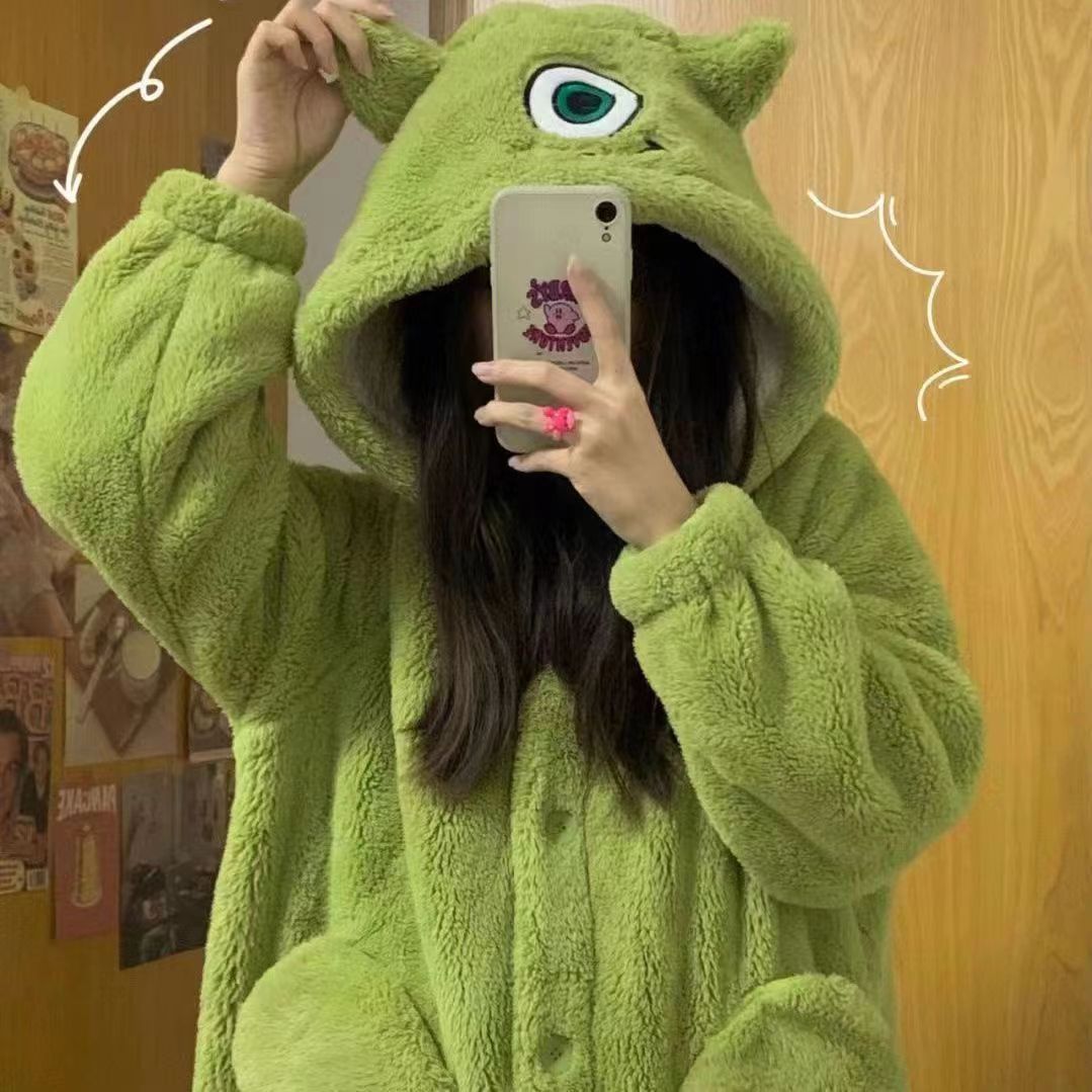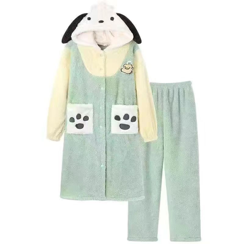 恐龙珊瑚绒睡袍男女同款可爱冬季加厚保暖睡衣套装中长款秋天浴袍
