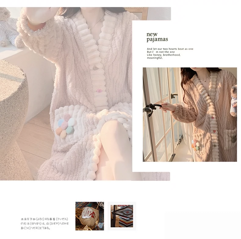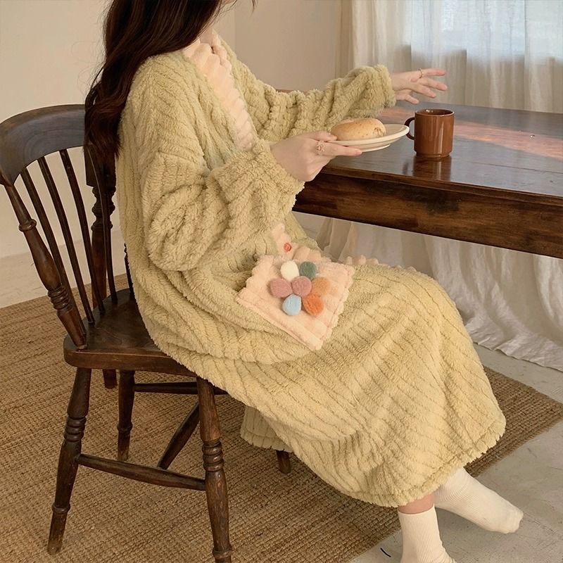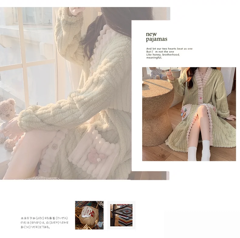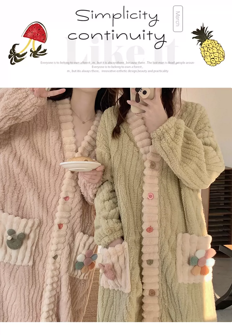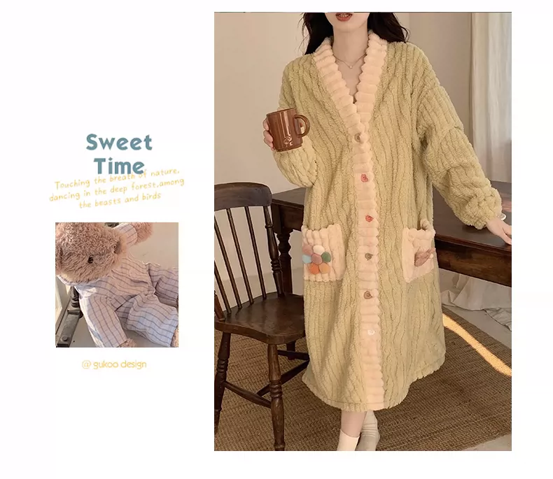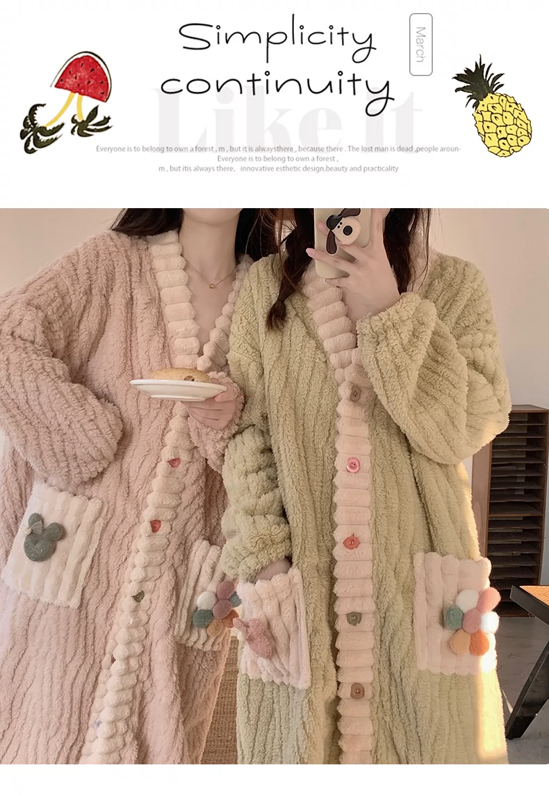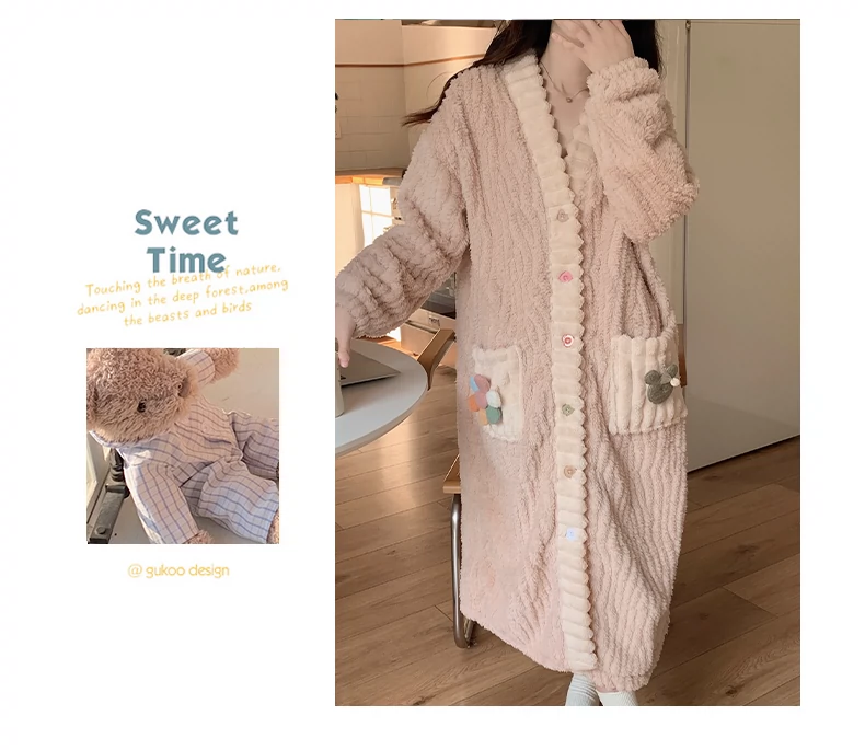 珊瑚绒睡袍女秋冬长款加厚加绒甜美可爱法兰绒浴袍冬季睡衣家居服