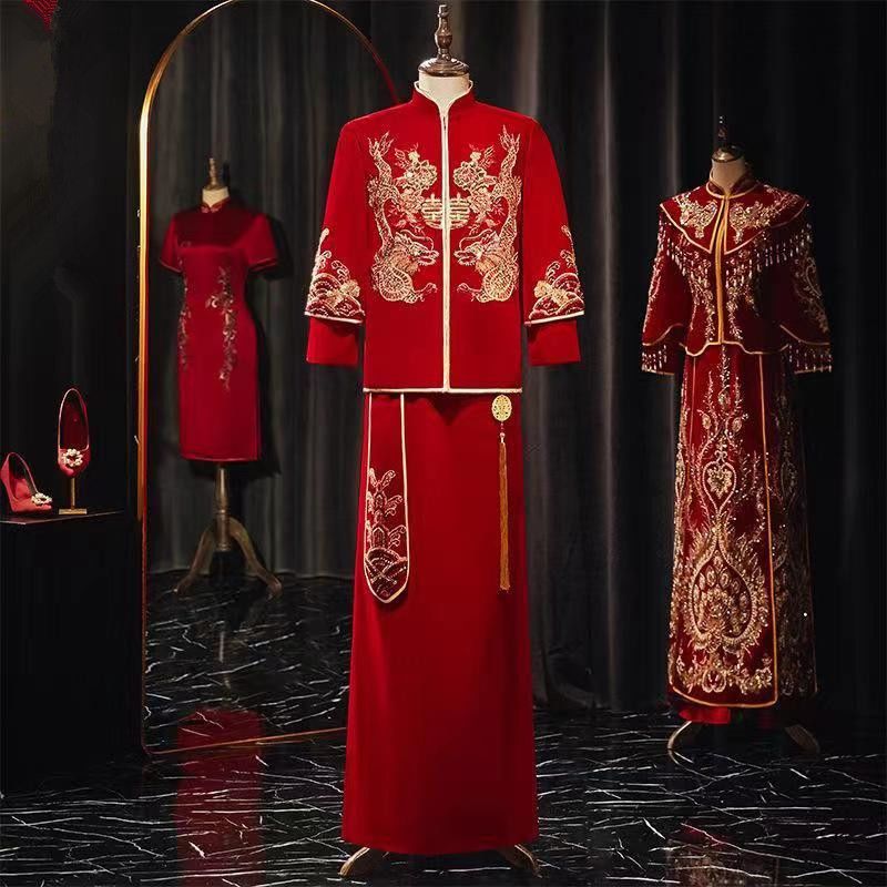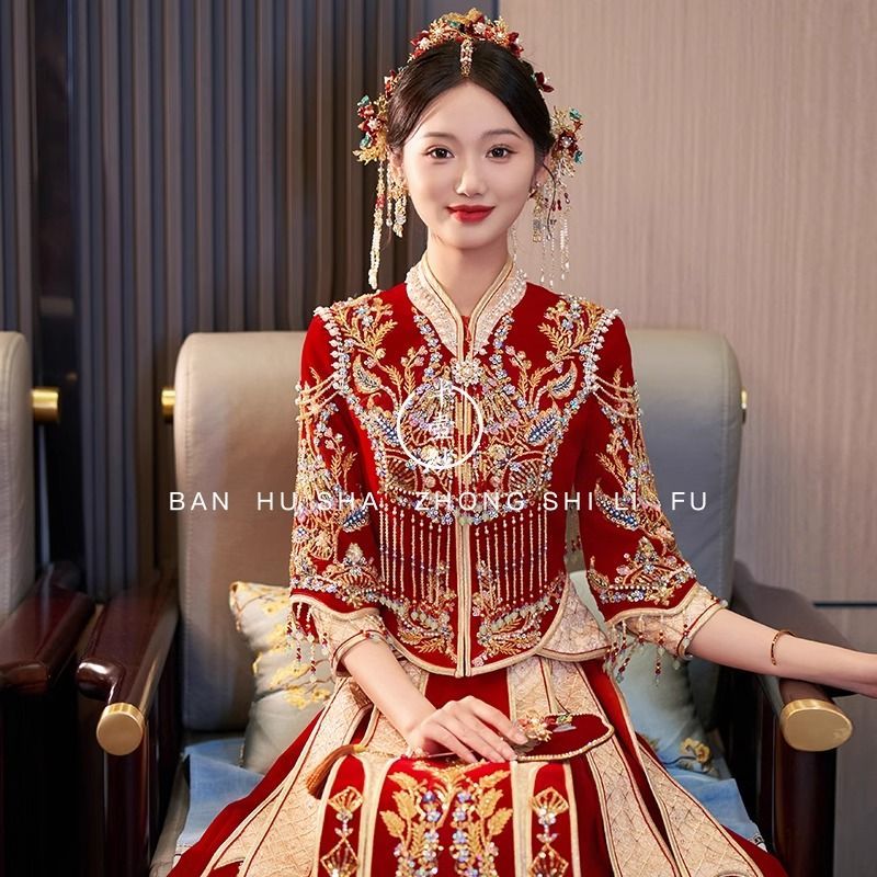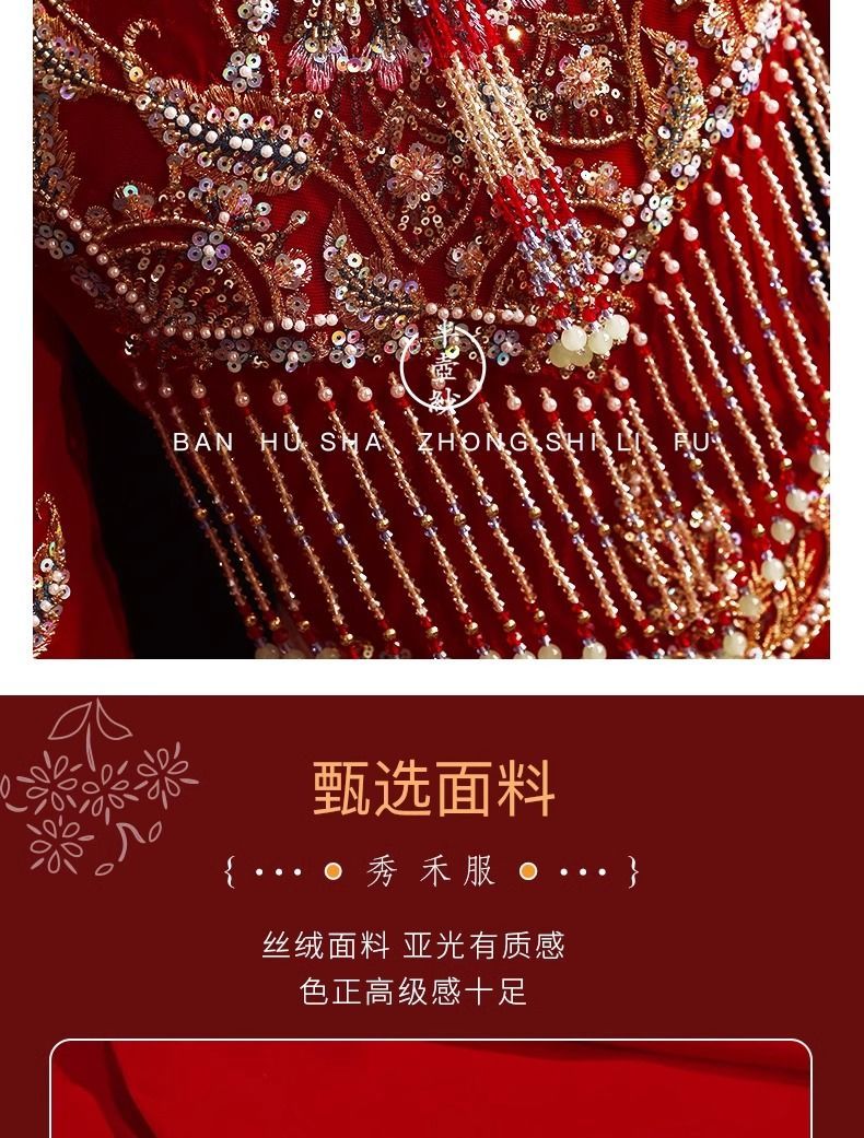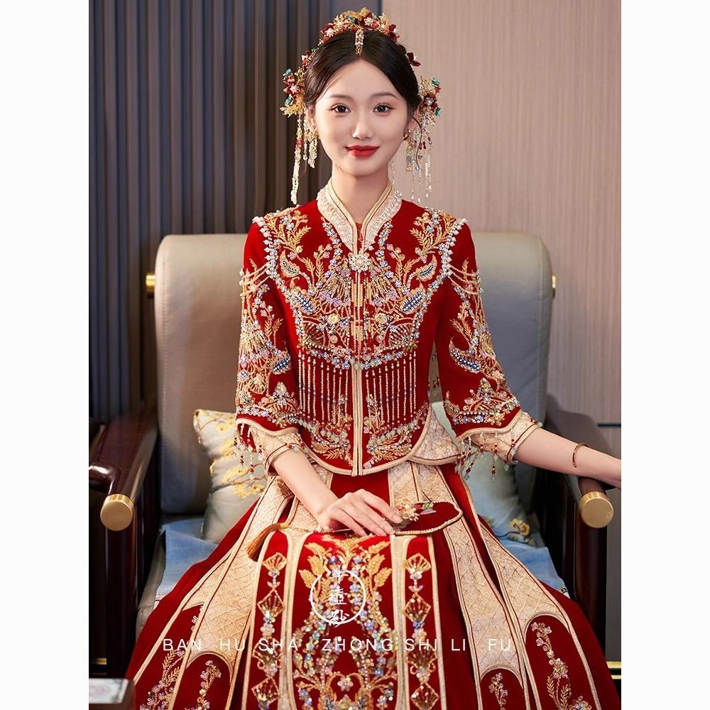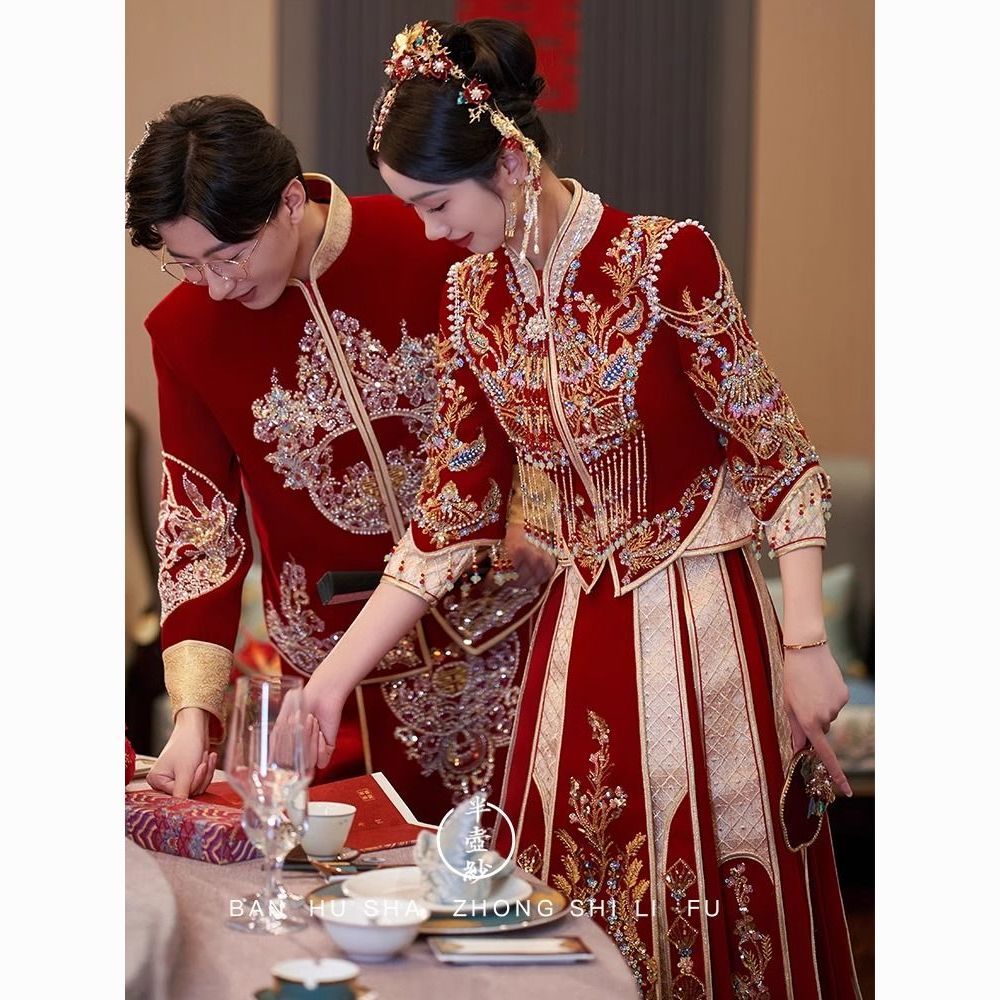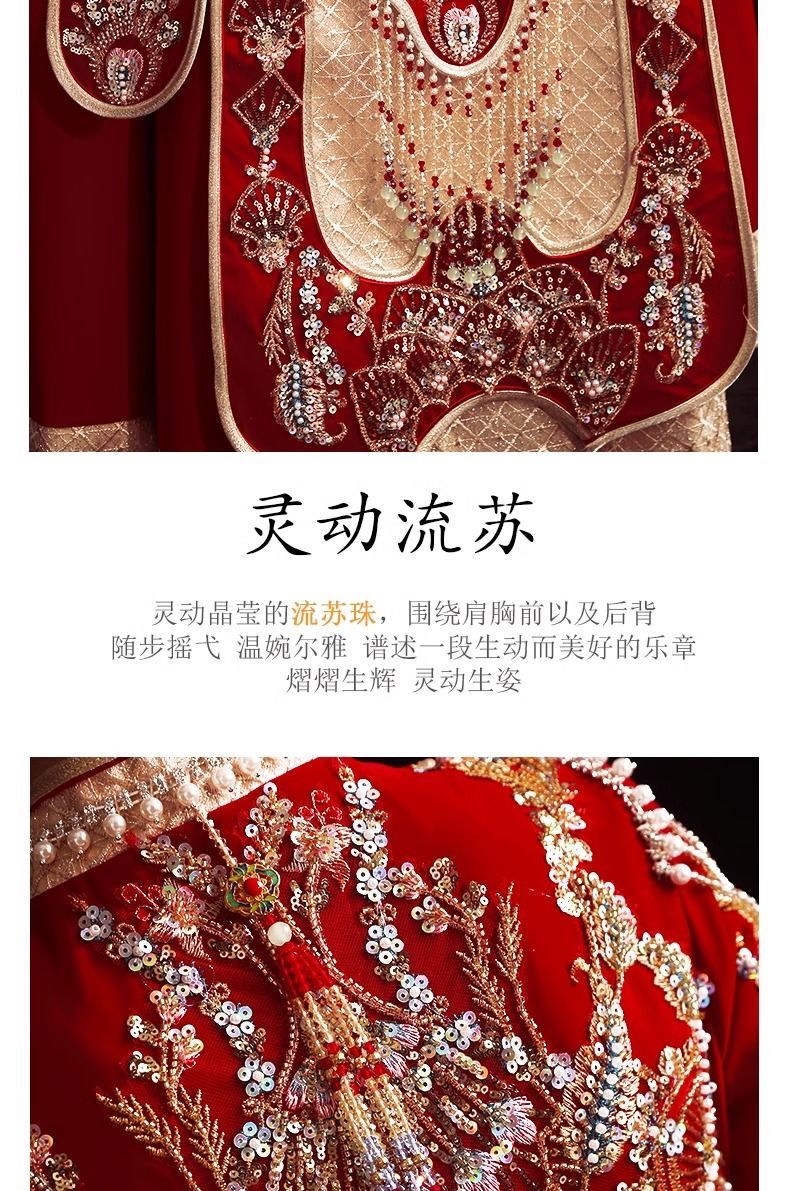 秀禾服低领2024新款新娘情侣新式结婚礼服修身大裙摆嫁衣丝绒秋冬