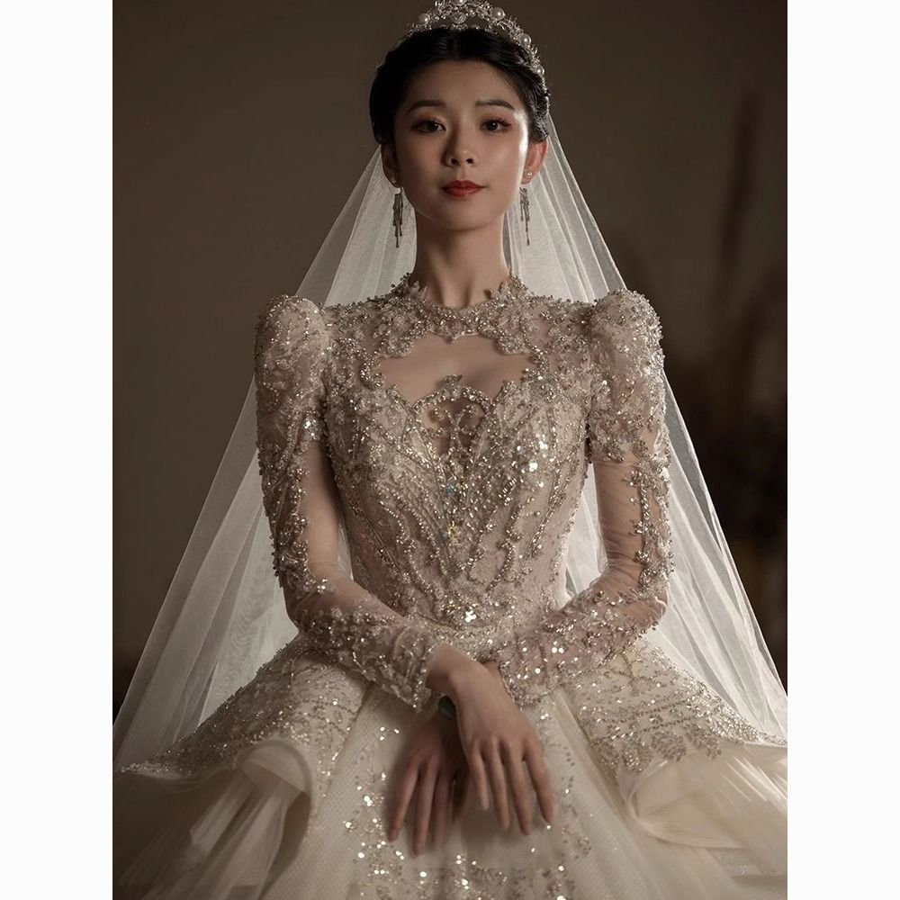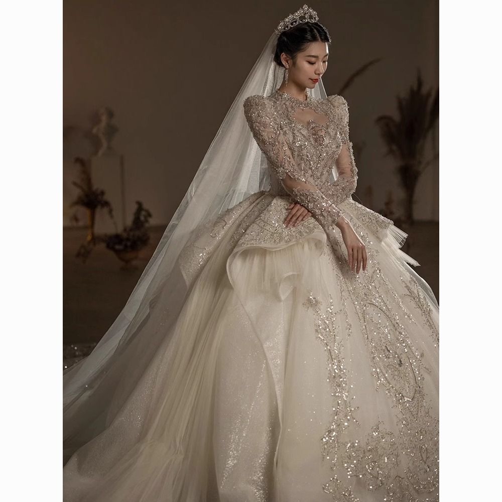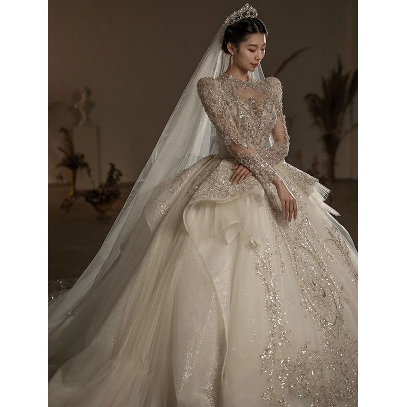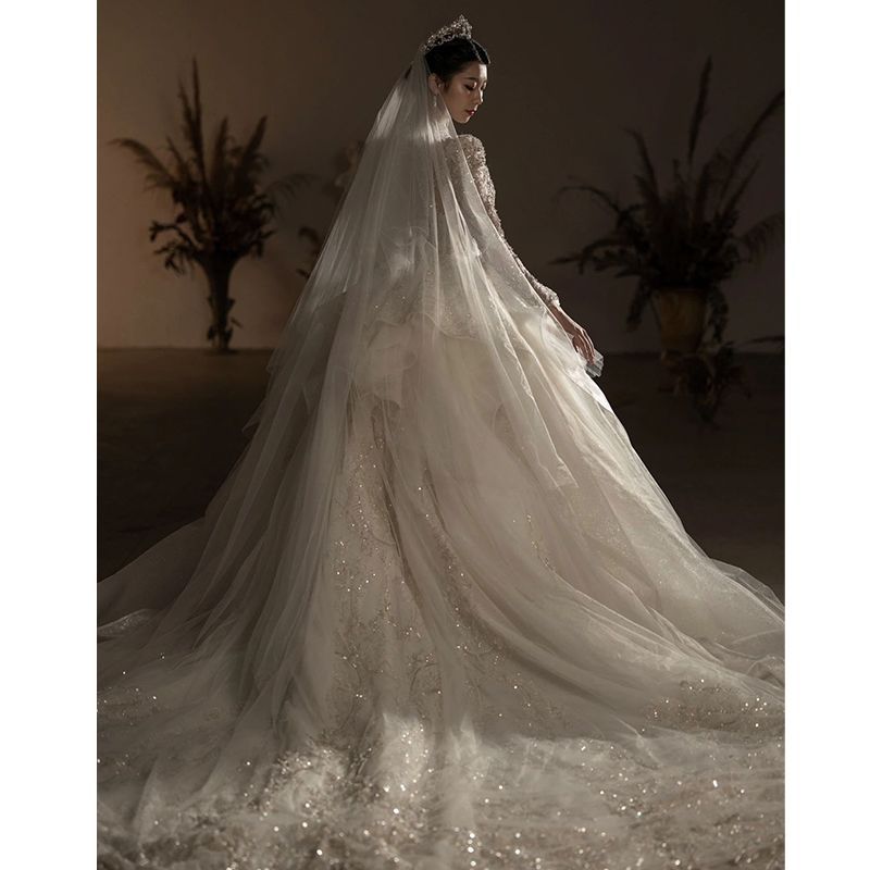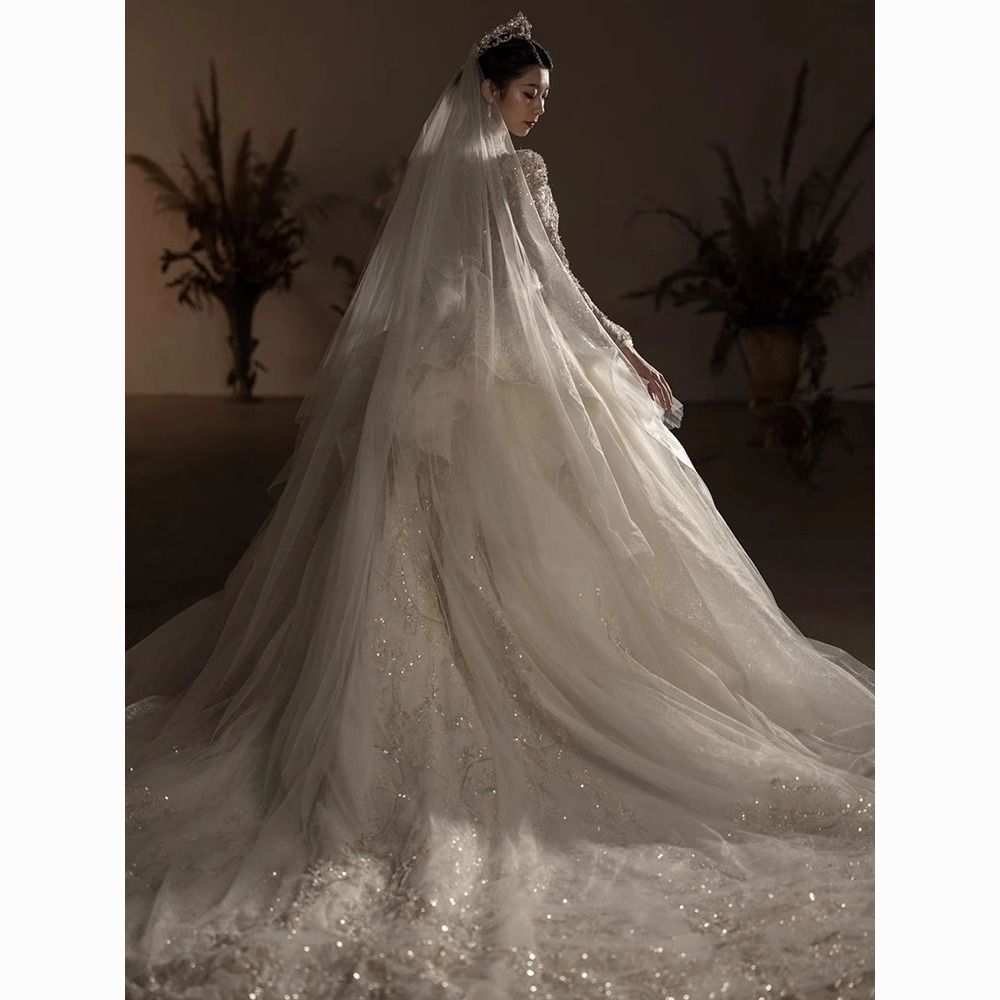 主婚纱2024新款新娘冬季大拖尾婚纱主纱星空小个子法式复古重工女
