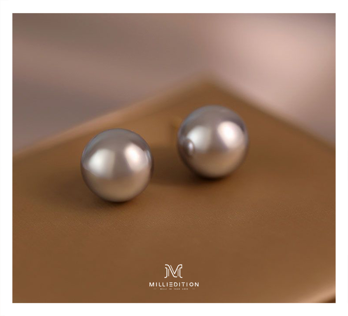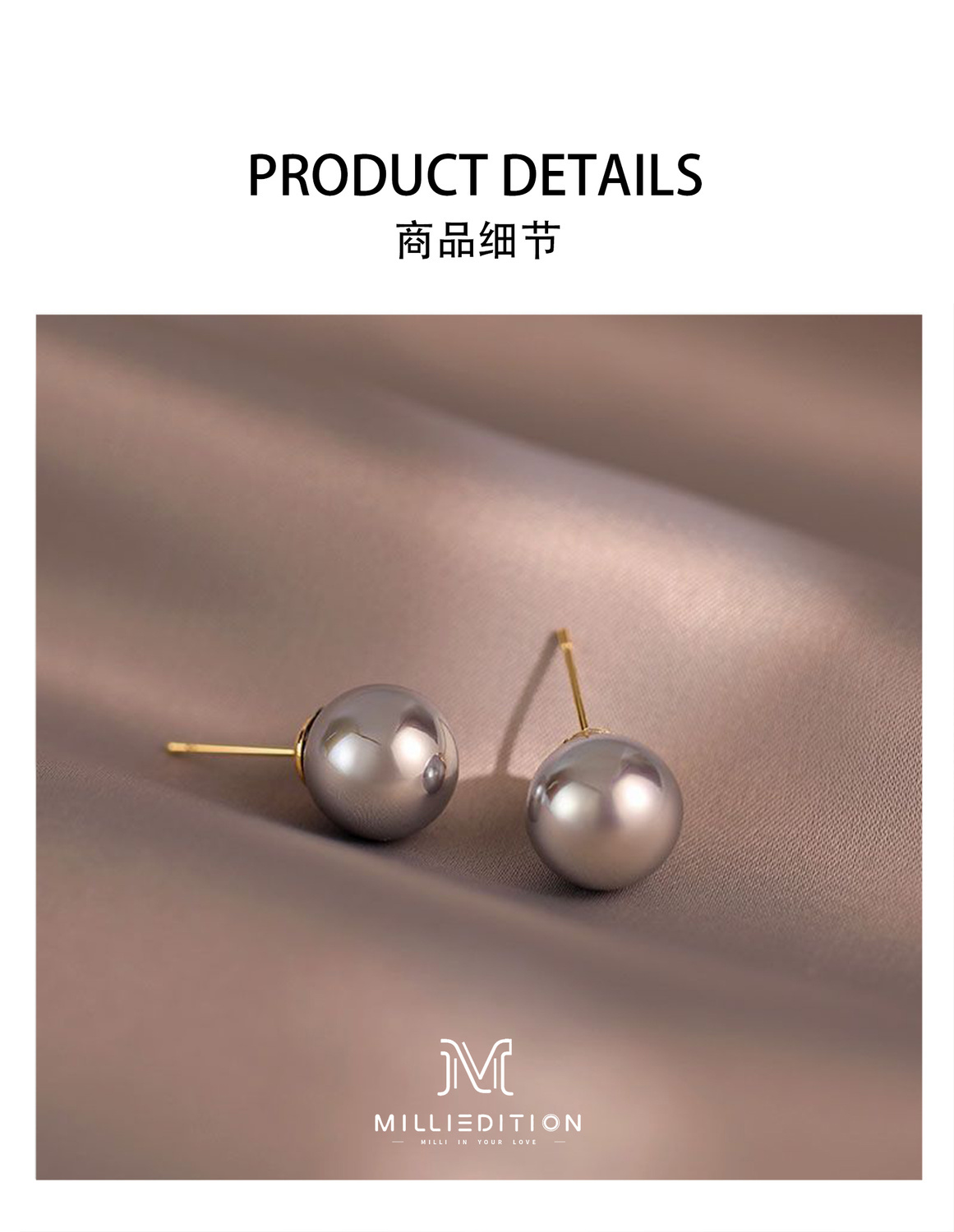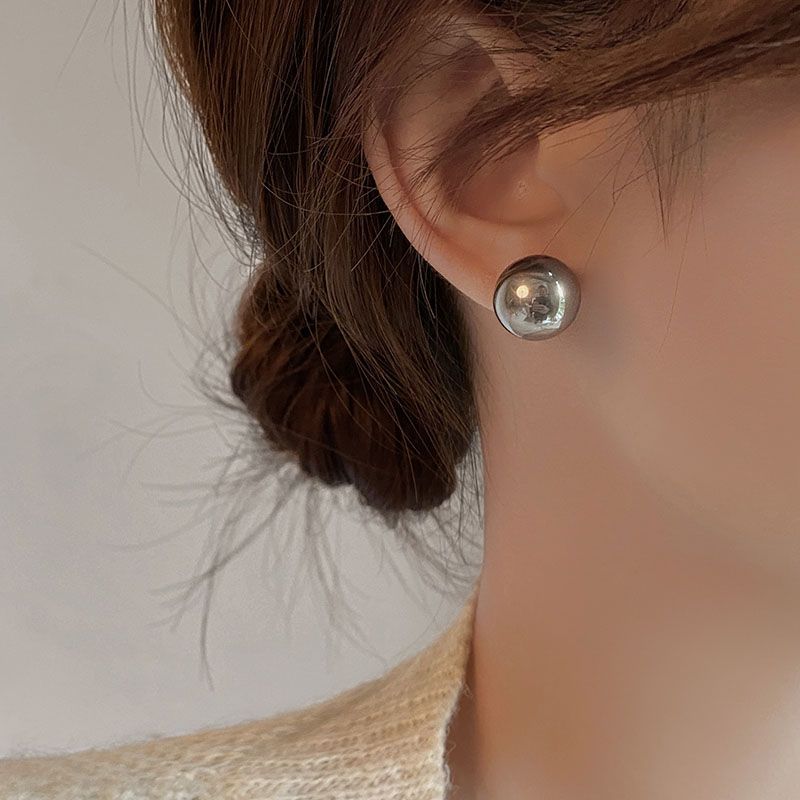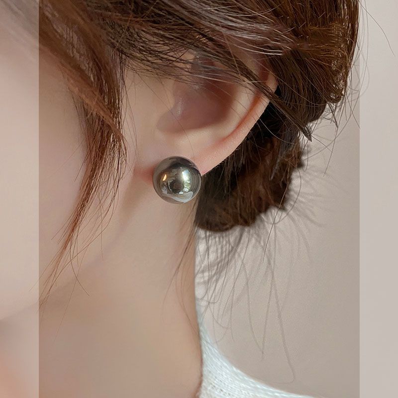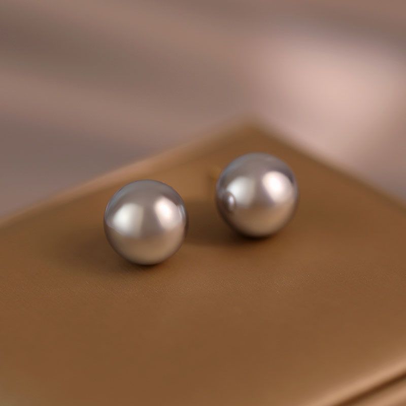 真多麻灰色正圆施家灰珍珠耳钉女925纯银防过敏网红明星同款耳饰