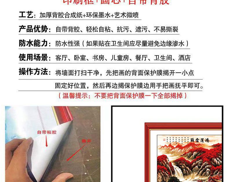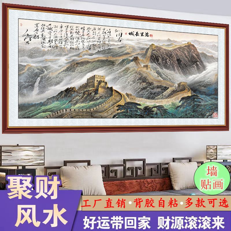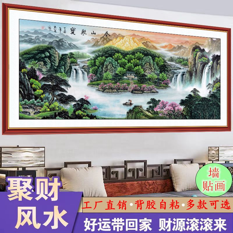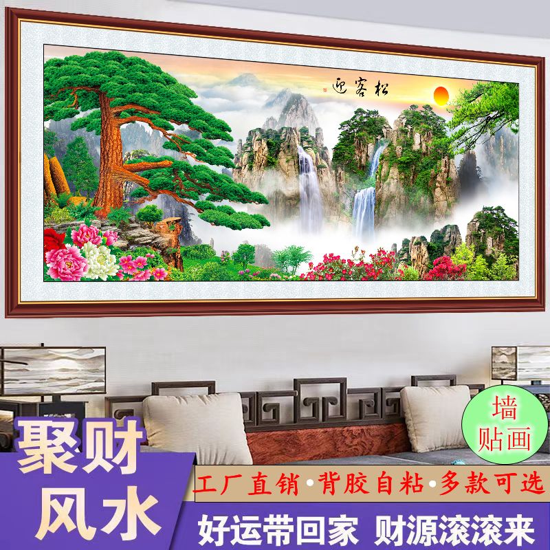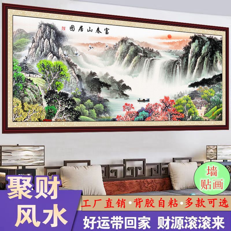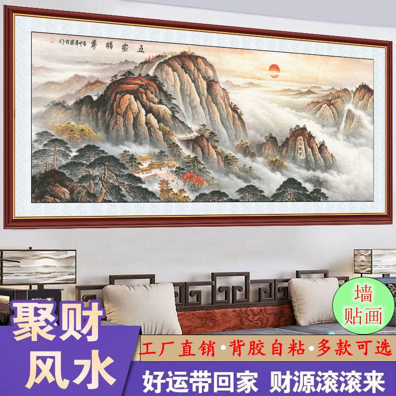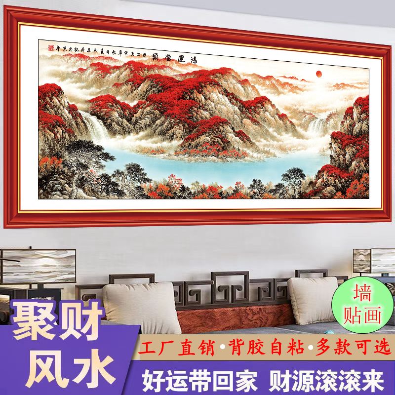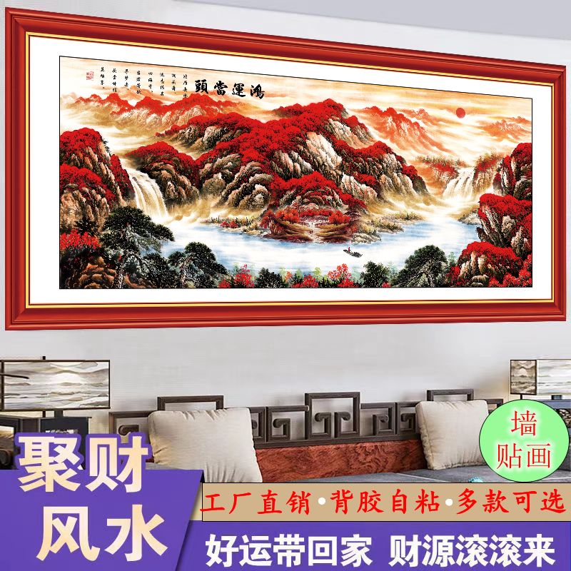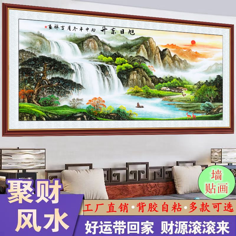 客厅山水画鸿运当头装饰自粘画旭日东升国画办公室沙发背景墙粘画