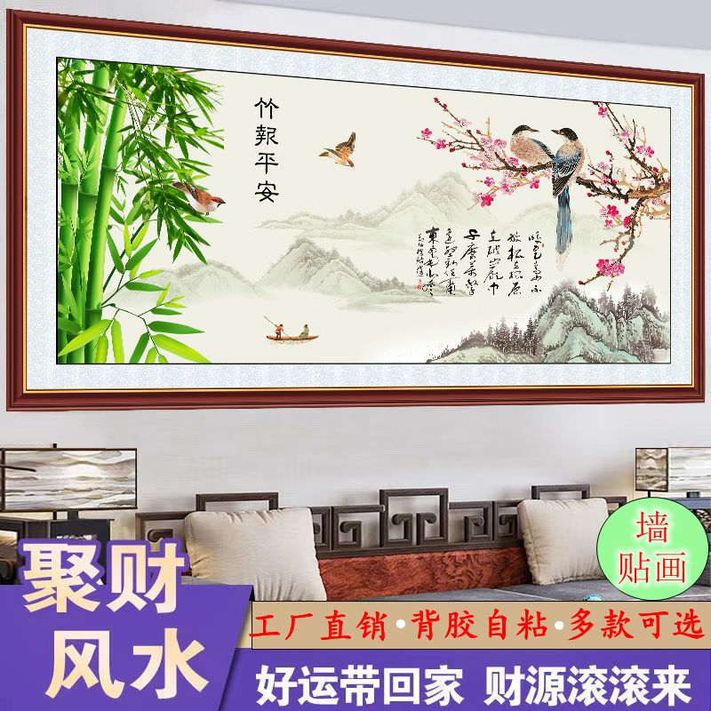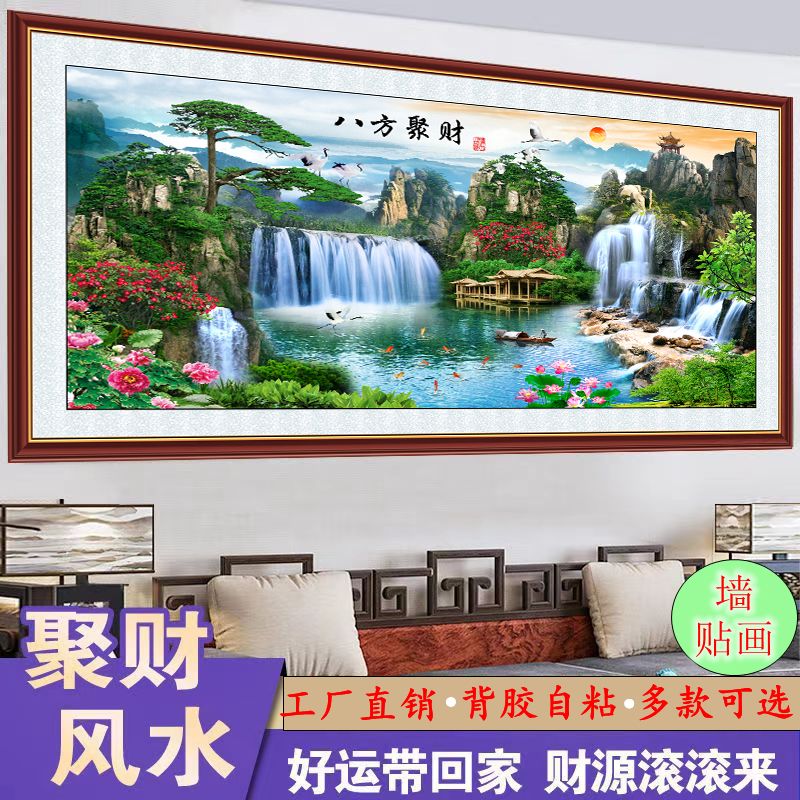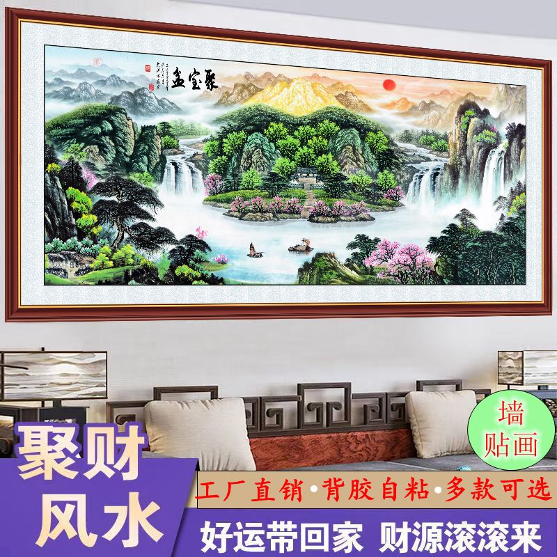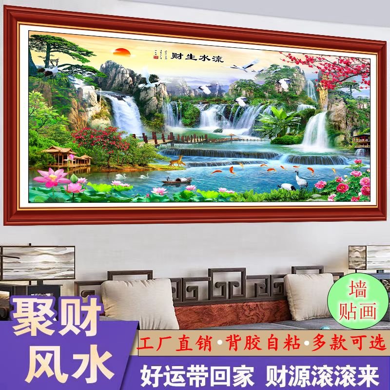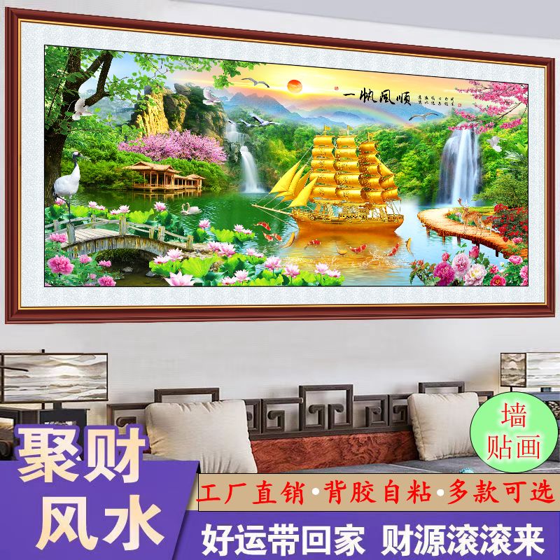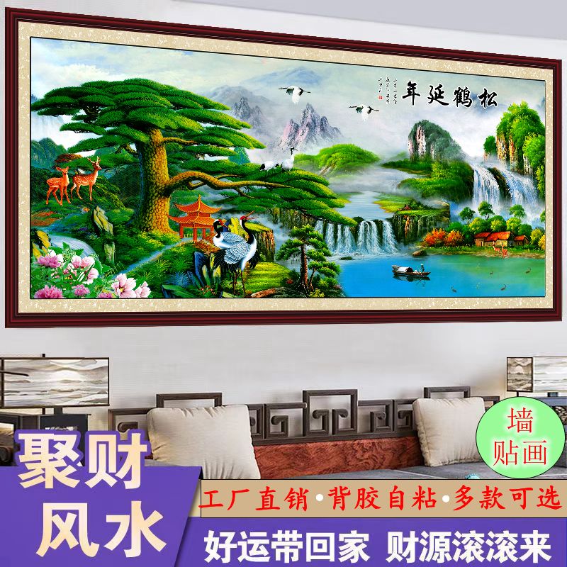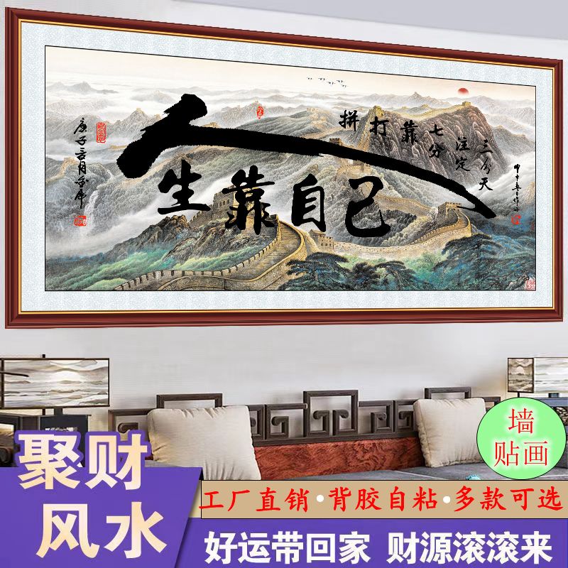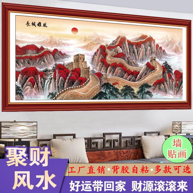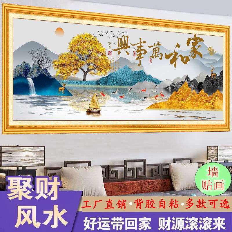 客厅山水画鸿运当头装饰自粘画旭日东升国画办公室沙发背景墙粘画