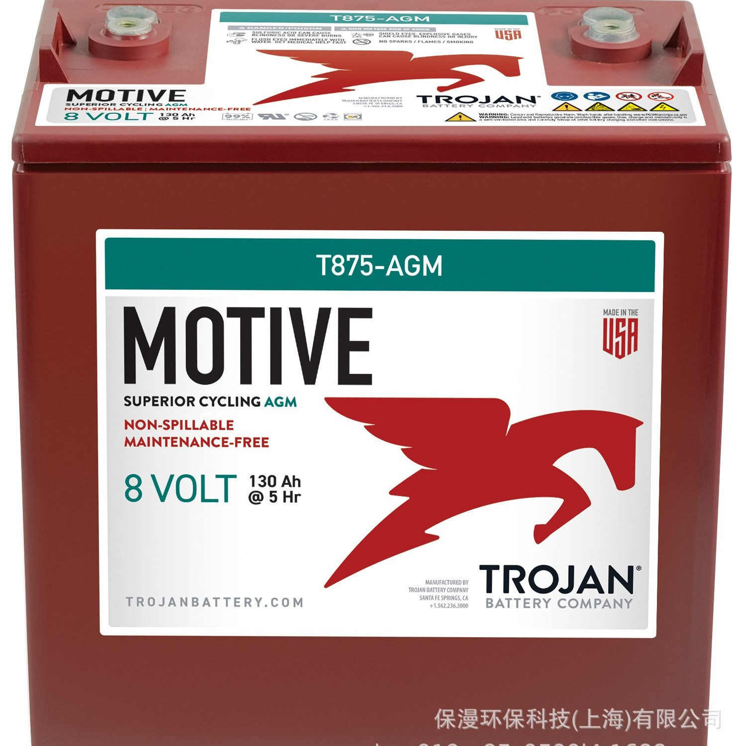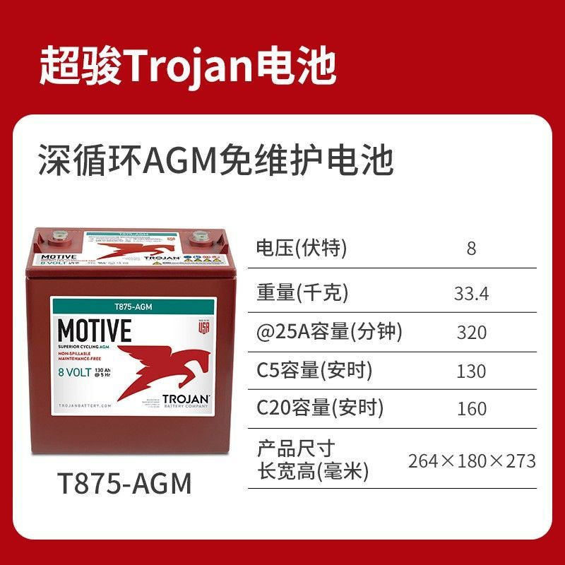 超骏Trojan邱健铅酸电池T875-AGM 8V160AH免维护蓄电池组洗地机用