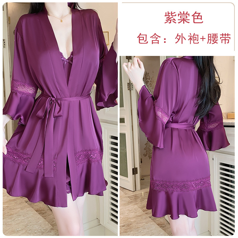 瑰若性感内衣冰丝睡衣加胸垫聚拢蝴蝶结睡裙外袍家居服套装P3945