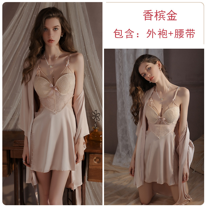 瑰若性感蕾丝透视诱惑钢圈聚拢睡衣露背胸垫吊带裙家居服套装2044