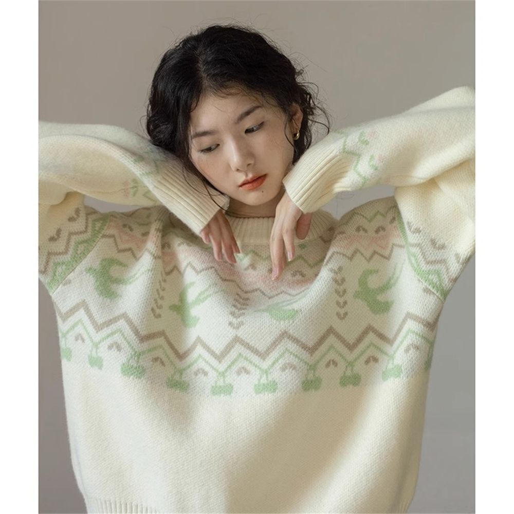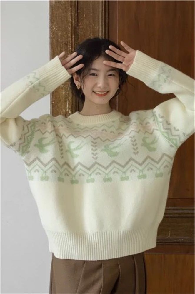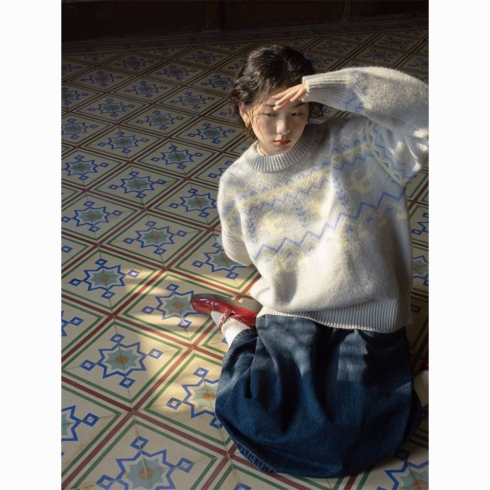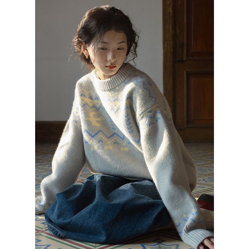 佰加壹法式复古宽松慵懒提花费尔岛毛衣女秋冬浣熊绒针织衫上衣厚