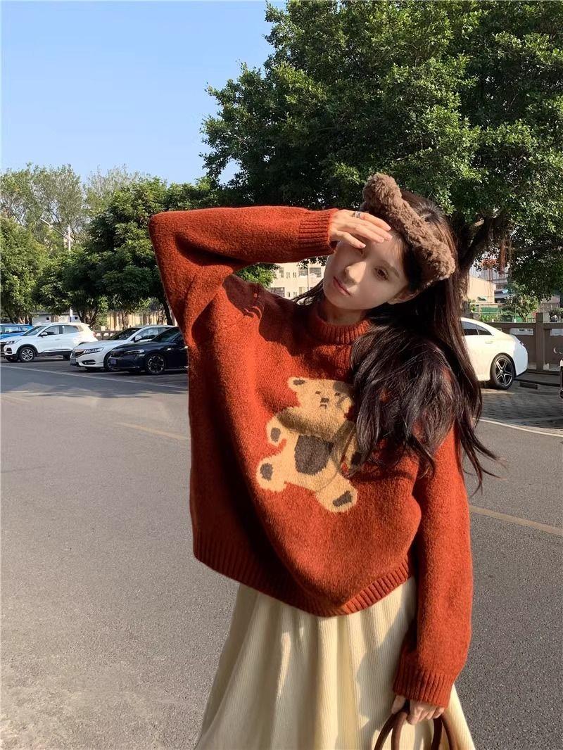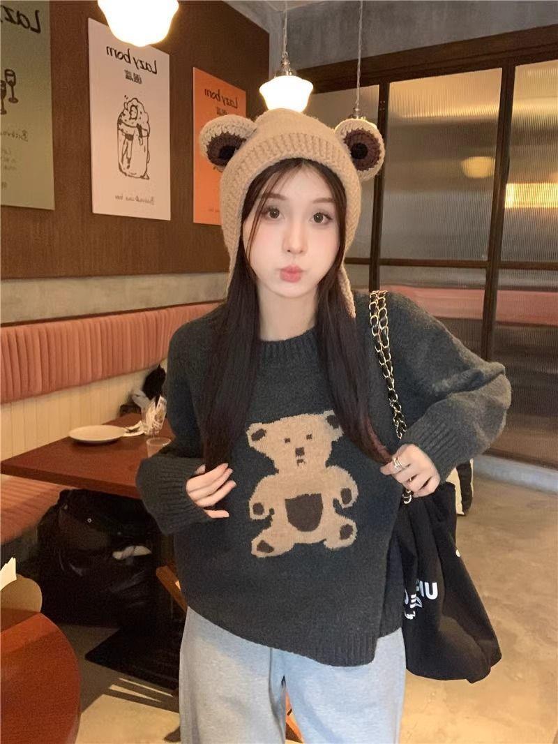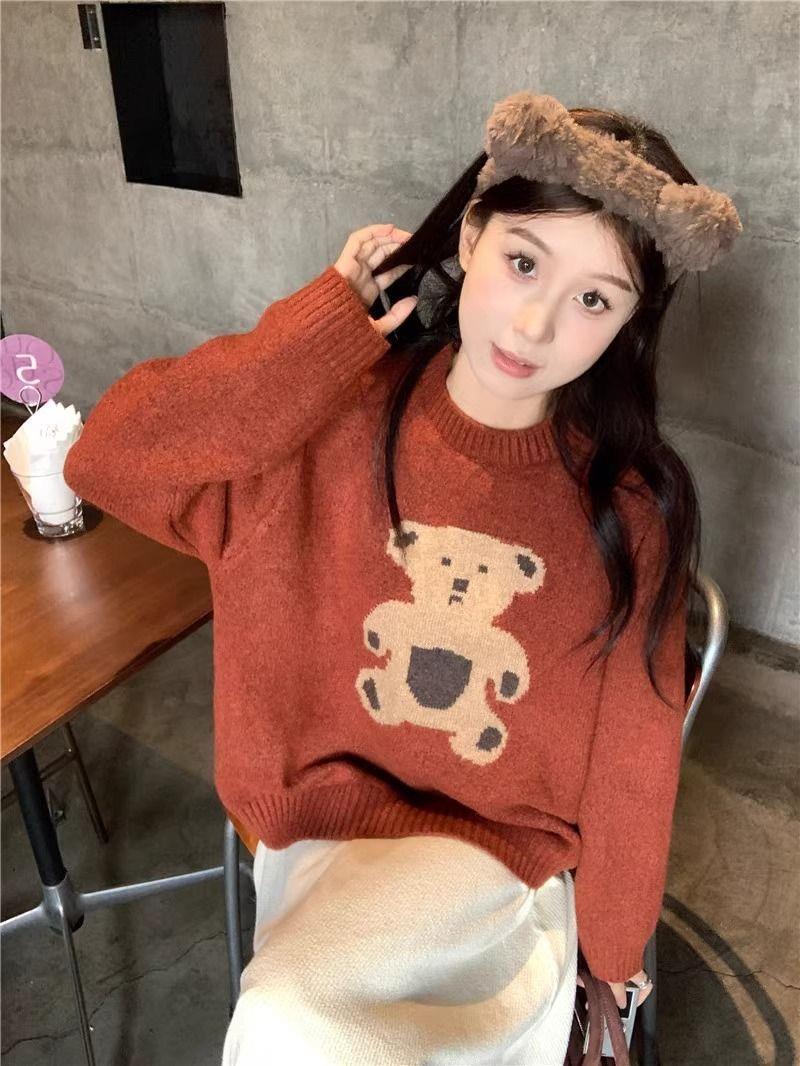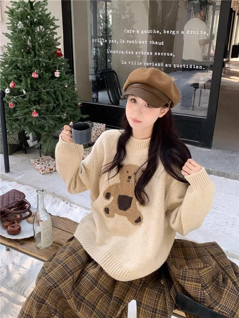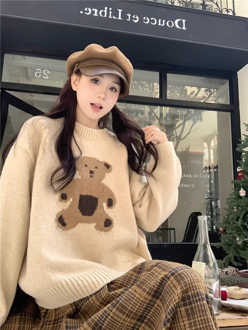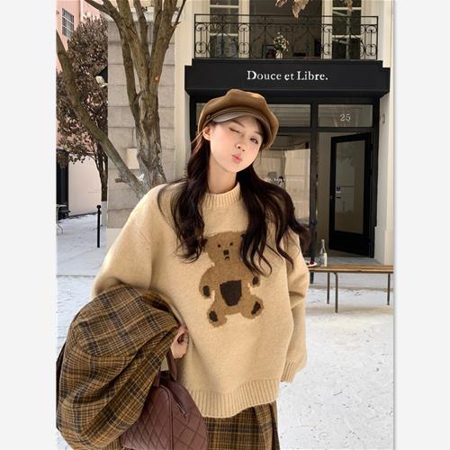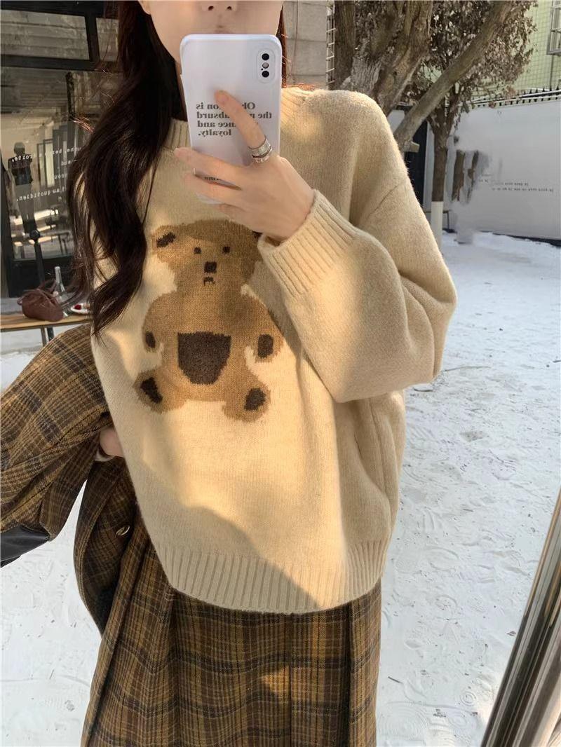 可路莎卡通甜妹~可爱小熊圆领圣诞毛衣秋冬小个子宽松减龄针织衫