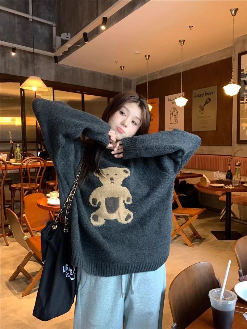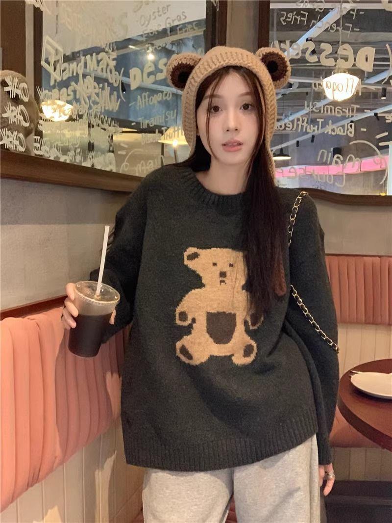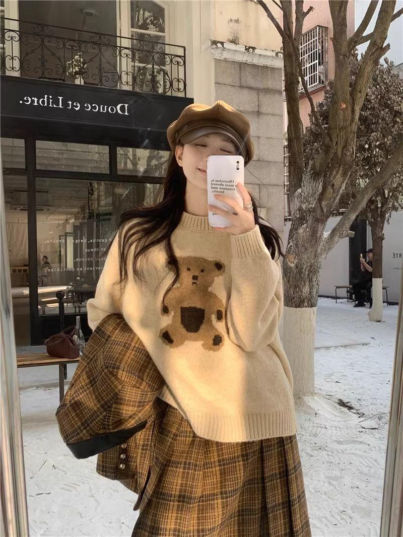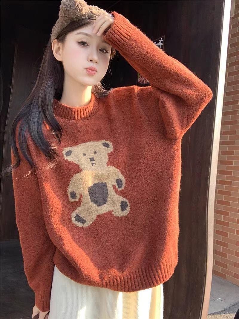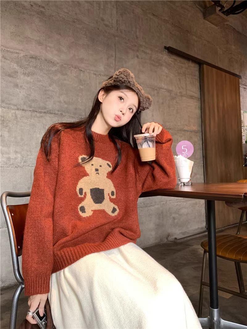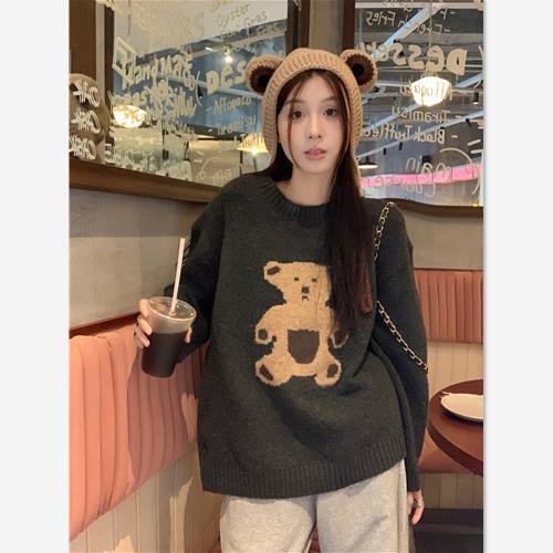 可路莎卡通甜妹~可爱小熊圆领圣诞毛衣秋冬小个子宽松减龄针织衫
