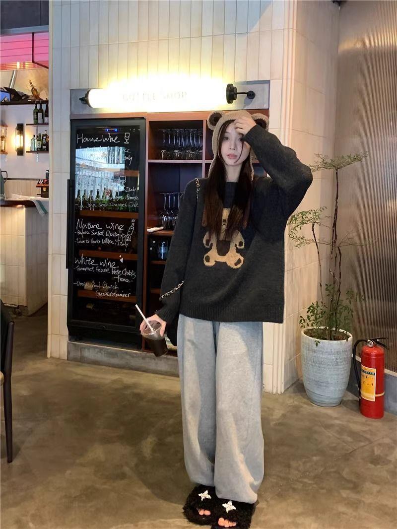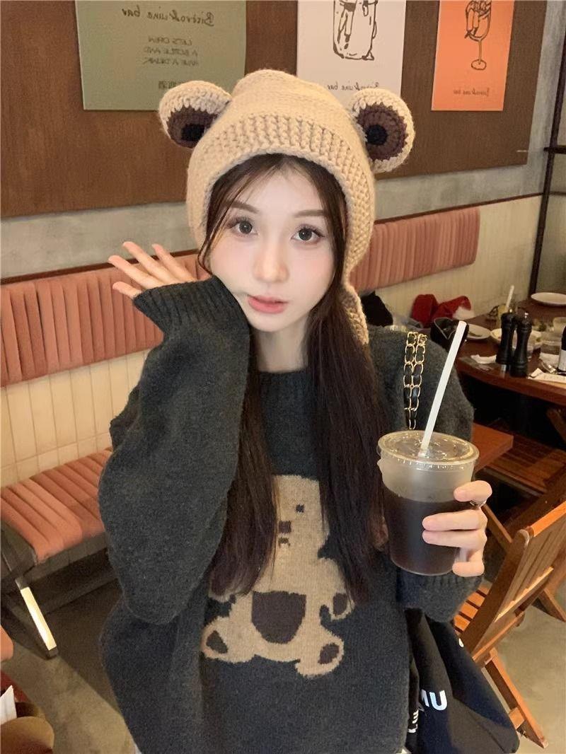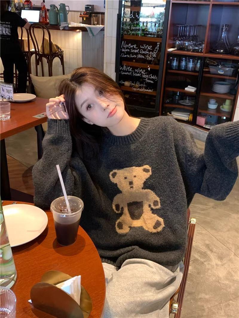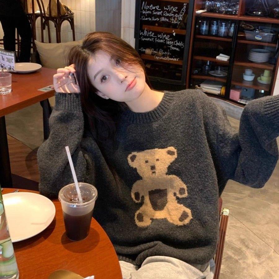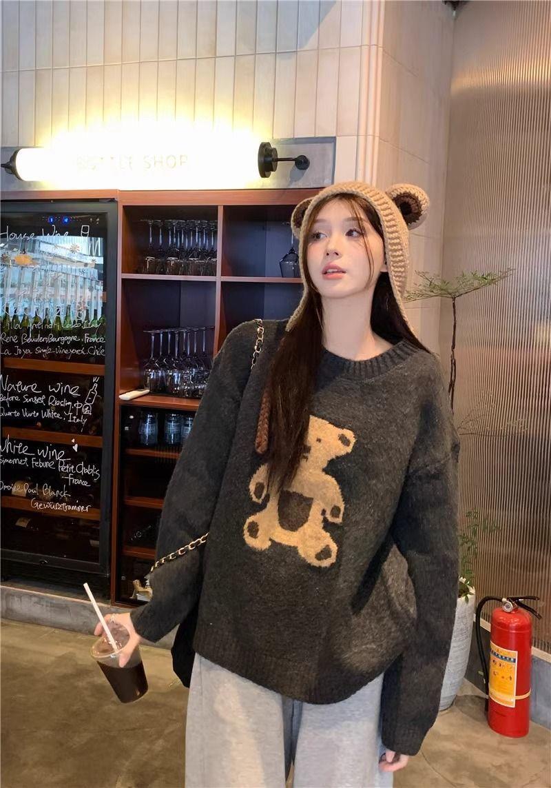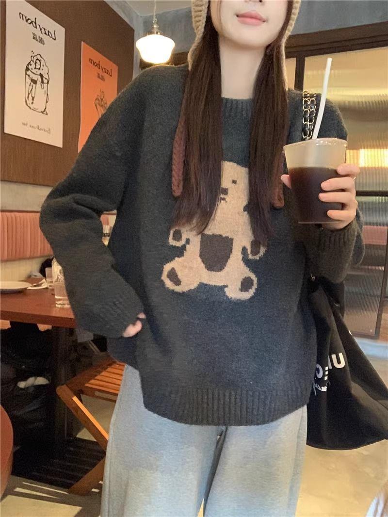 可路莎卡通甜妹~可爱小熊圆领圣诞毛衣秋冬小个子宽松减龄针织衫