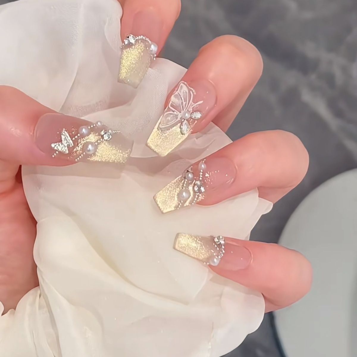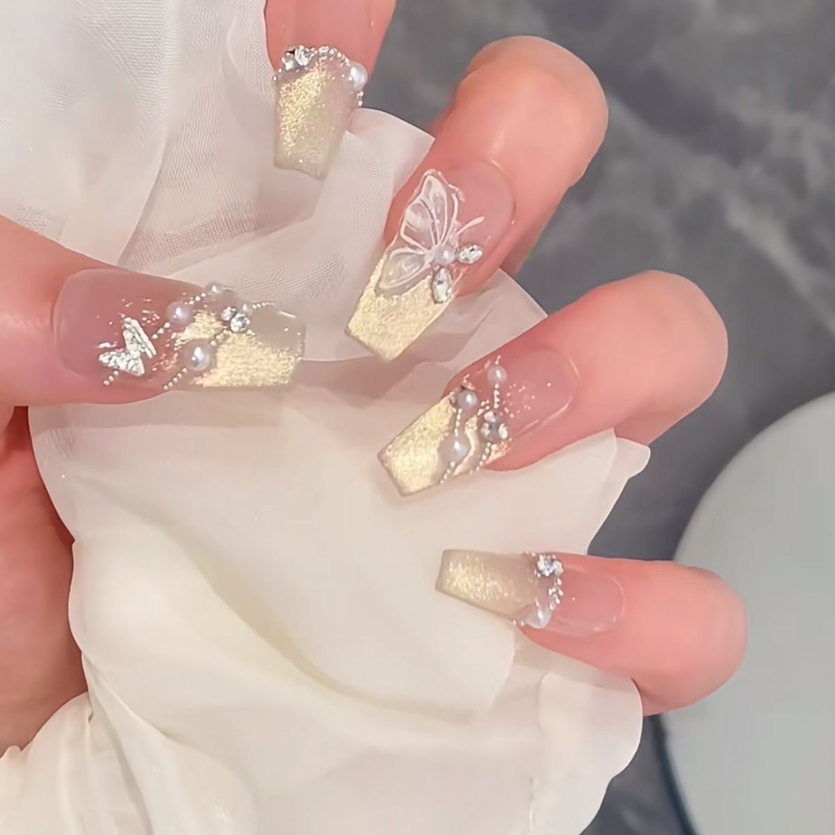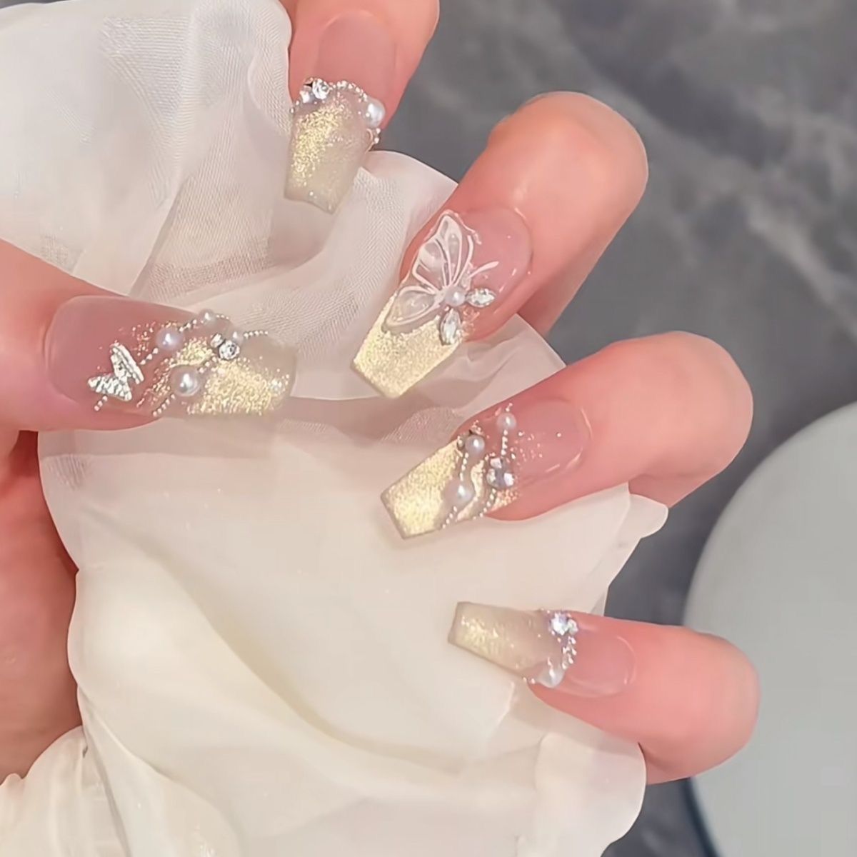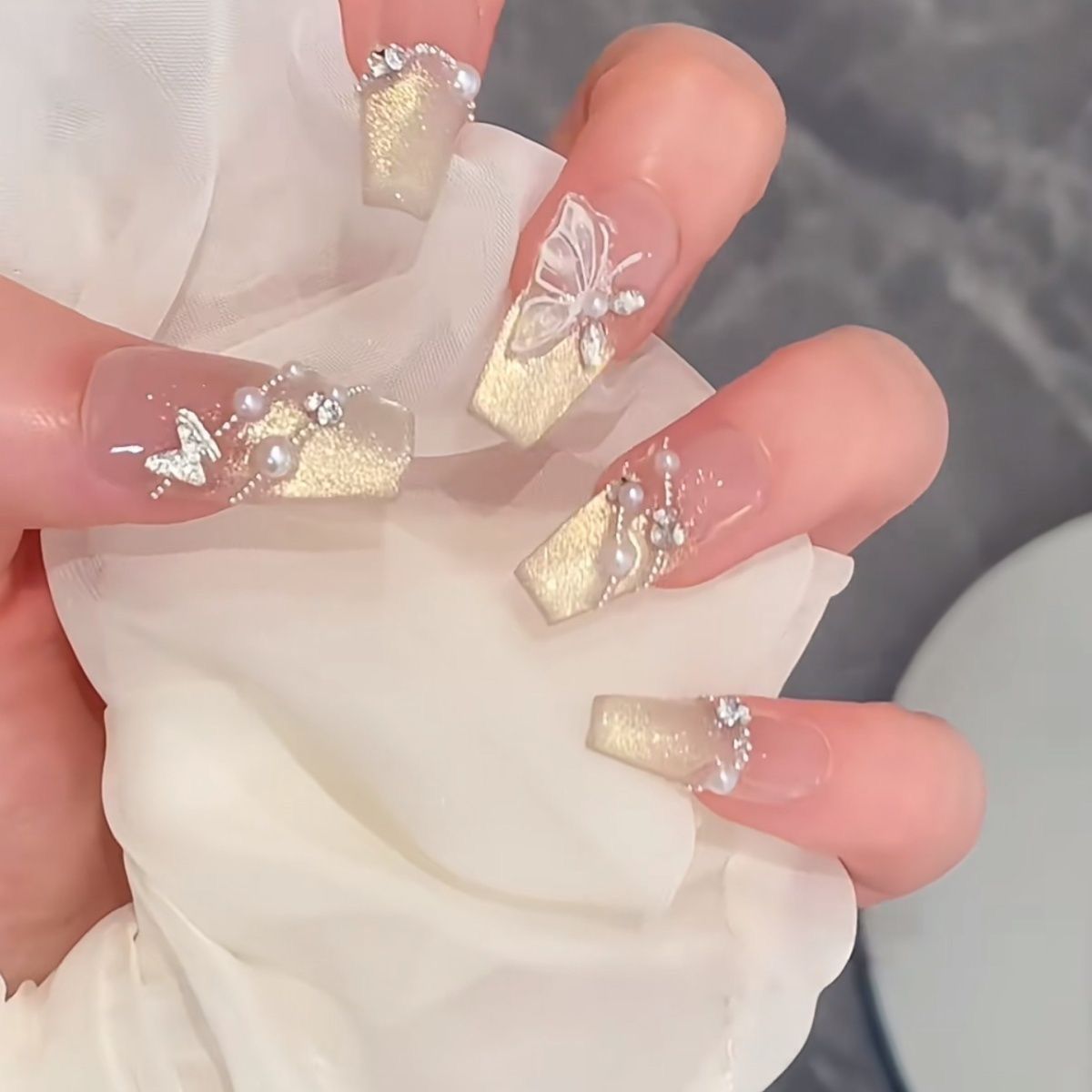 纯手工美甲穿戴甲金光秋冬新款气质高级爆闪蝴蝶猫眼假指甲贴片