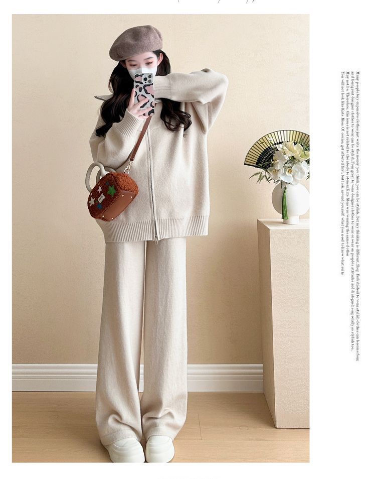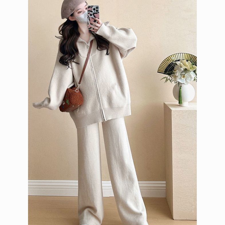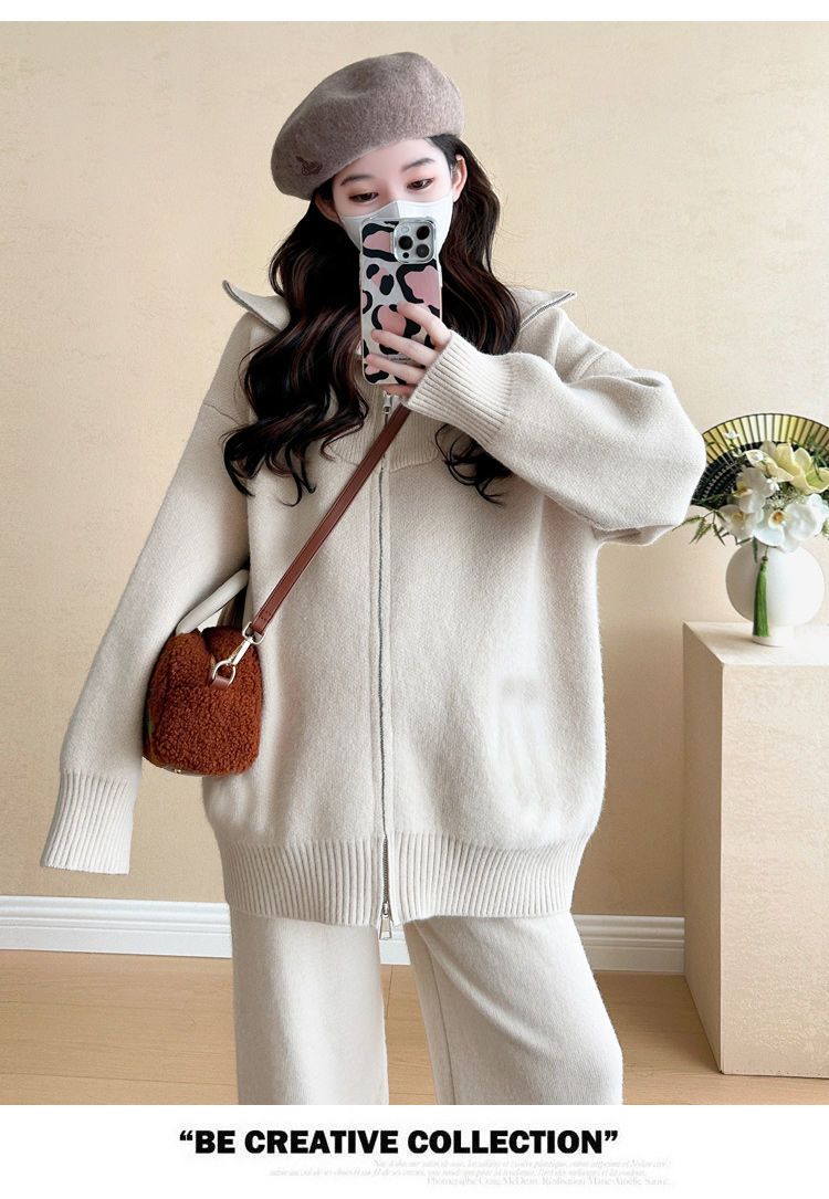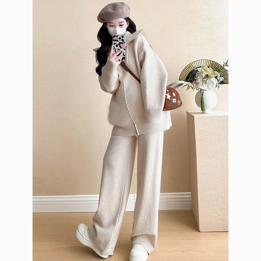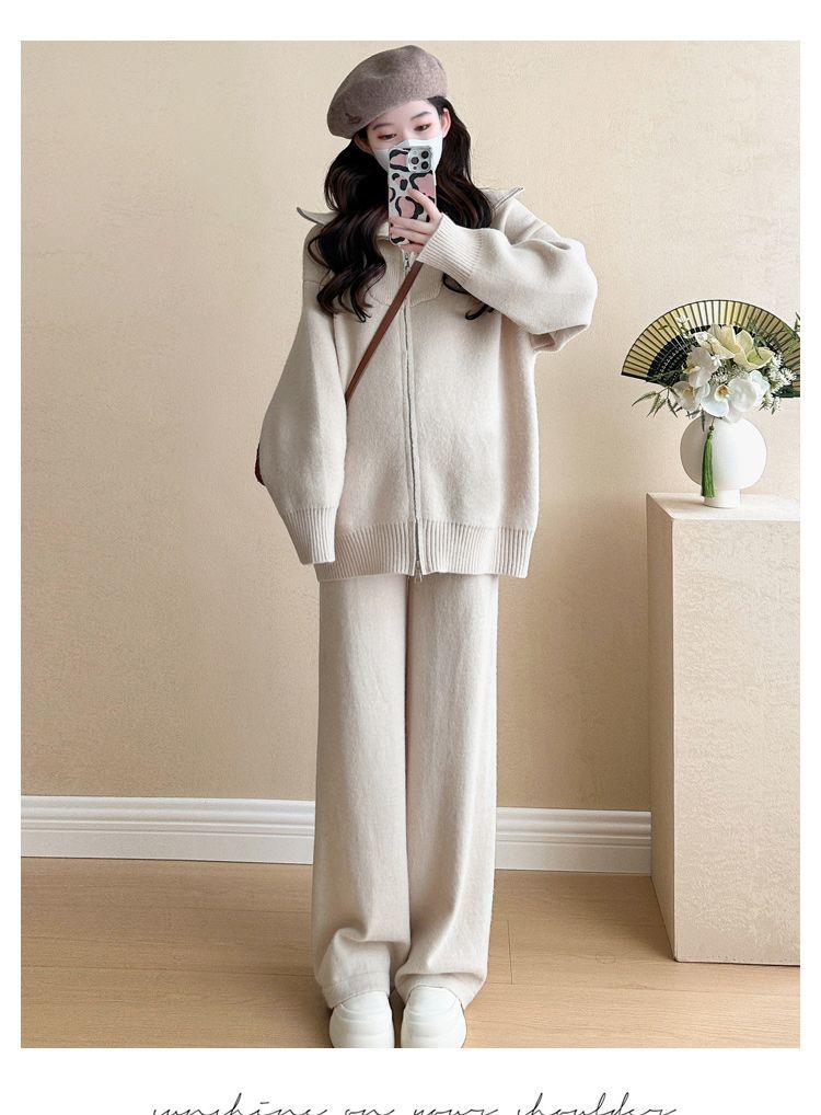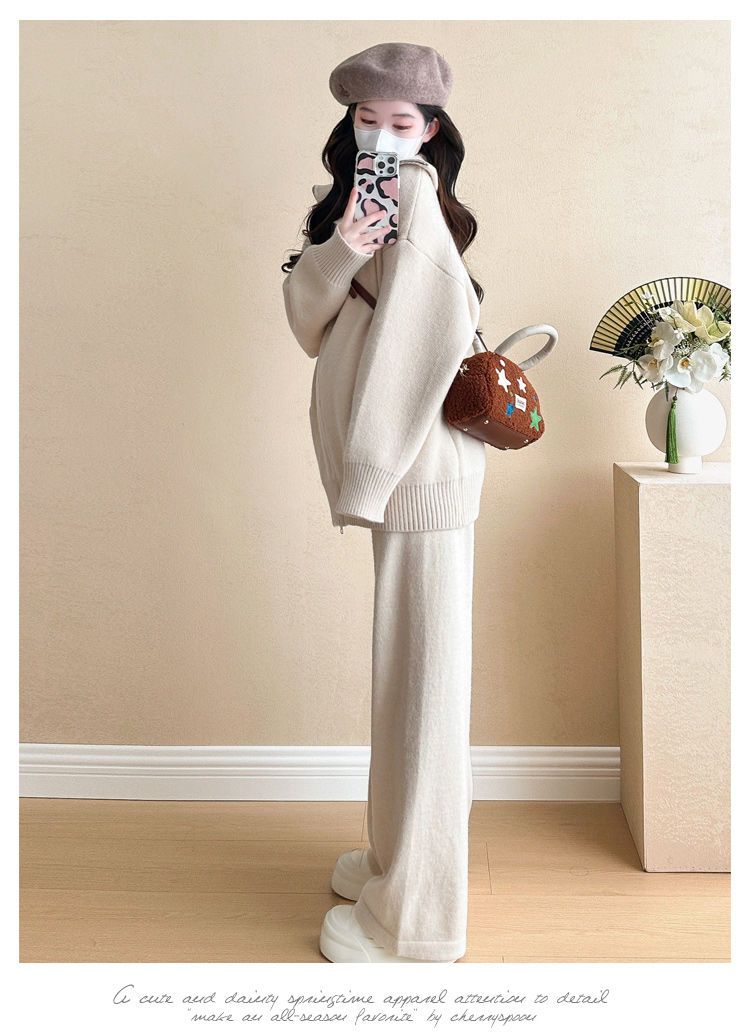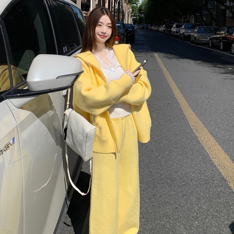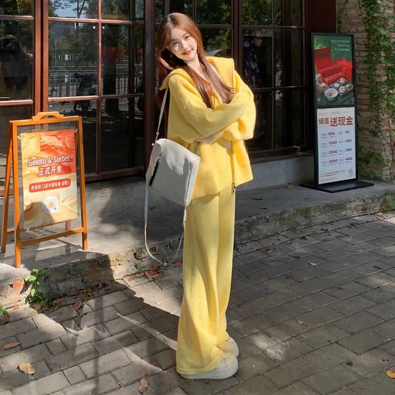 松弛感穿搭套装黄色宽松毛衣开衫外套女秋冬新款休闲阔腿裤两件套