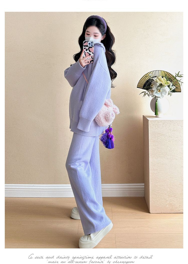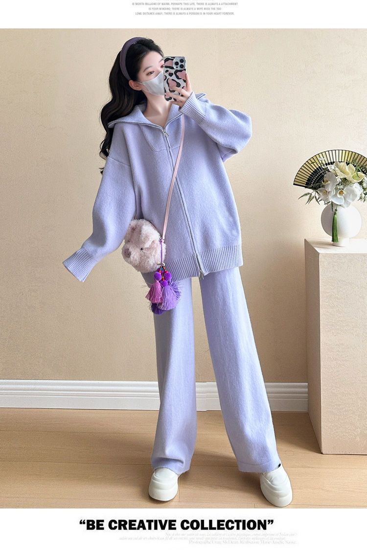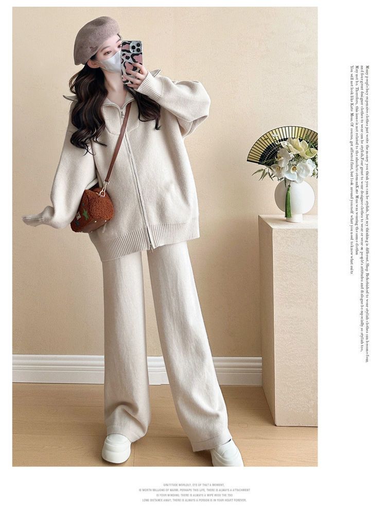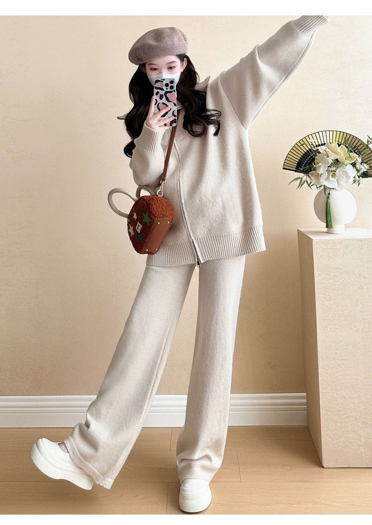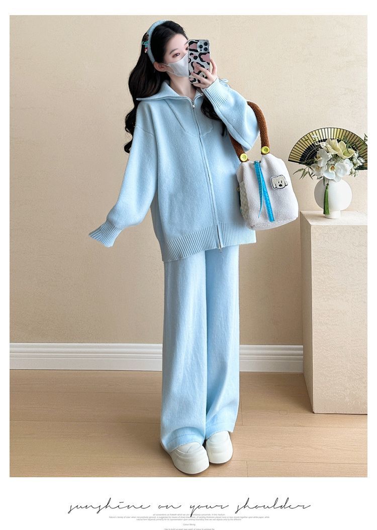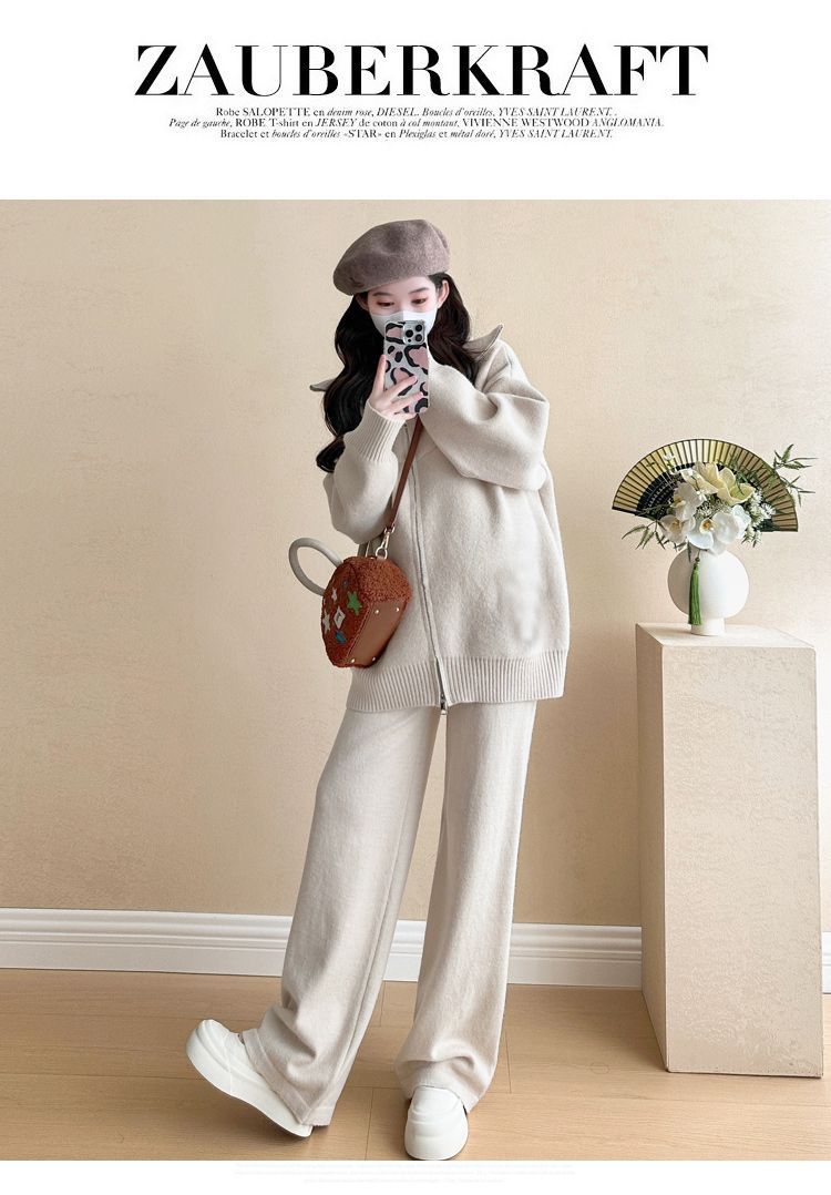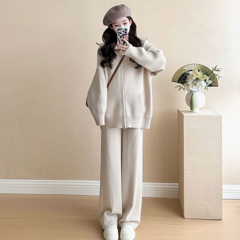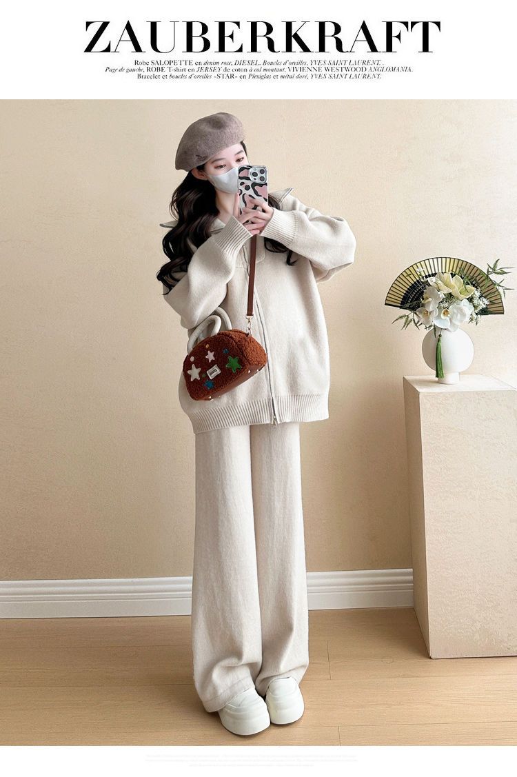 松弛感穿搭套装黄色宽松毛衣开衫外套女秋冬新款休闲阔腿裤两件套