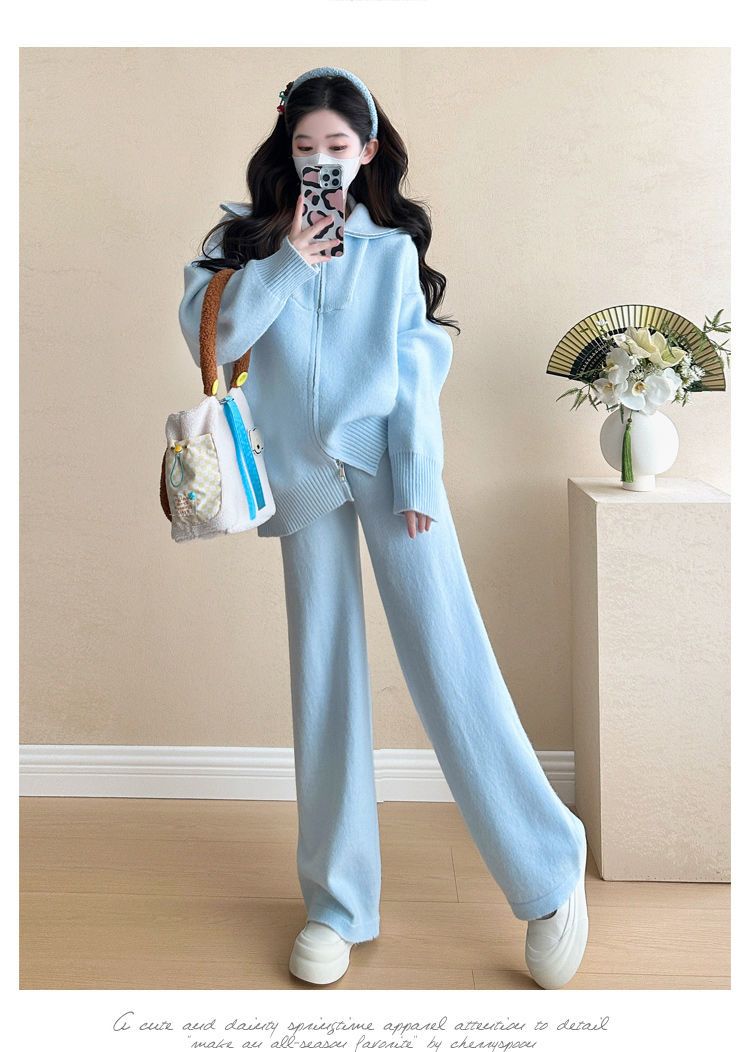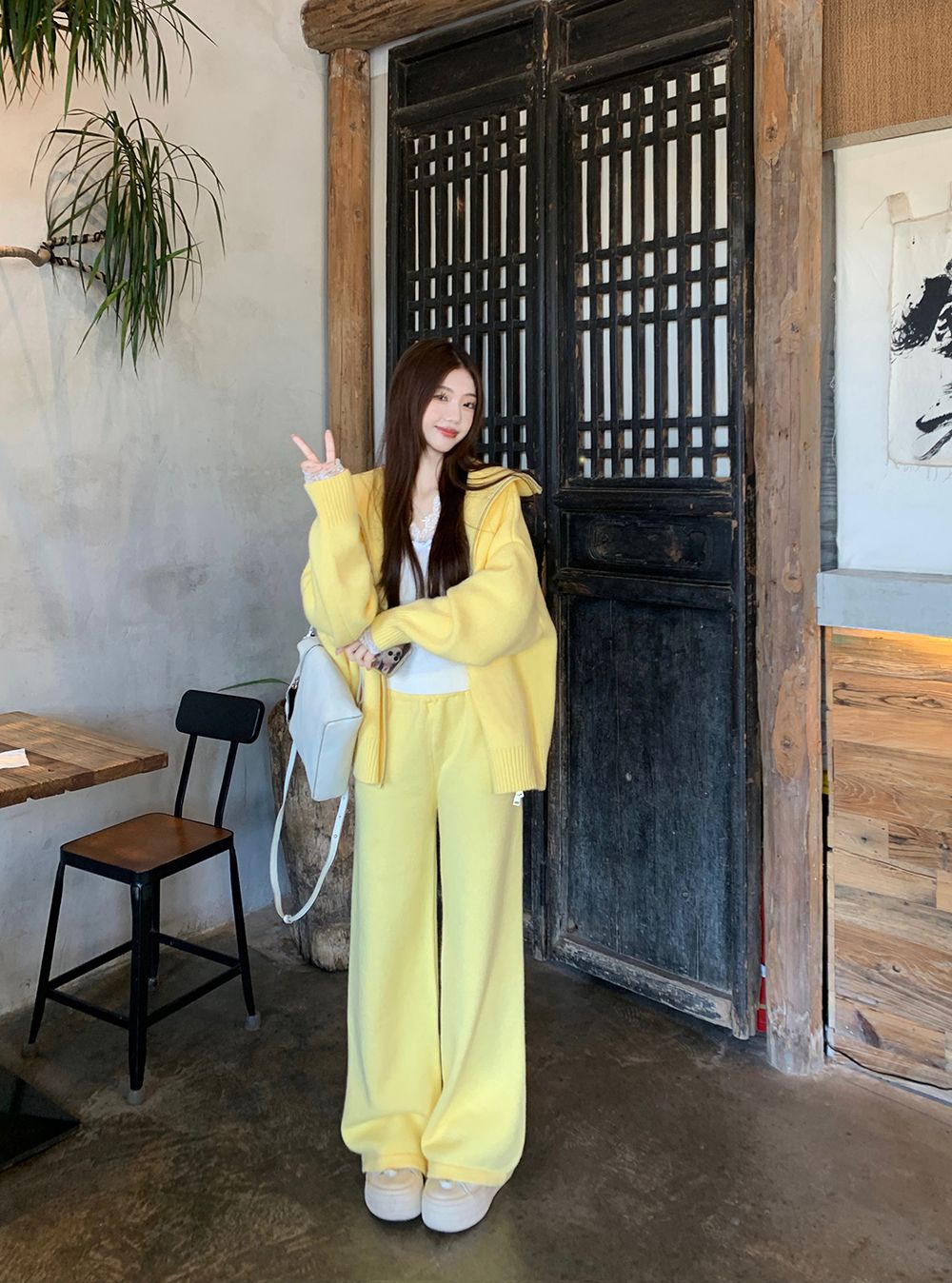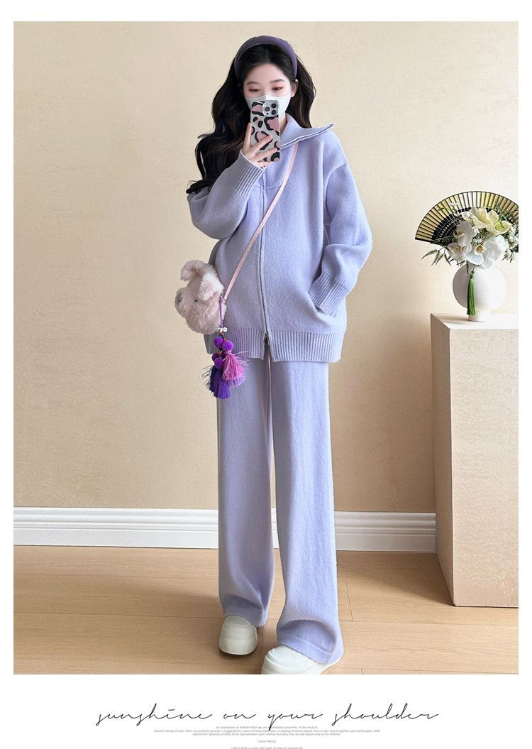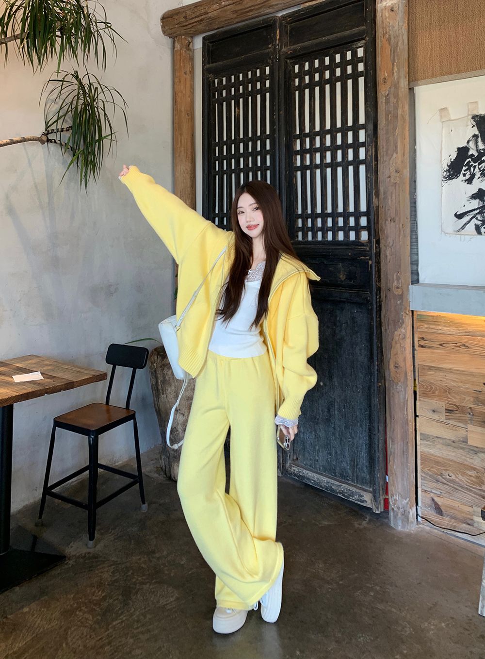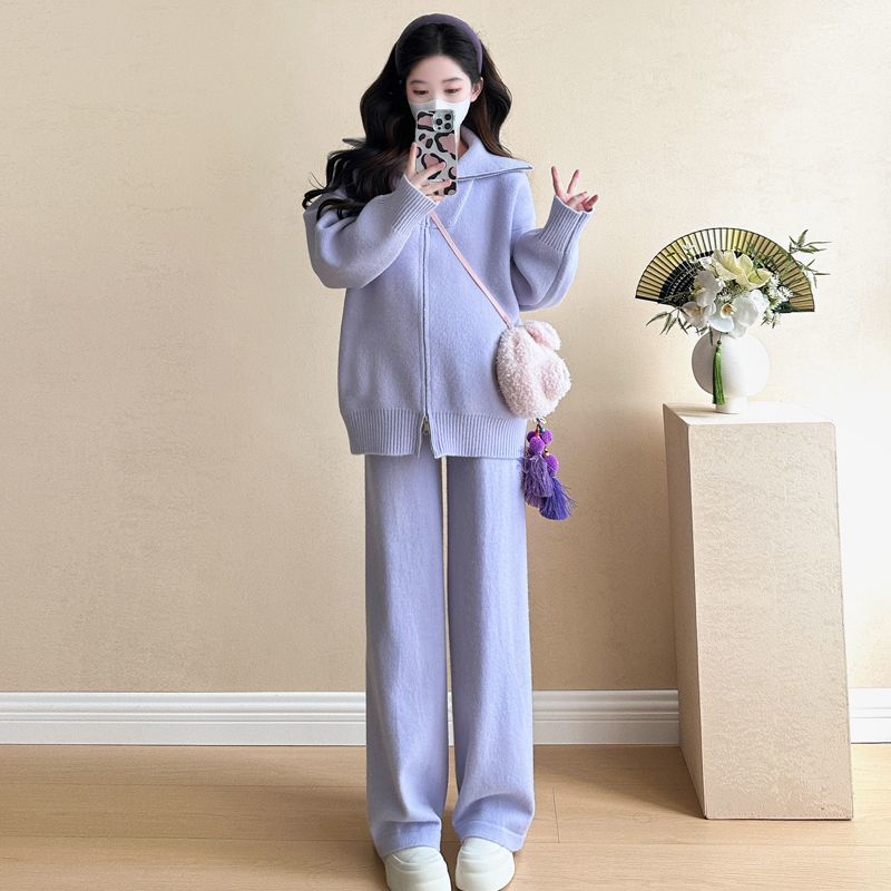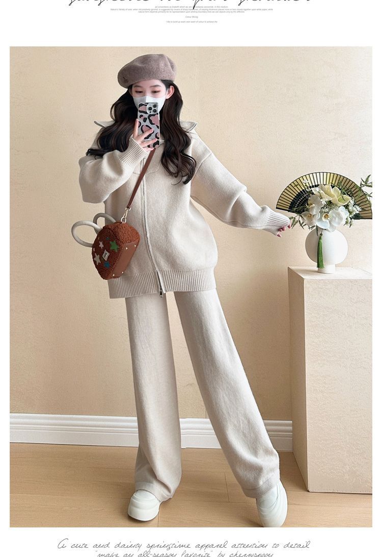 松弛感穿搭套装黄色宽松毛衣开衫外套女秋冬新款休闲阔腿裤两件套