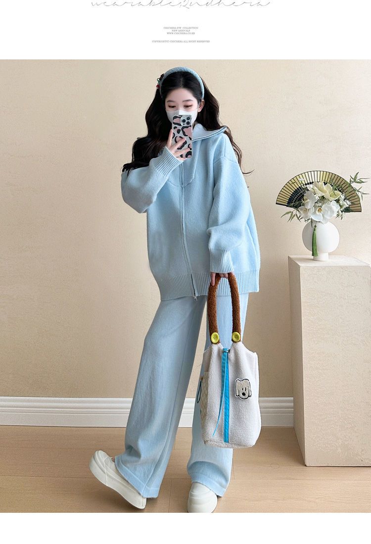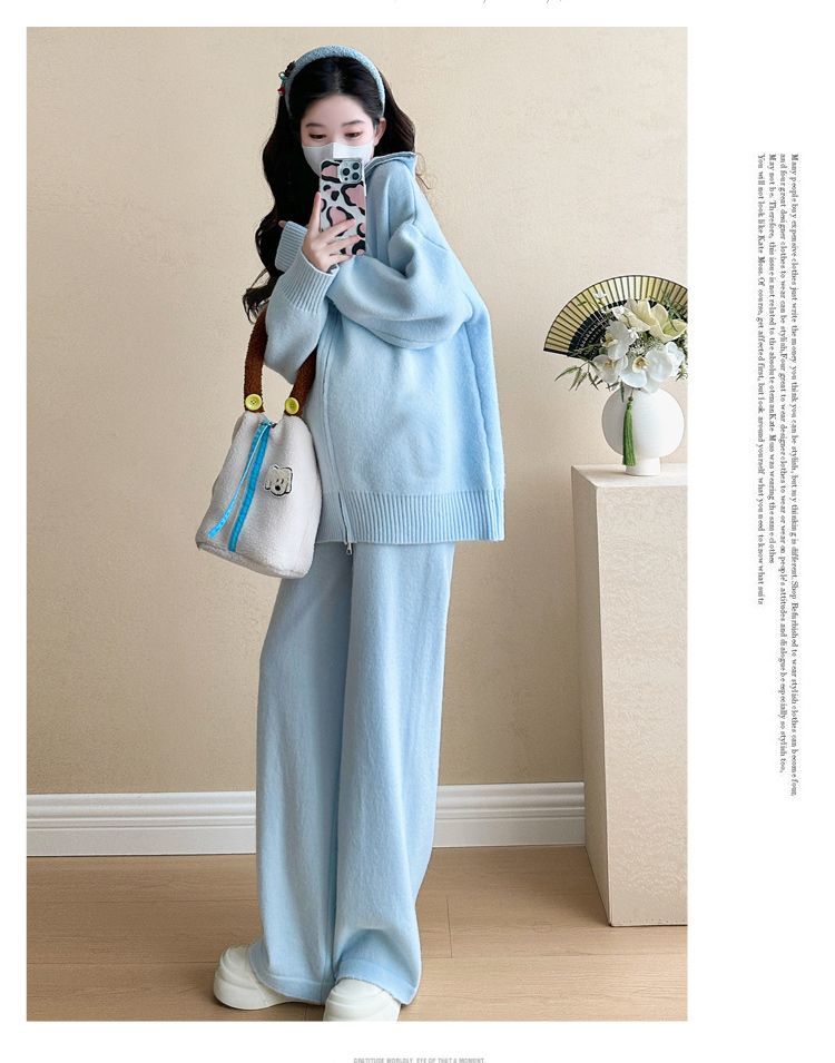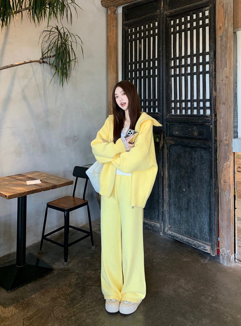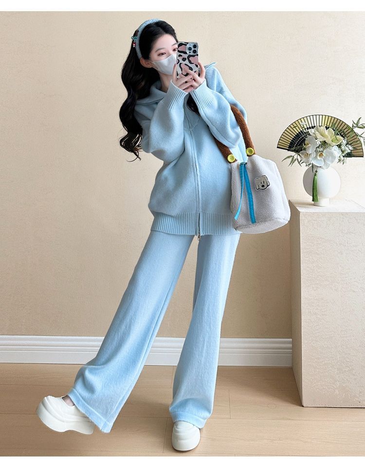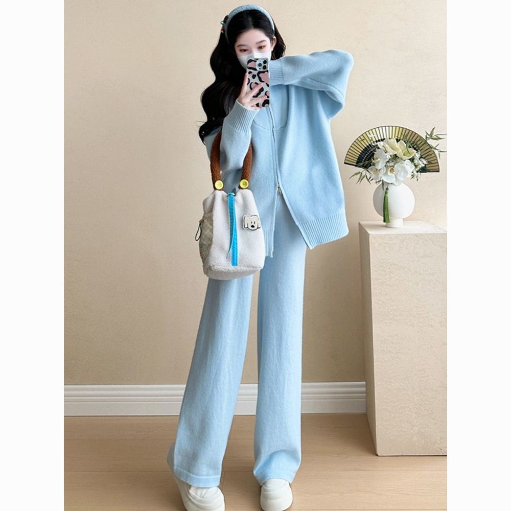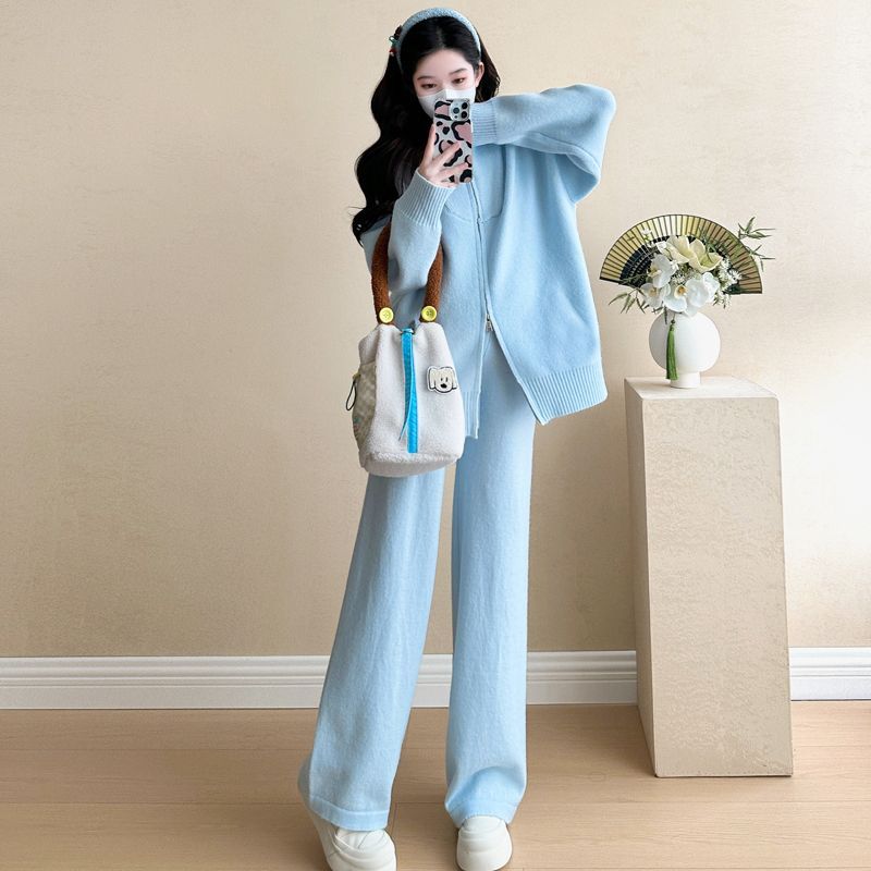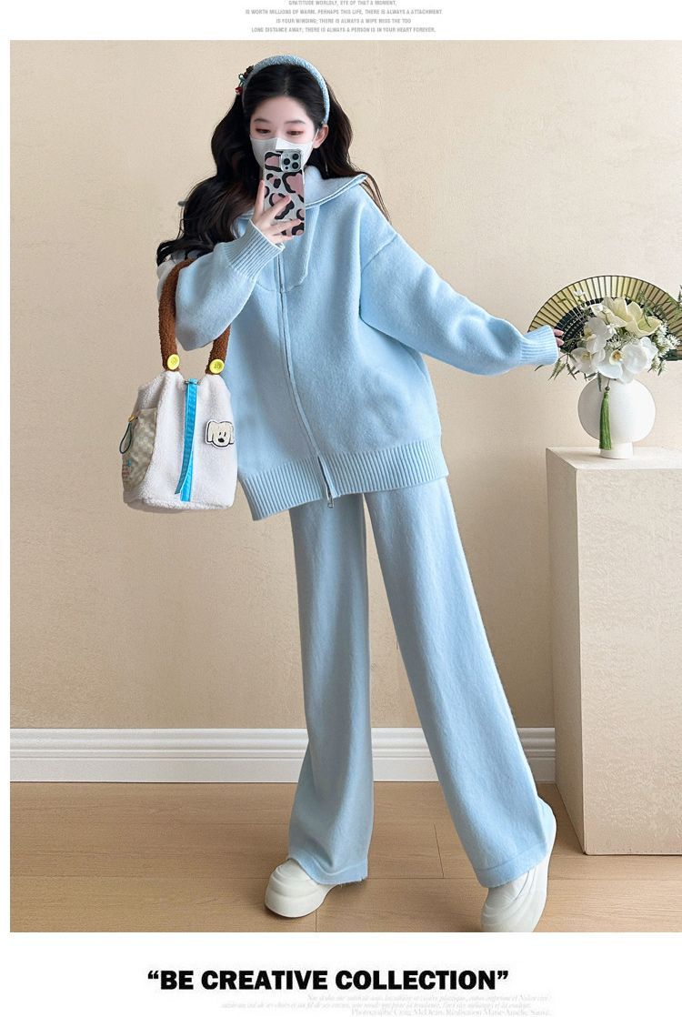 松弛感穿搭套装黄色宽松毛衣开衫外套女秋冬新款休闲阔腿裤两件套