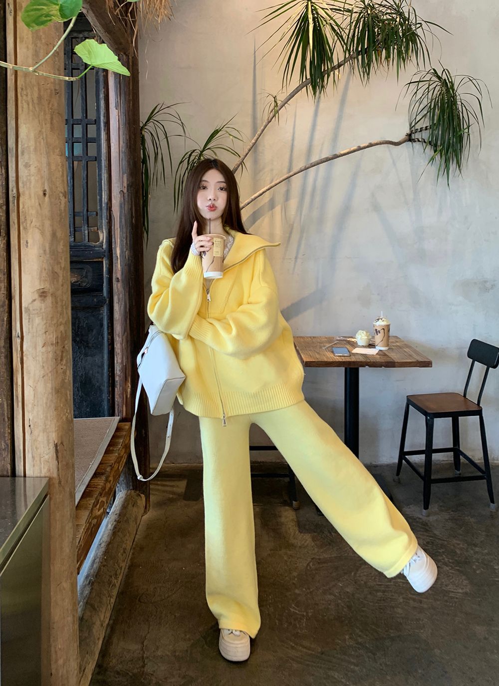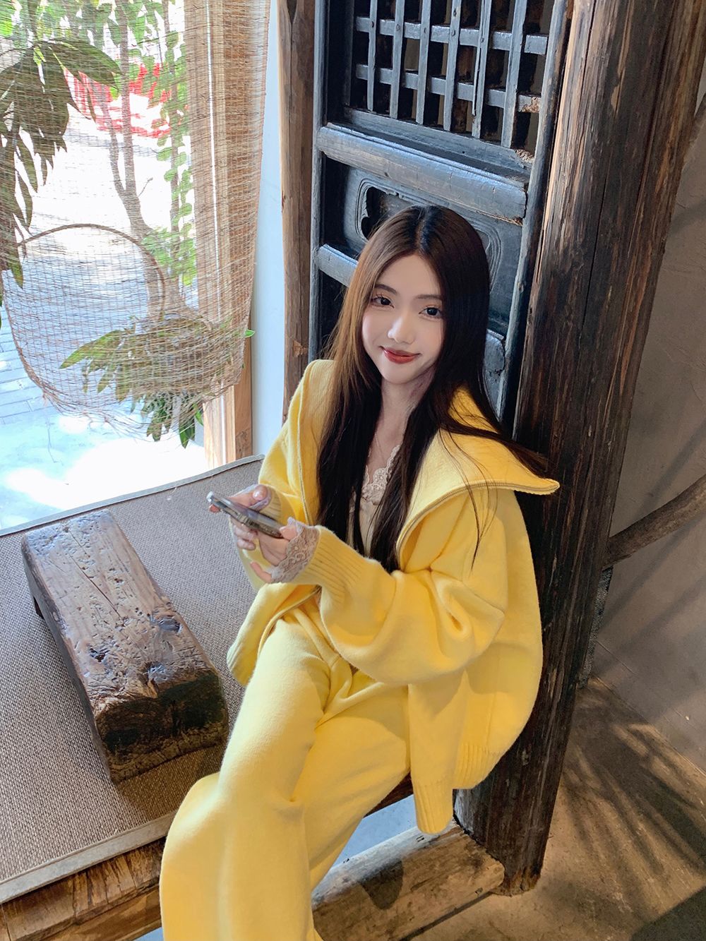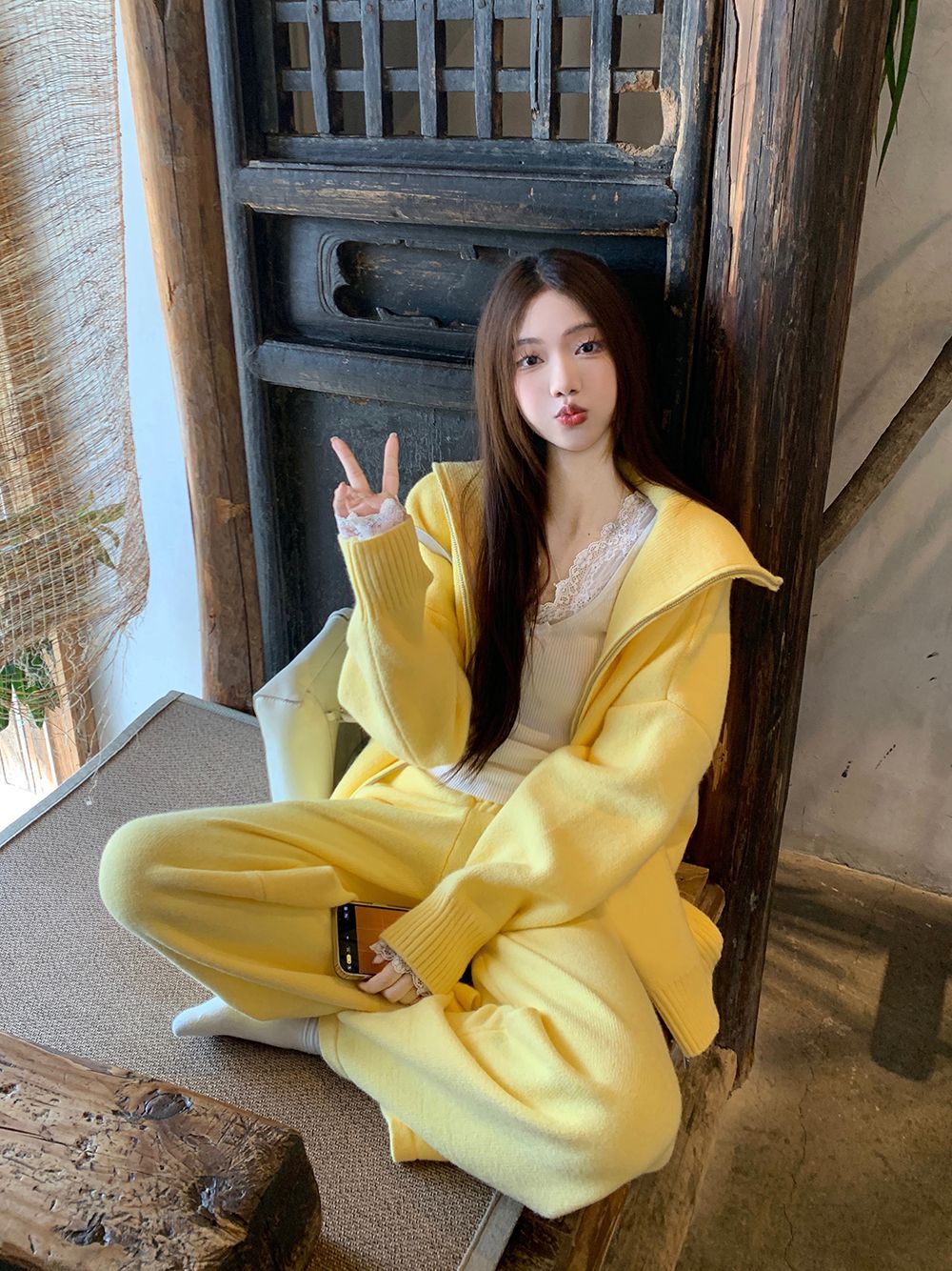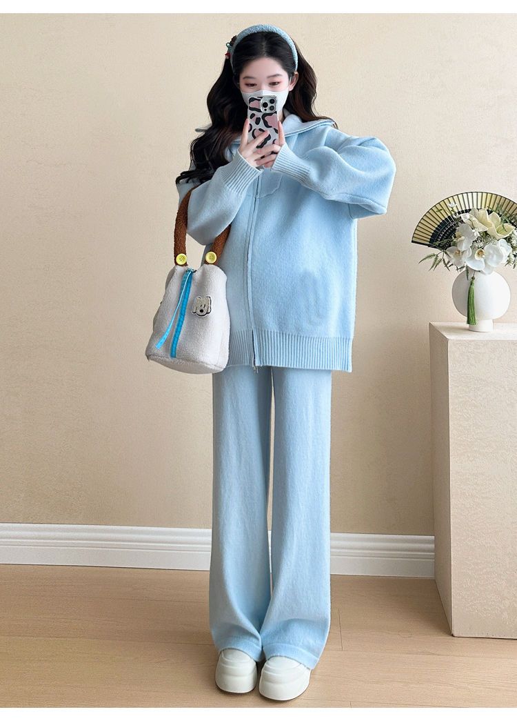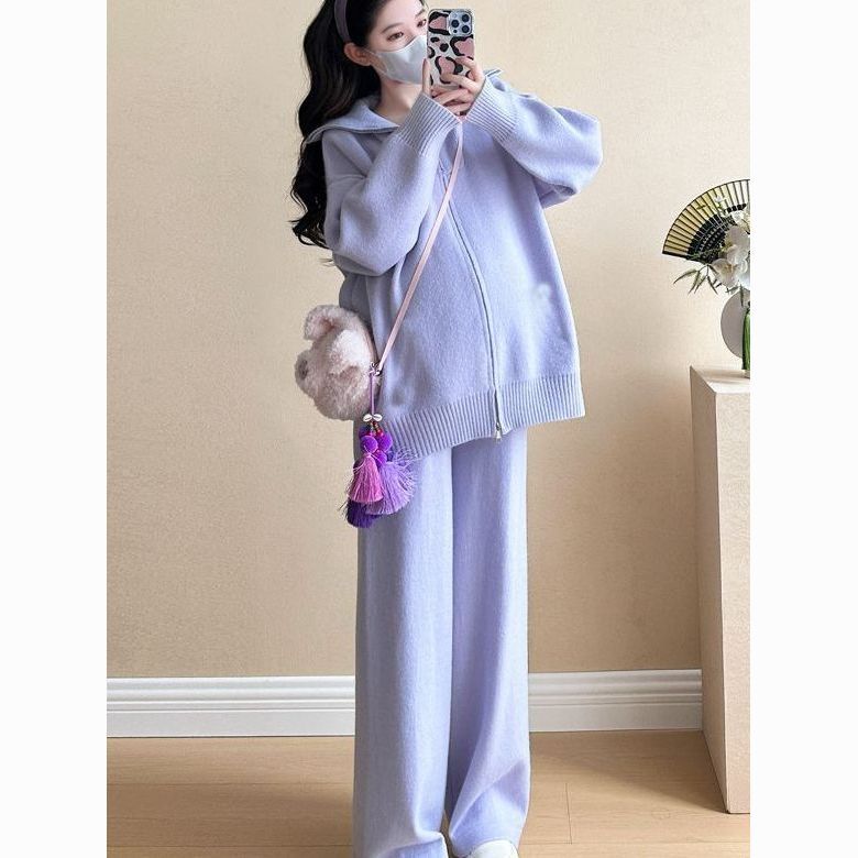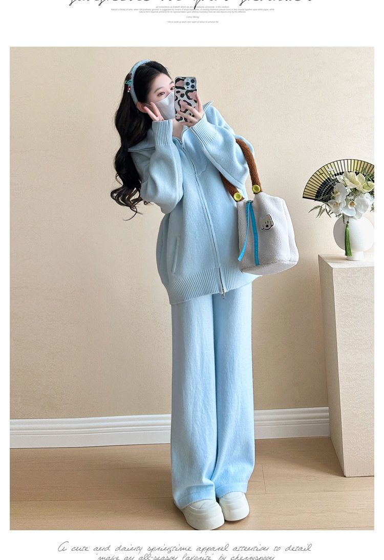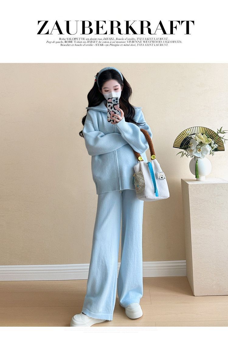 松弛感穿搭套装黄色宽松毛衣开衫外套女秋冬新款休闲阔腿裤两件套