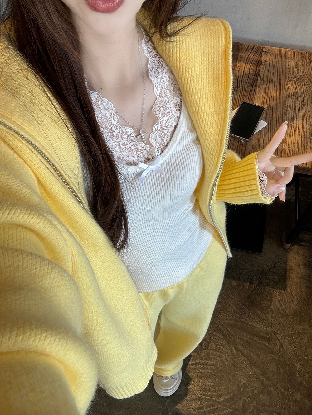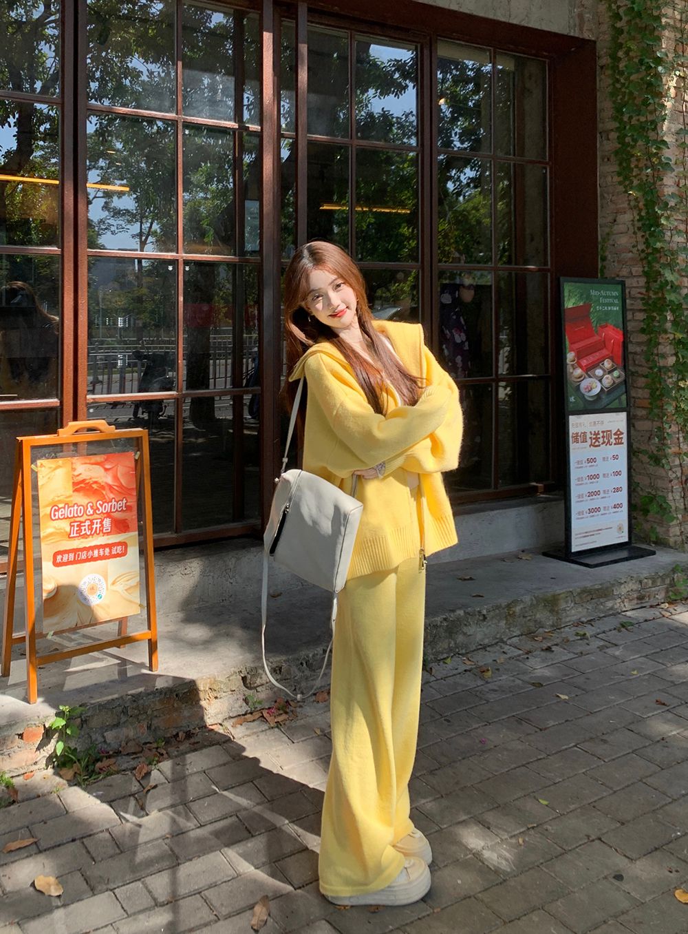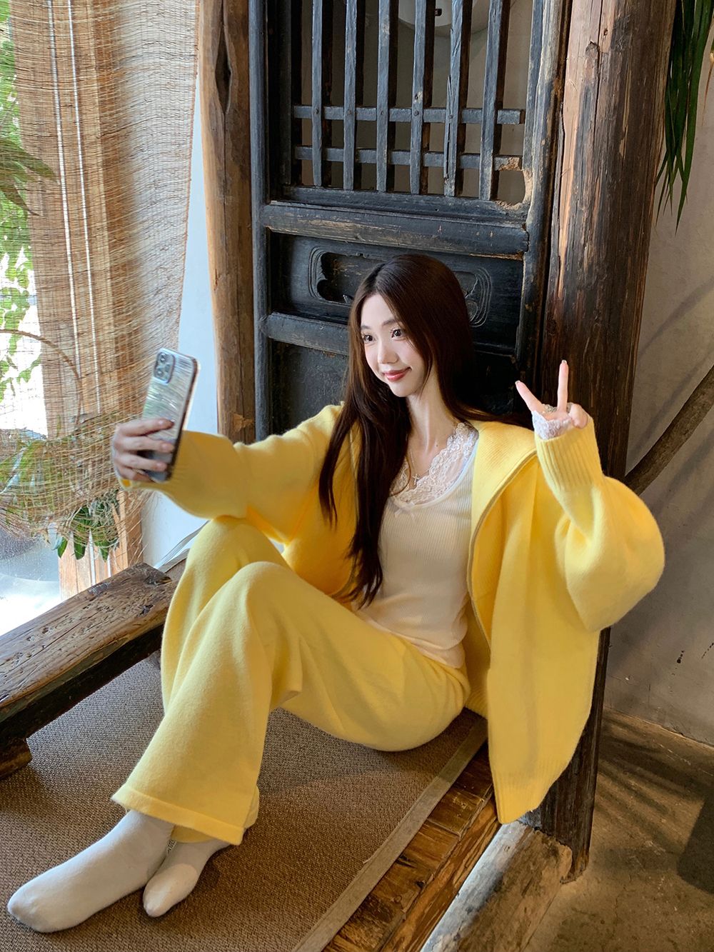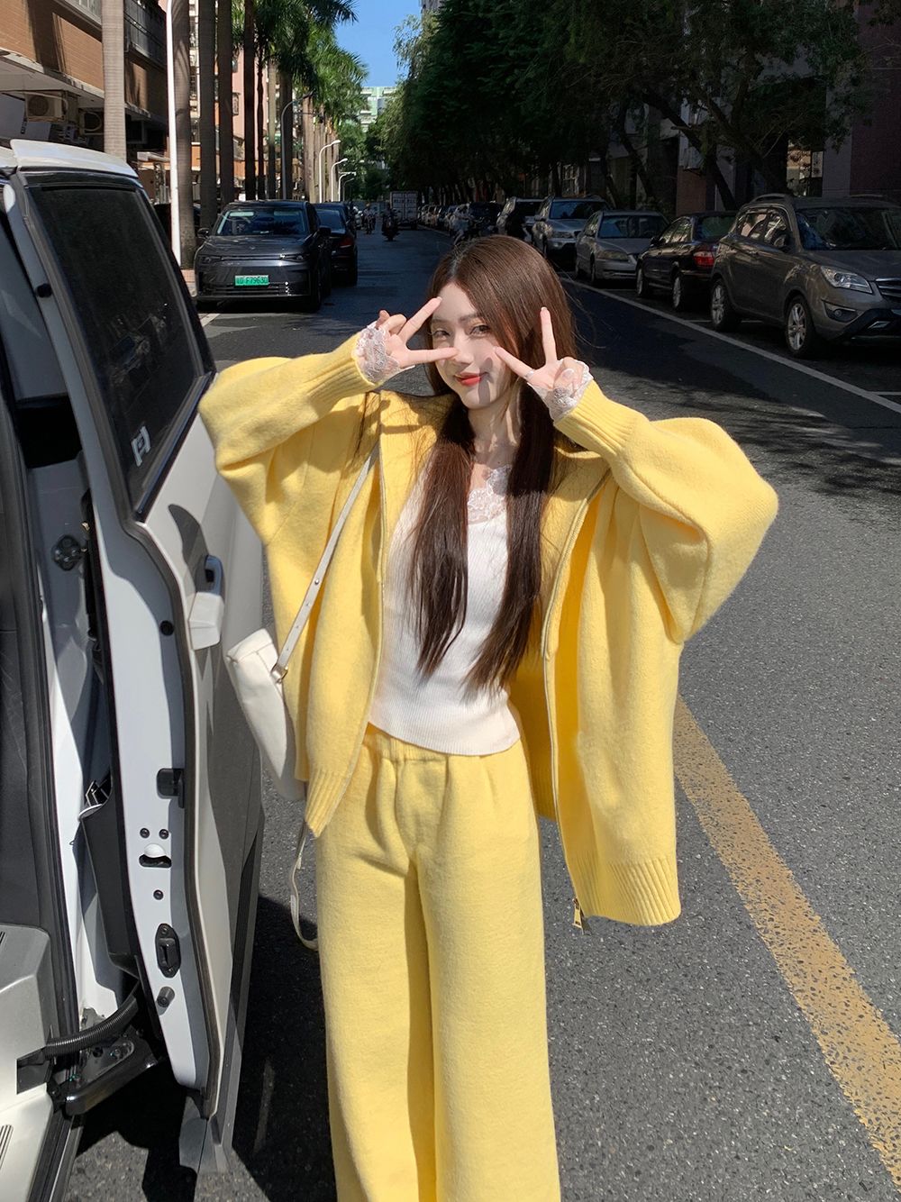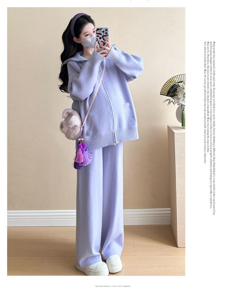 松弛感穿搭套装黄色宽松毛衣开衫外套女秋冬新款休闲阔腿裤两件套