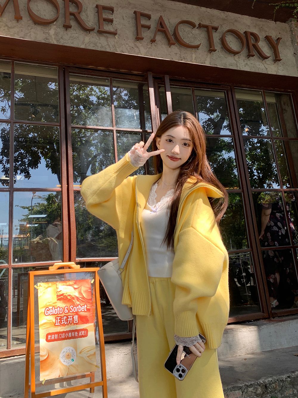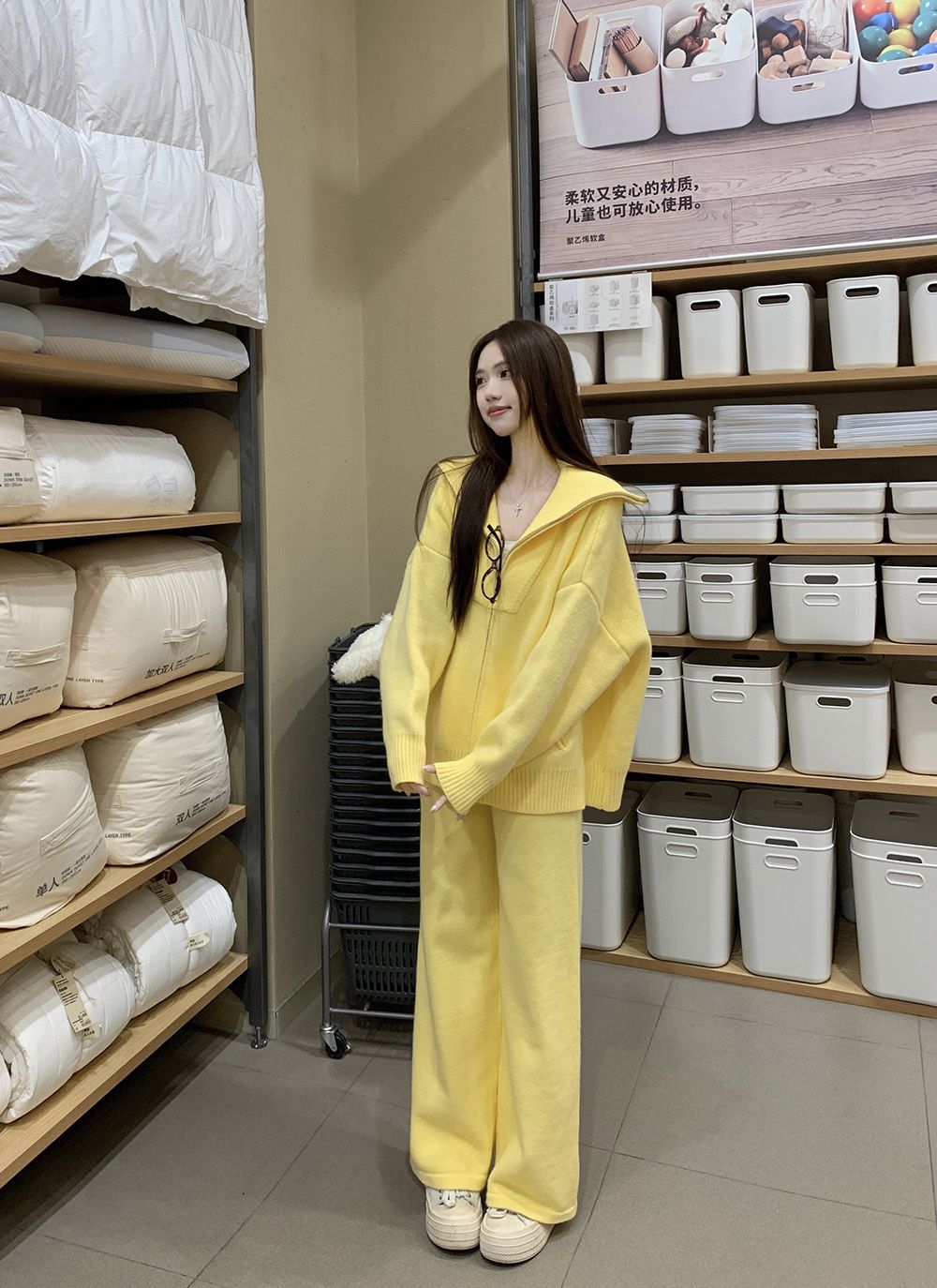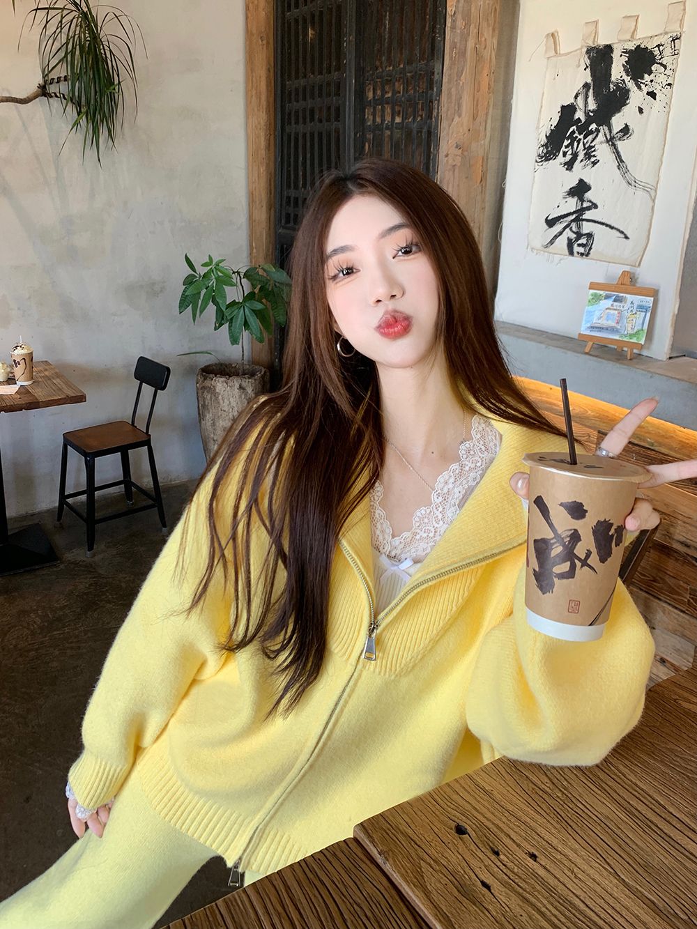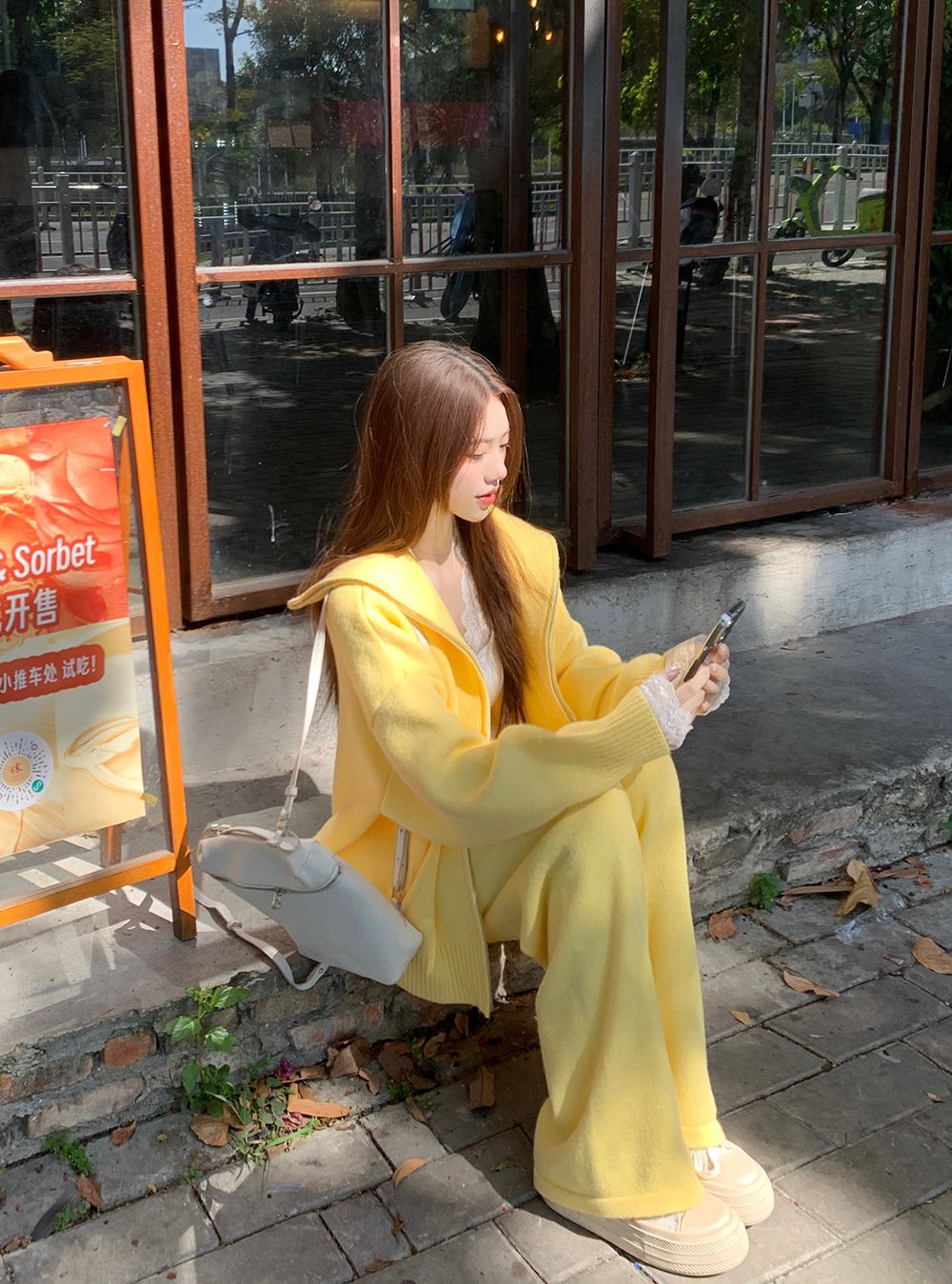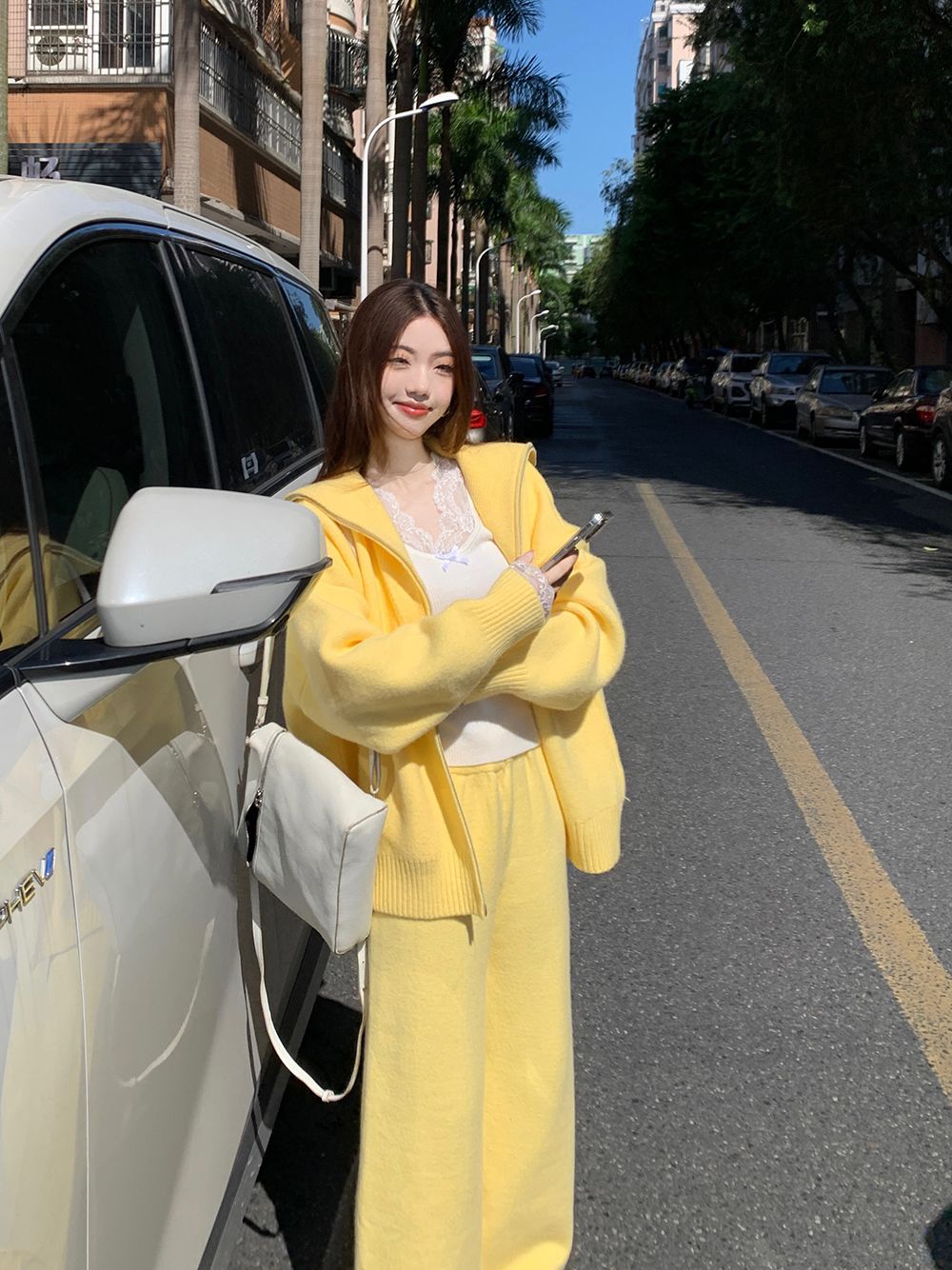 松弛感穿搭套装黄色宽松毛衣开衫外套女秋冬新款休闲阔腿裤两件套