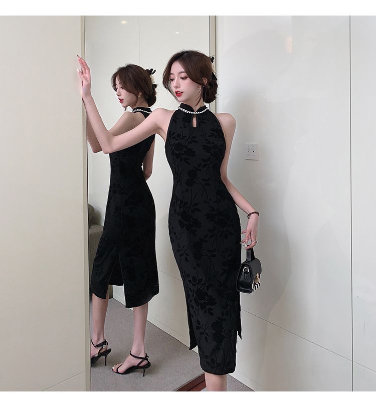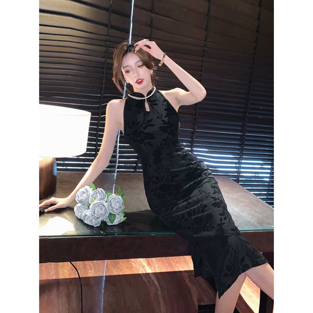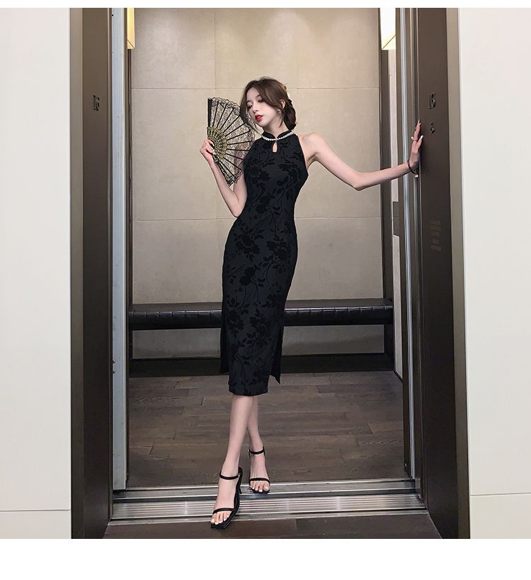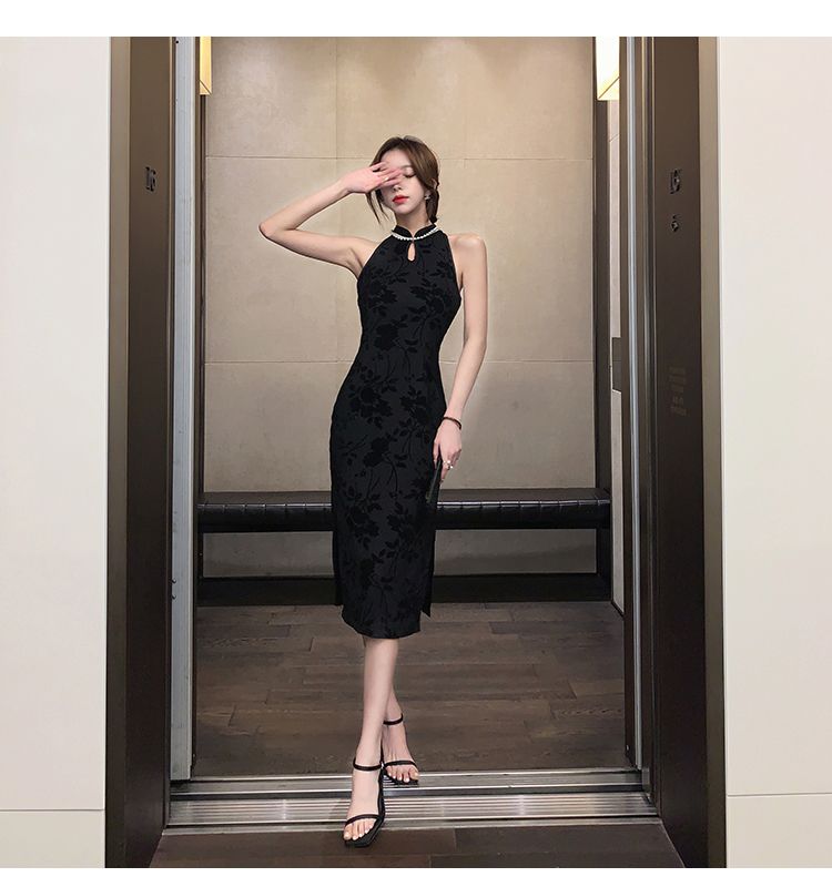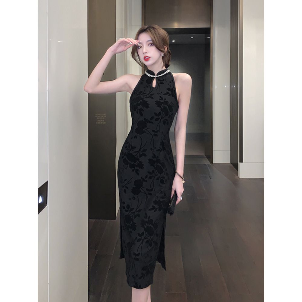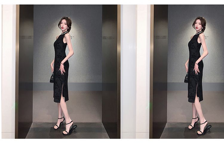 赫本风植绒高级旗袍优雅夏季长款修身无袖小黑裙巨显瘦轻熟连衣裙