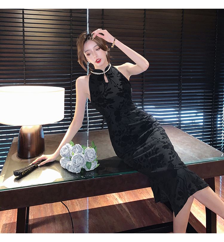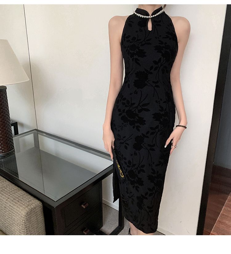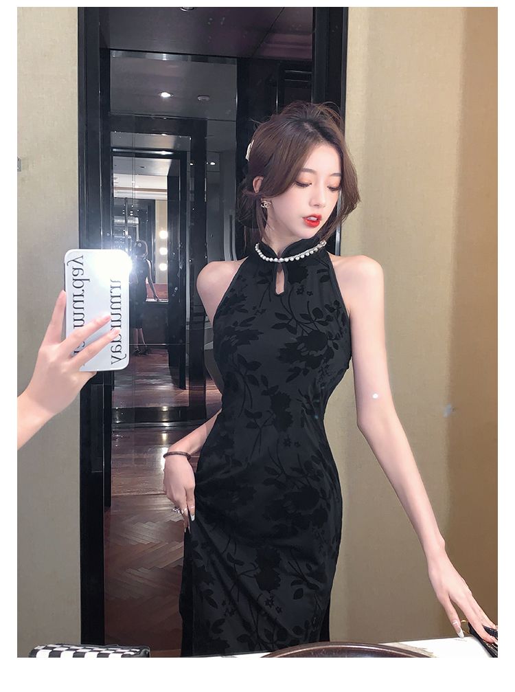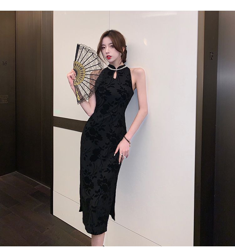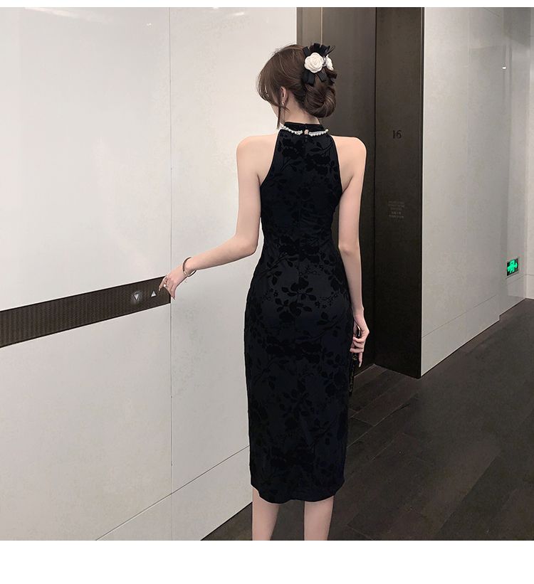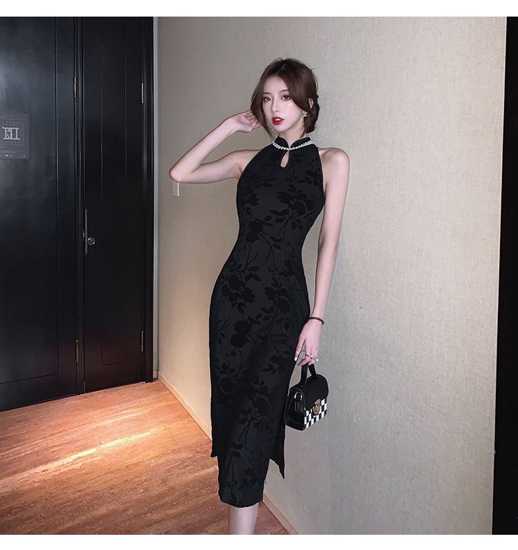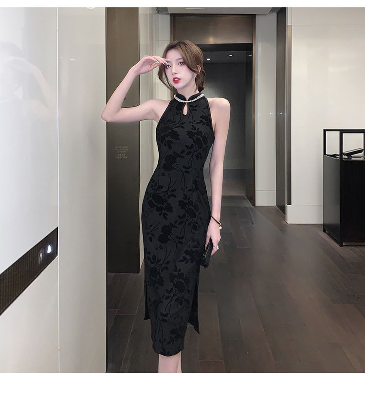 赫本风植绒高级旗袍优雅夏季长款修身无袖小黑裙巨显瘦轻熟连衣裙