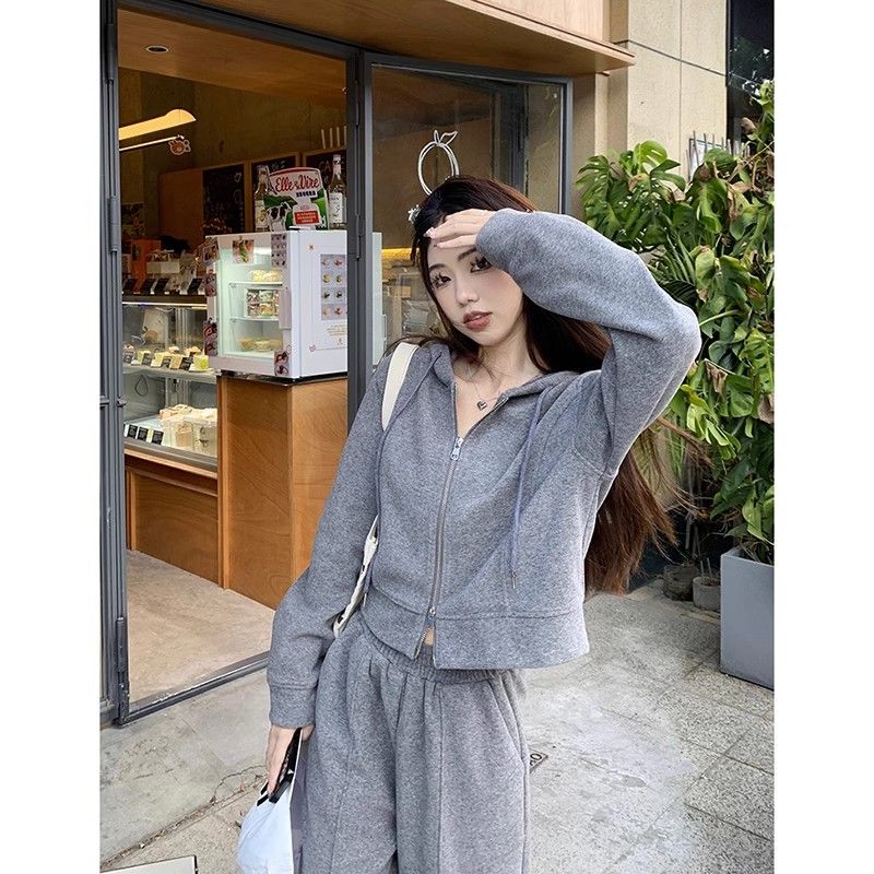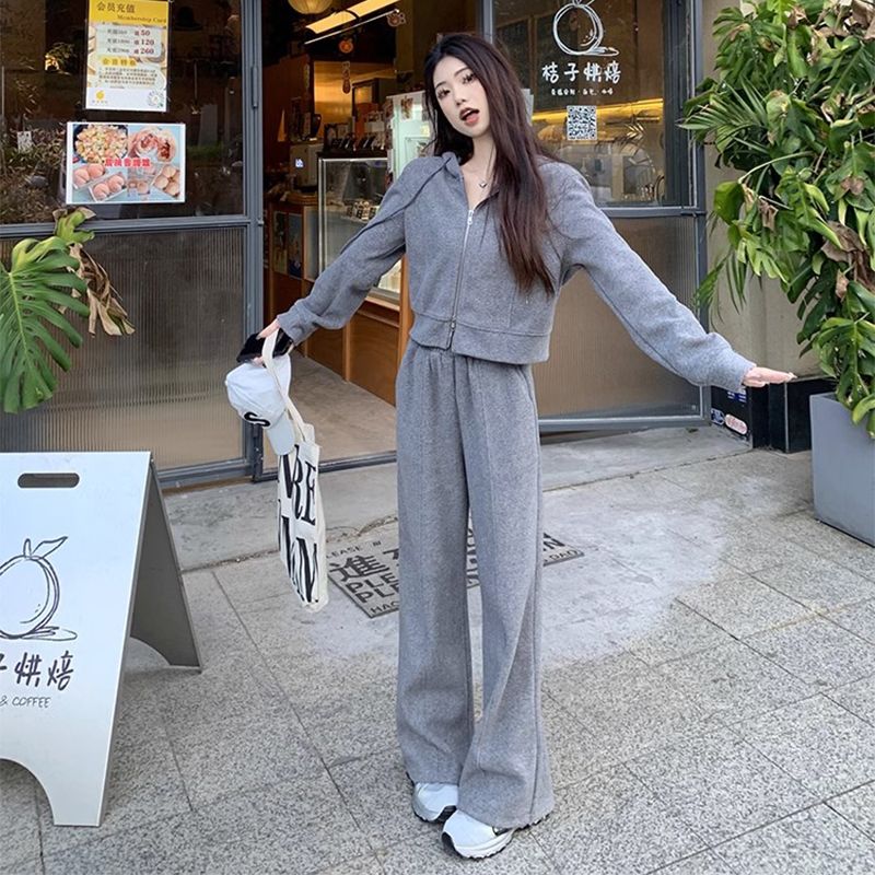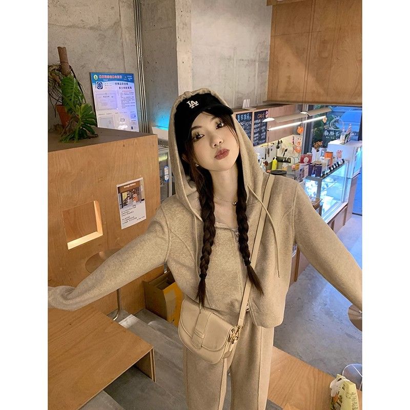 休闲运动套装女春秋新款宽松休闲韩版连帽拉链卫衣阔腿裤两件套潮