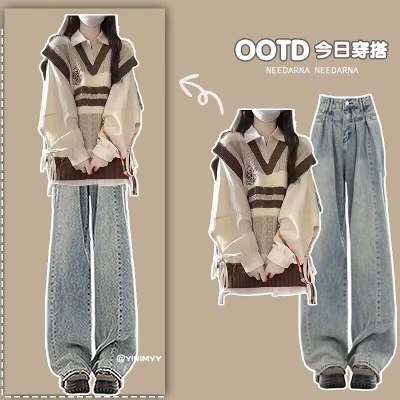 秋冬温柔系穿搭女一整套2024年新款韩版衬衫马甲高腰牛仔裤三件套