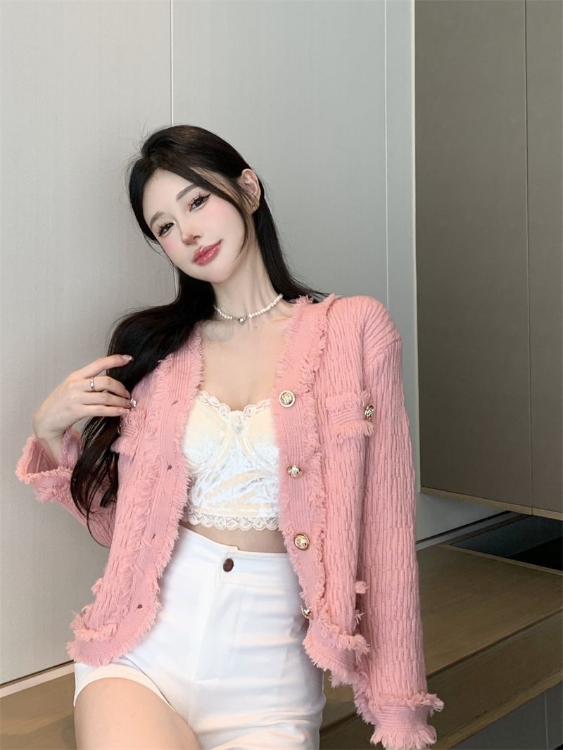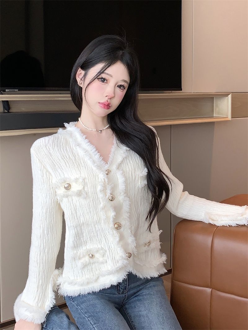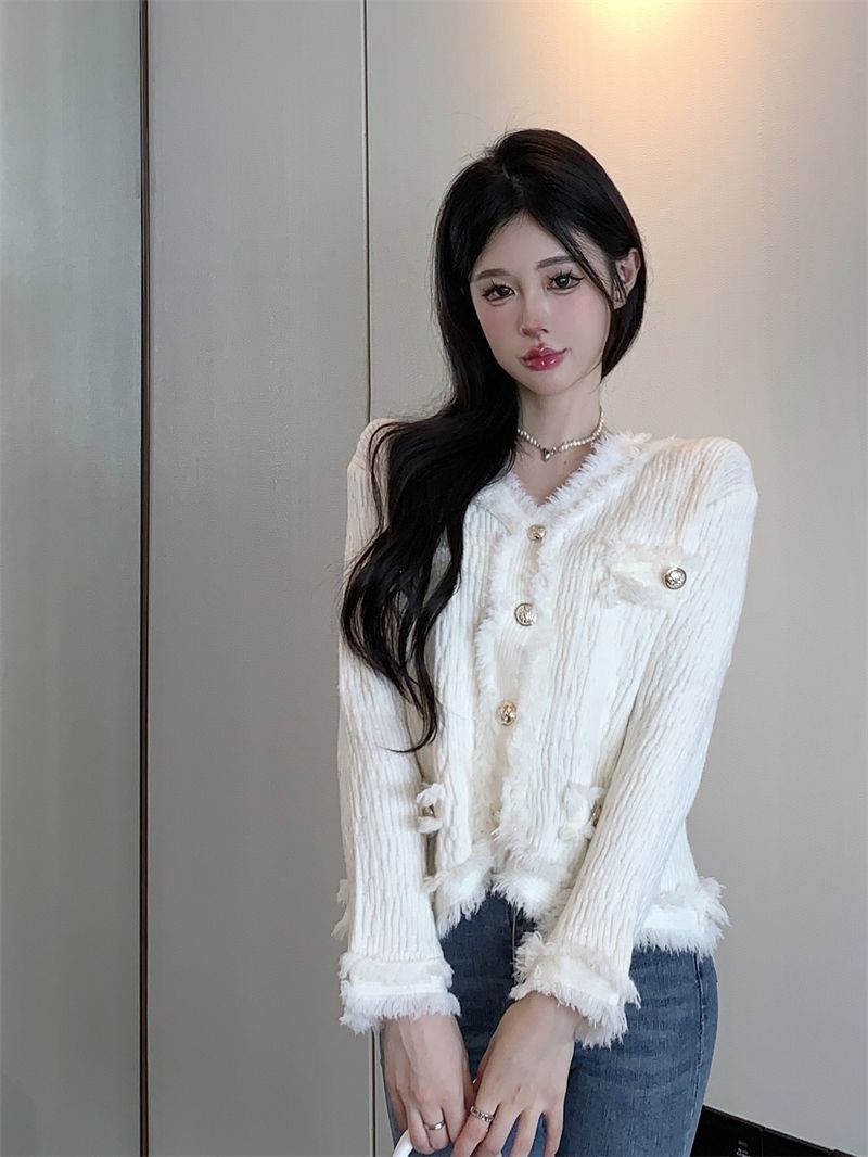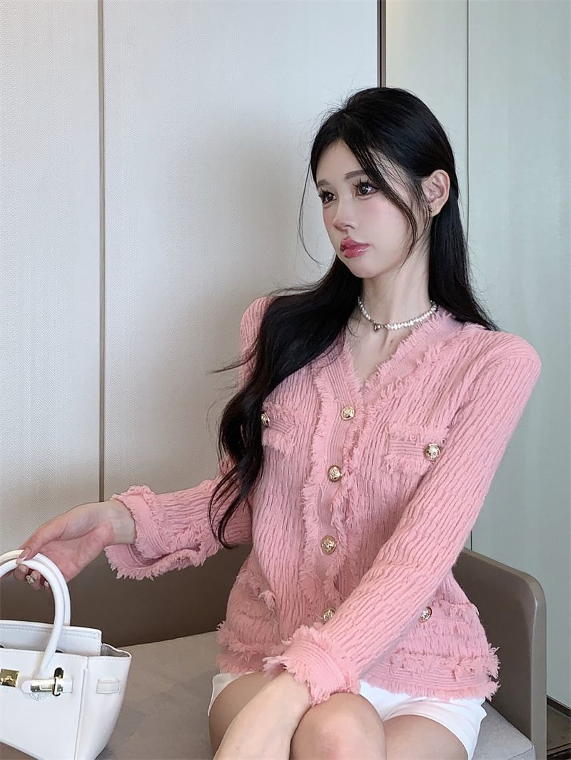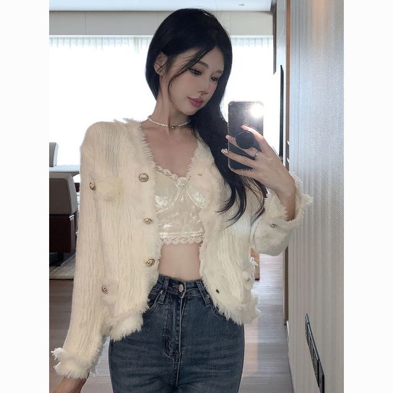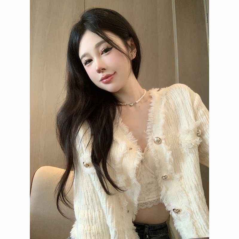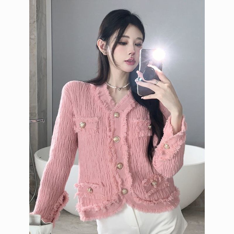 别致绝美小香风流苏毛衣外套女秋冬季氛围感慵懒V领针织开衫上衣