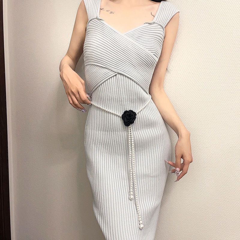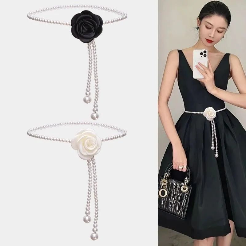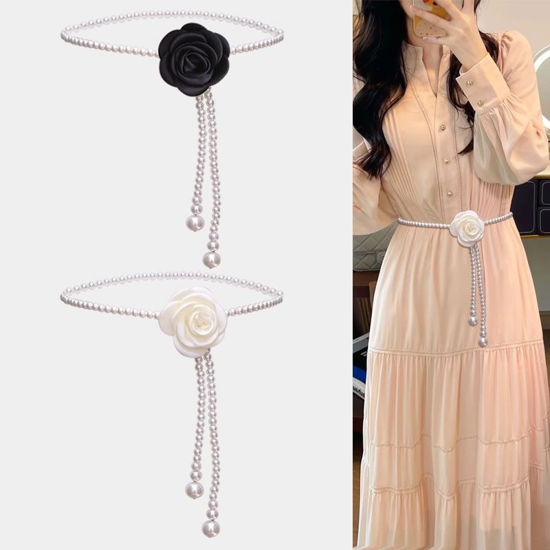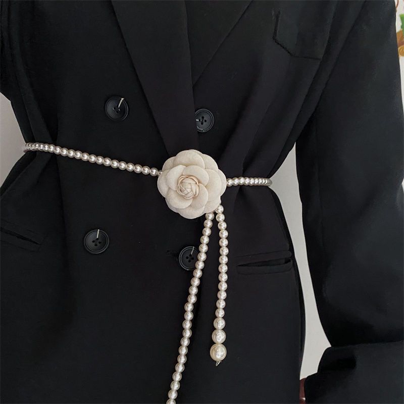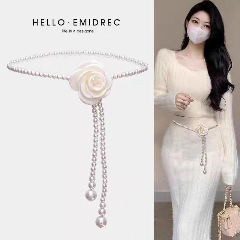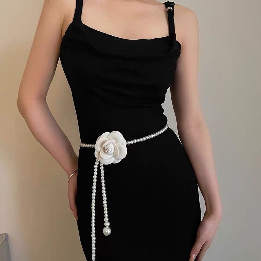 山茶花珍珠腰链白色链条花朵裙子高级装饰连衣裙腰带收腰香风配饰