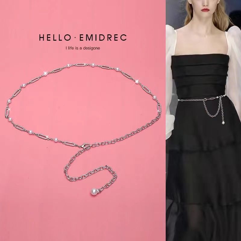 腰链配饰2023新款小香风高级感水钻珍珠装饰细腰带女银色金属链条