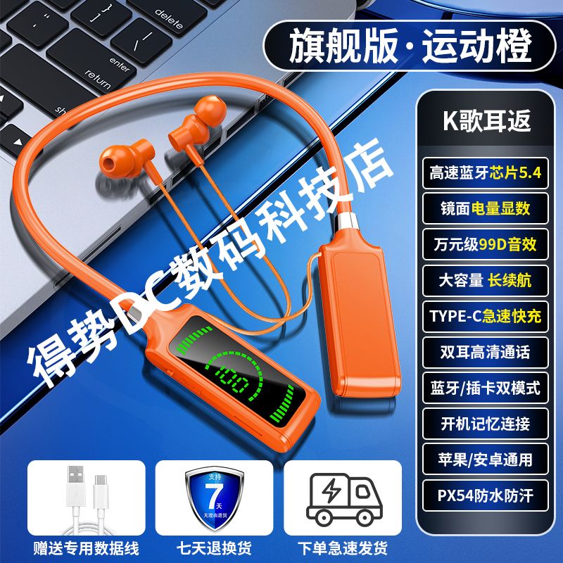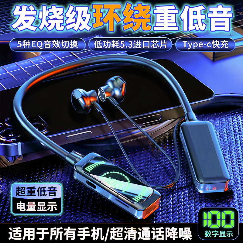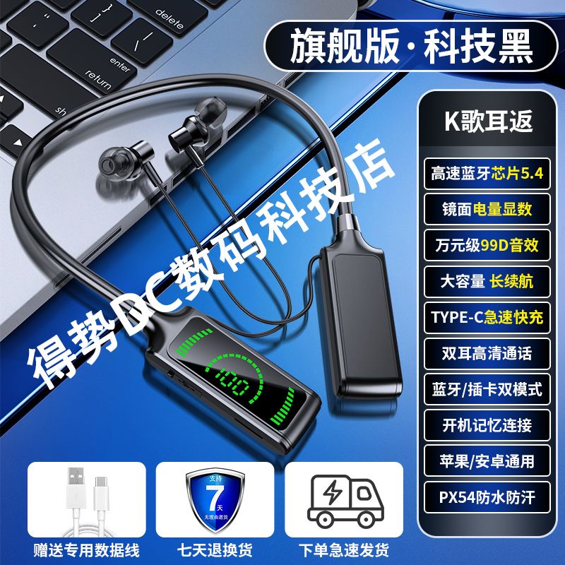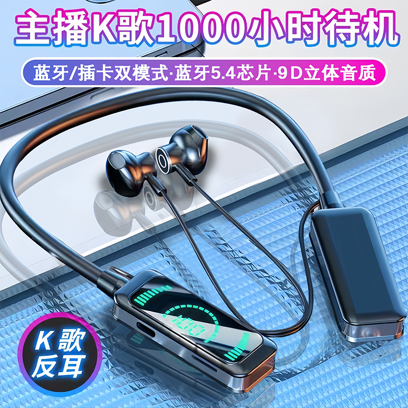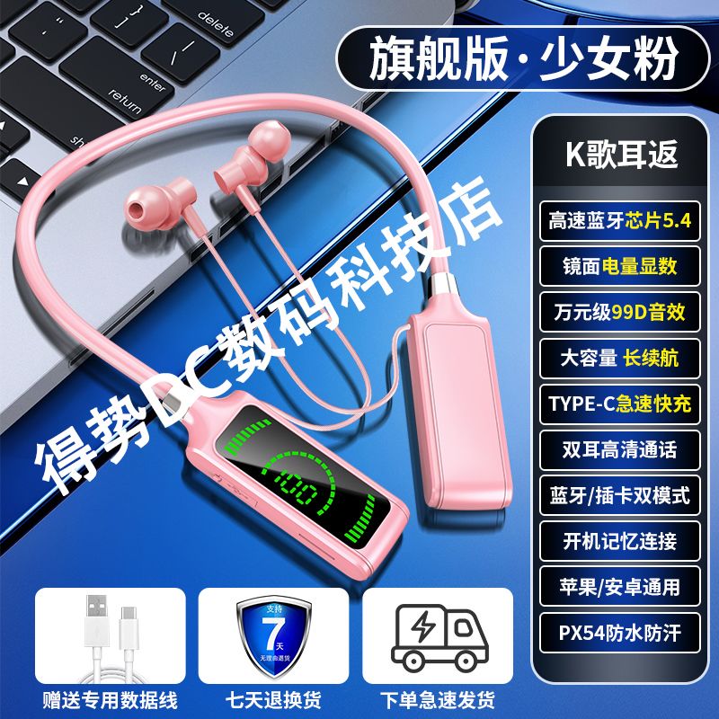 2024新款无线蓝牙耳机K歌耳返挂脖式超长续航重低音安卓苹果通用