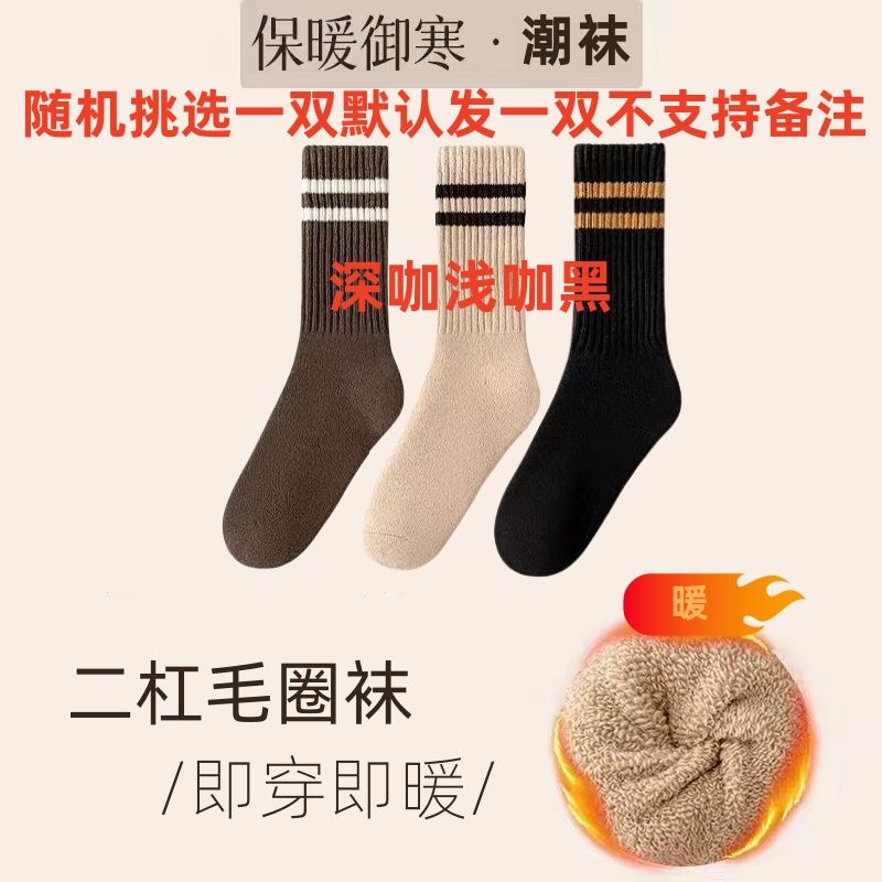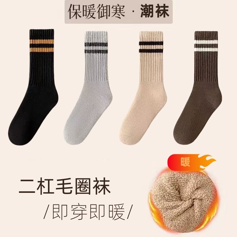 超厚毛圈袜子女秋冬中筒袜加绒加厚保暖条纹长筒冬天毛巾长袜男袜
