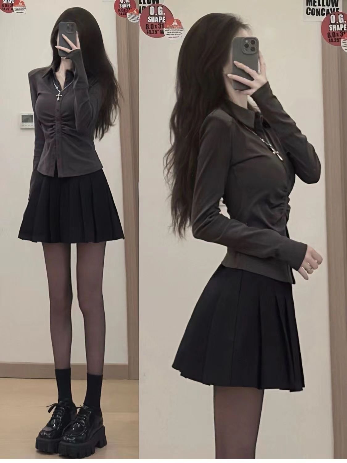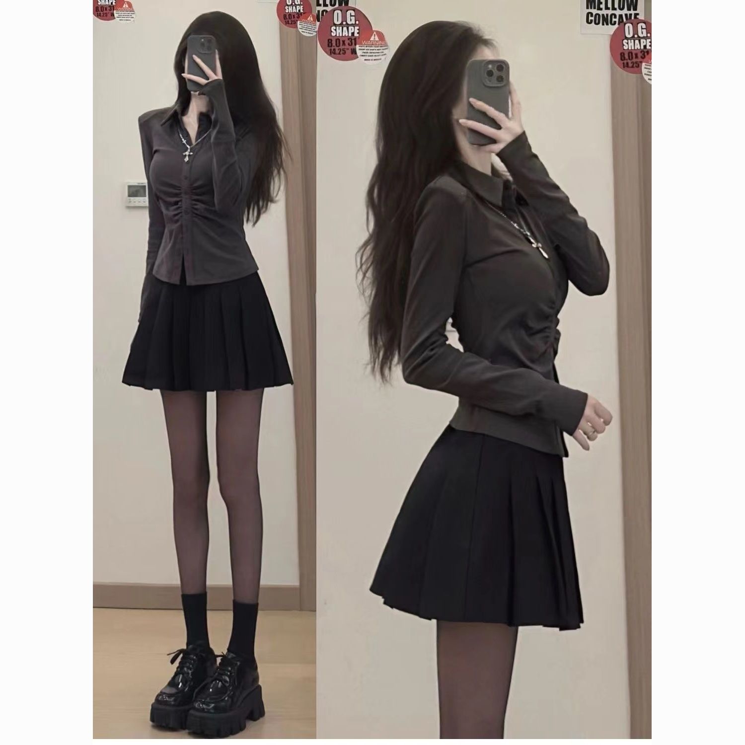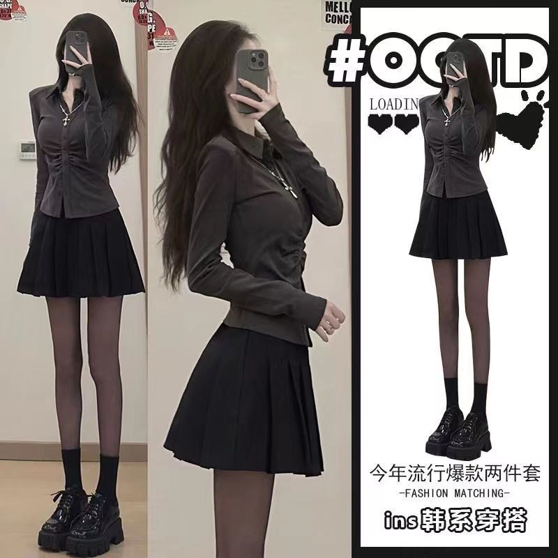 春季时尚套装jk纯欲轻熟风别致上衣褶皱衬衫+高腰百褶裙两件套潮