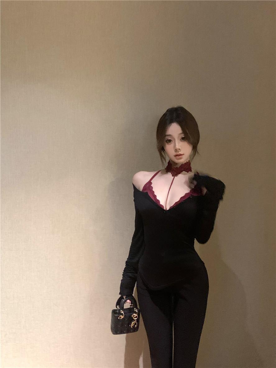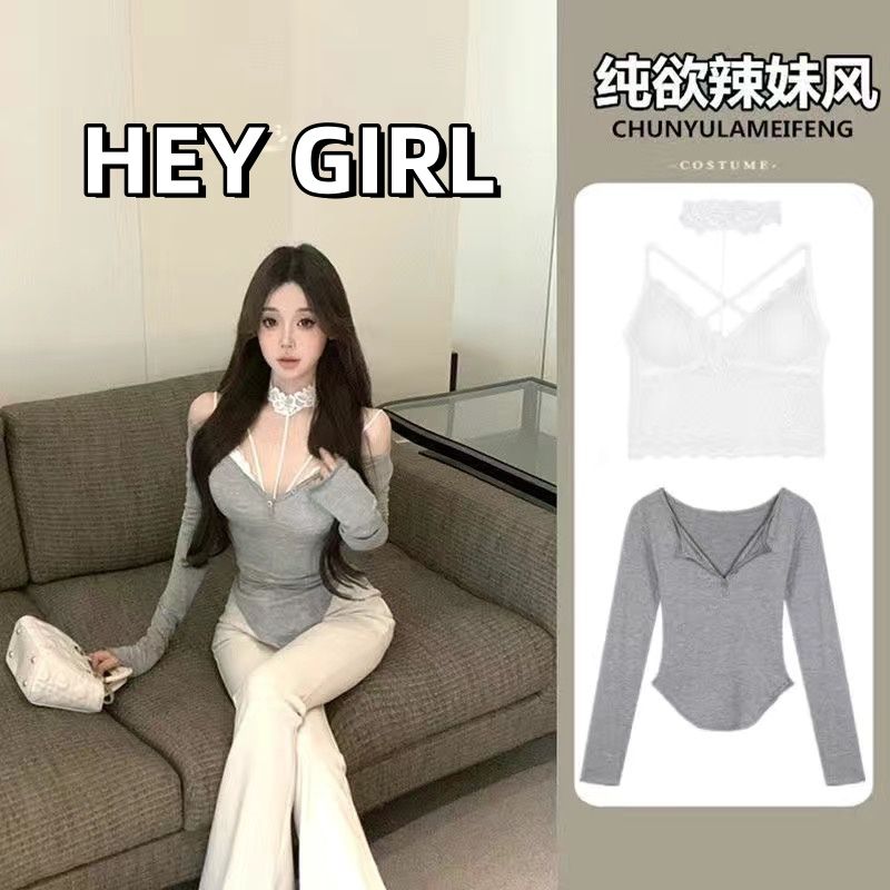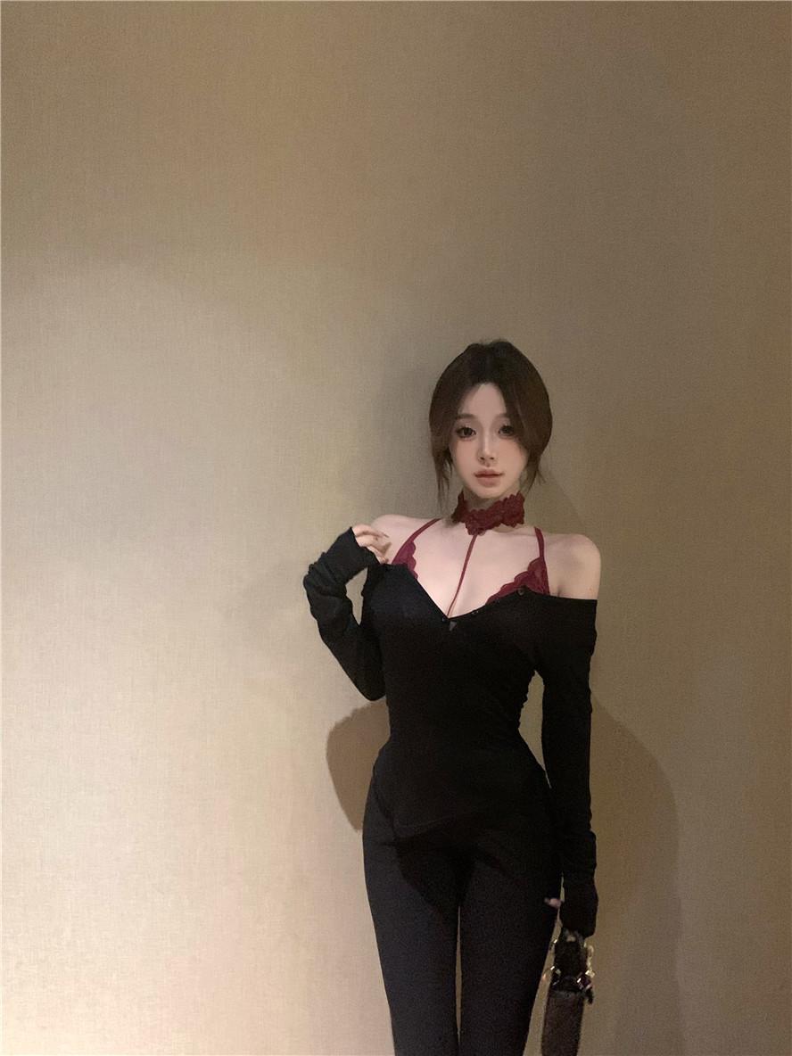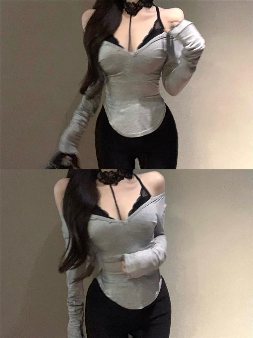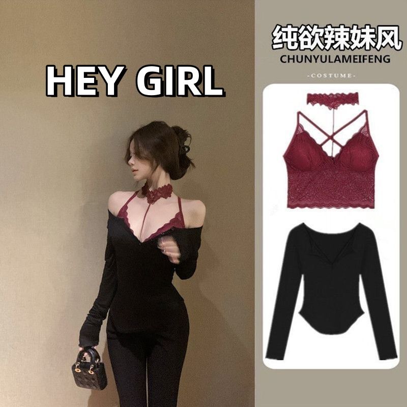 一字肩长袖T恤女+蕾丝收腰紧身吊带两件套气质纯欲辣妹打底衫上衣
