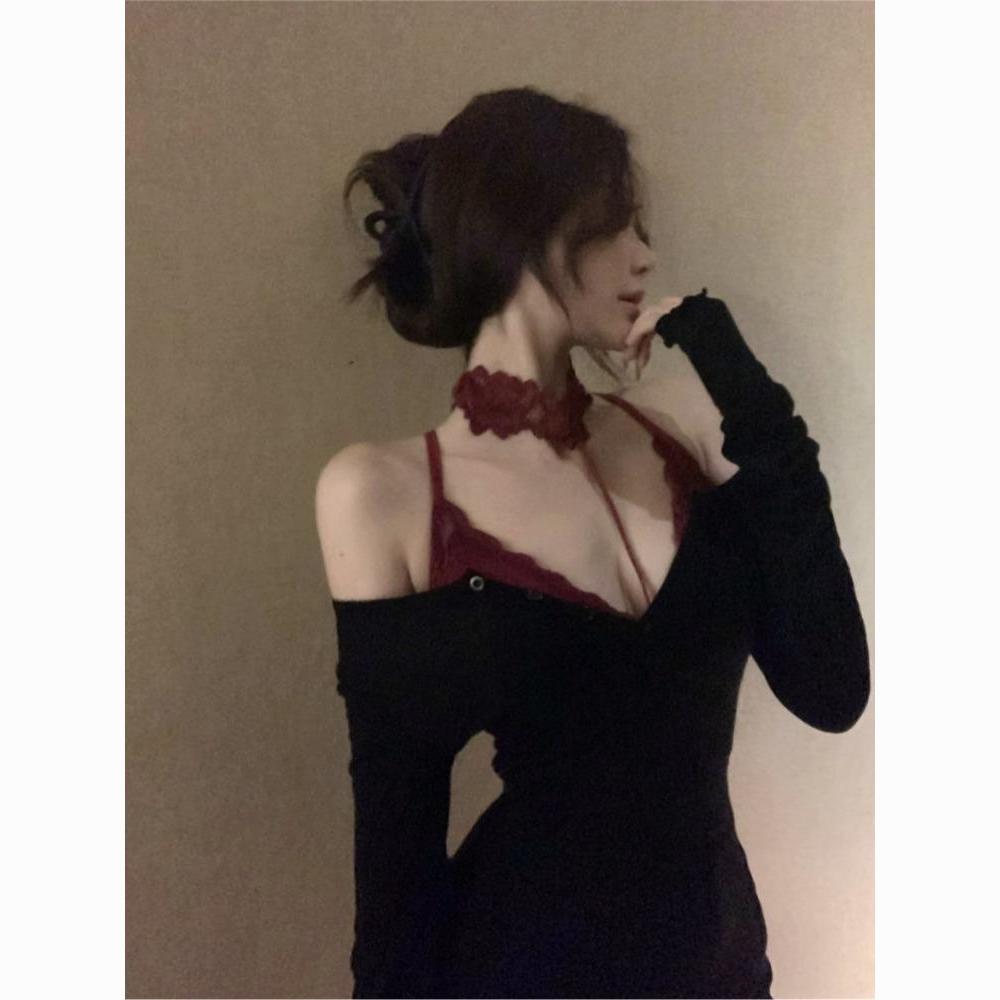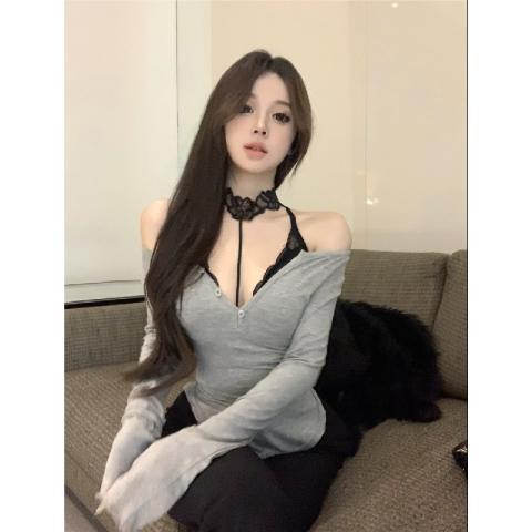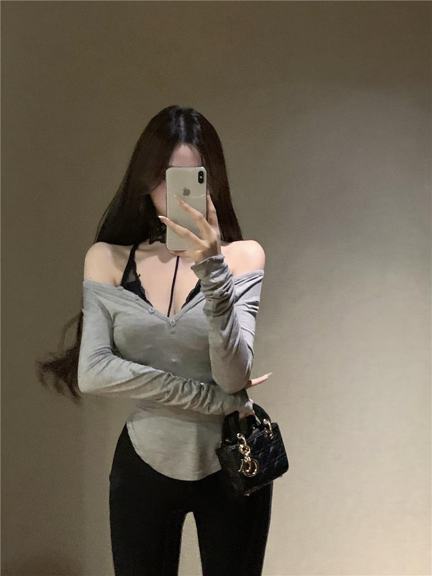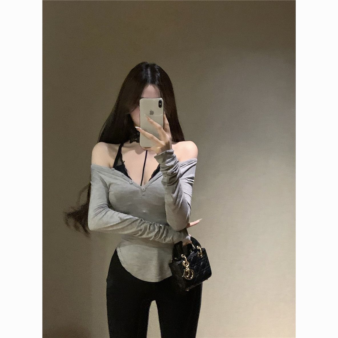 一字肩长袖T恤女+蕾丝收腰紧身吊带两件套气质纯欲辣妹打底衫上衣