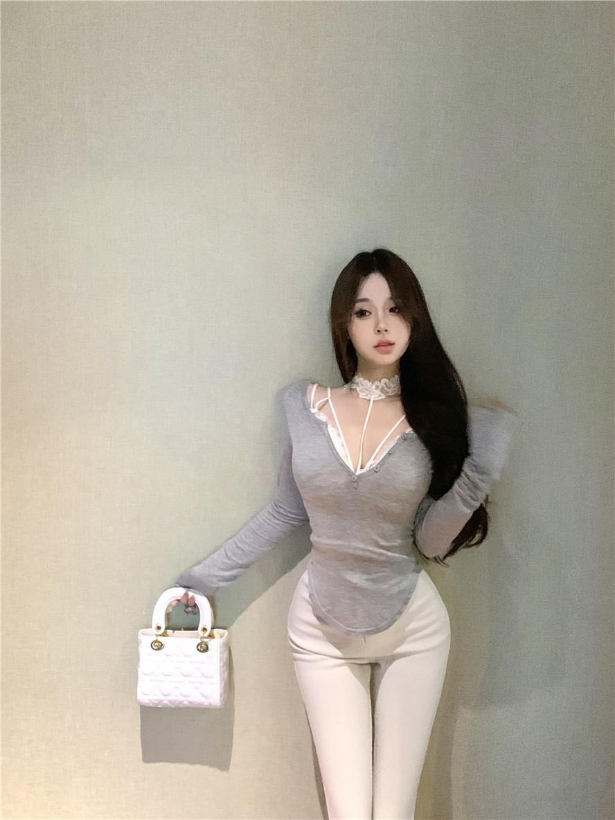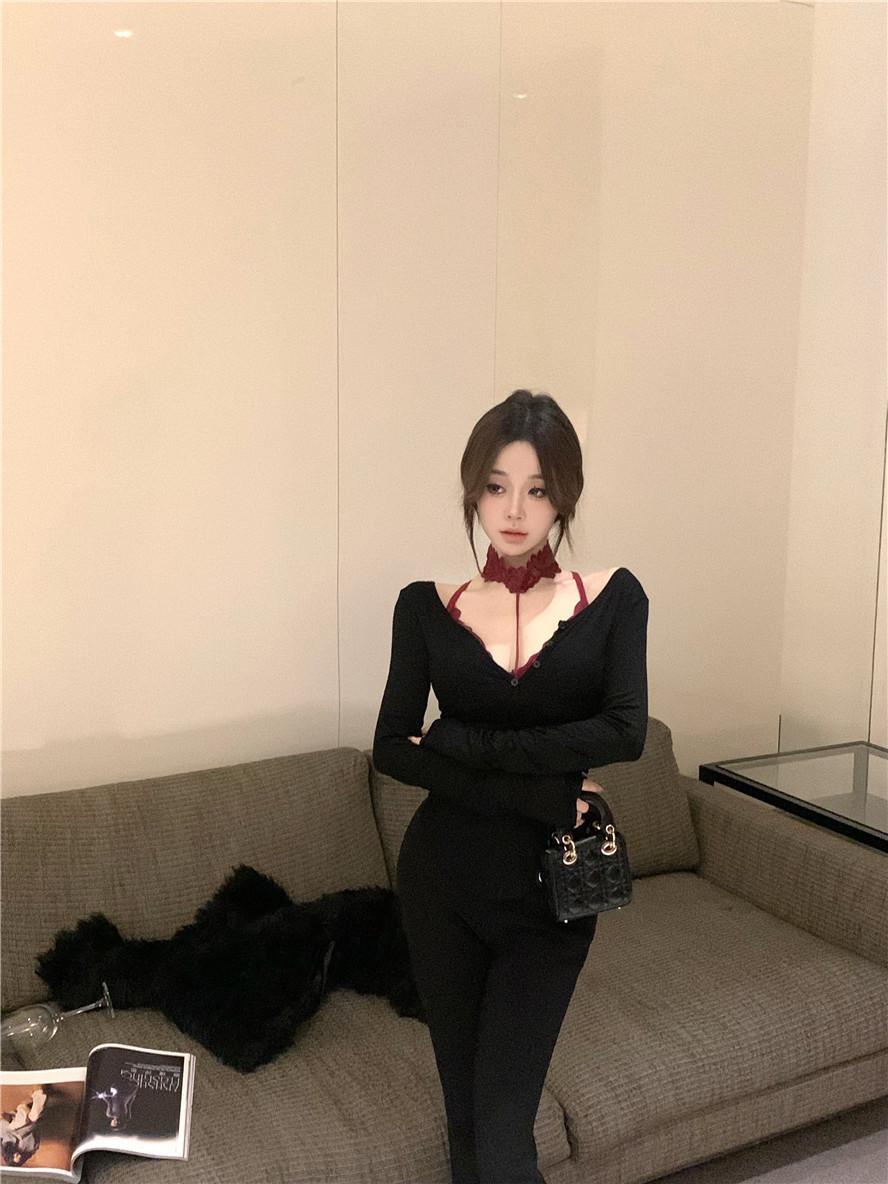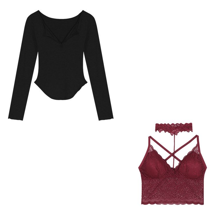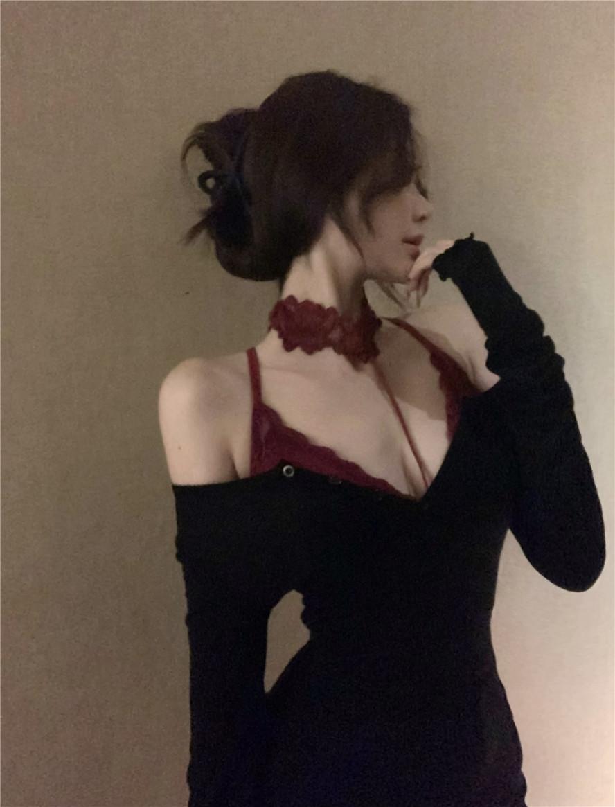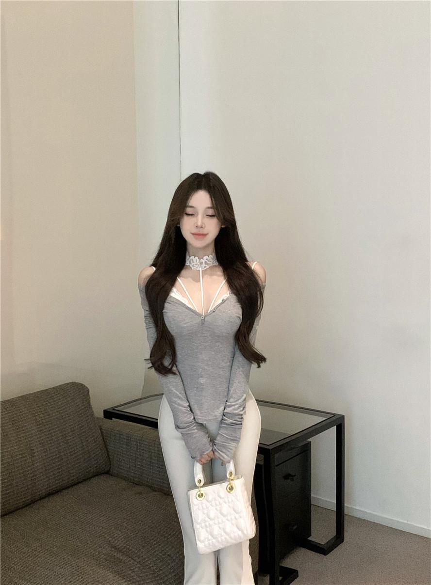 一字肩长袖T恤女+蕾丝收腰紧身吊带两件套气质纯欲辣妹打底衫上衣