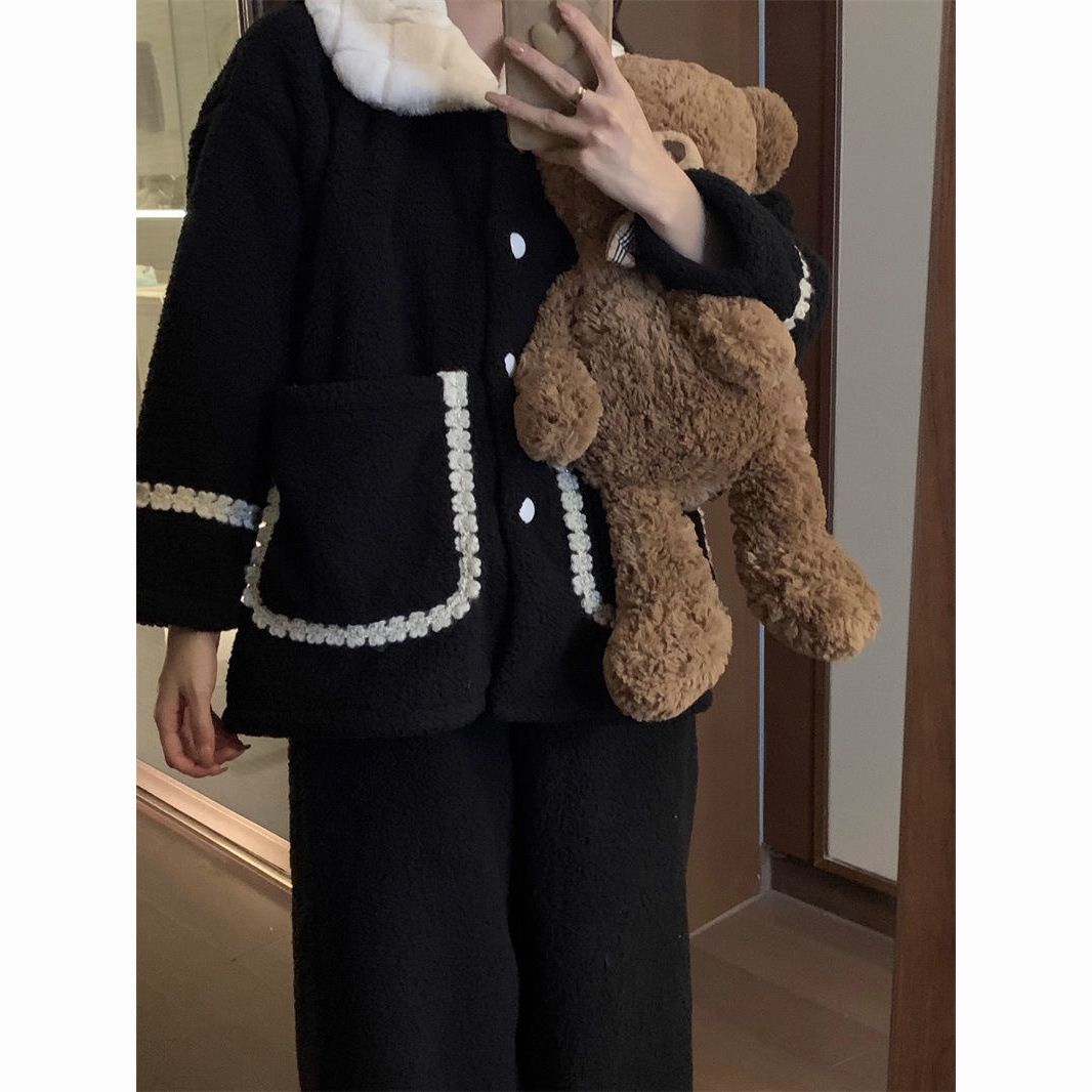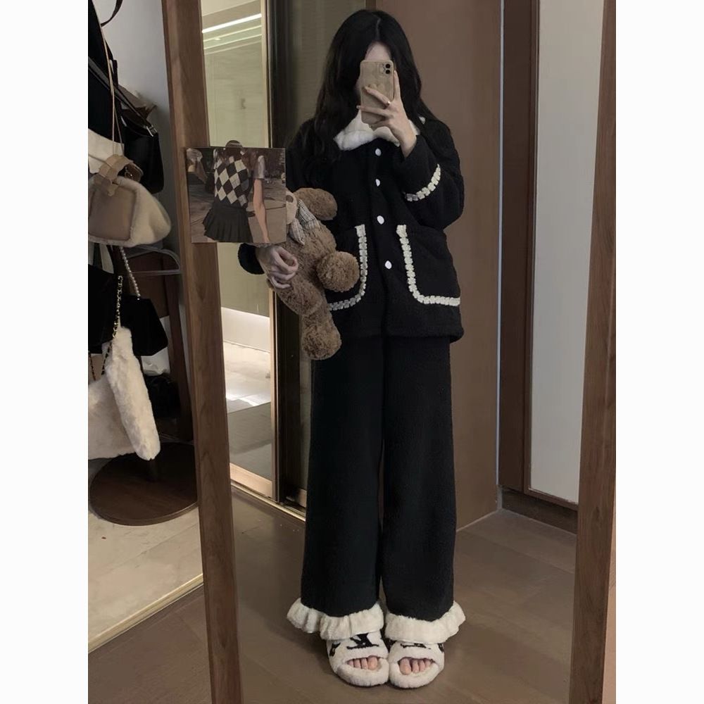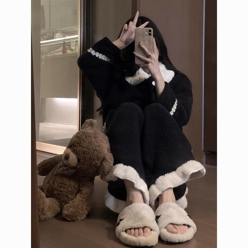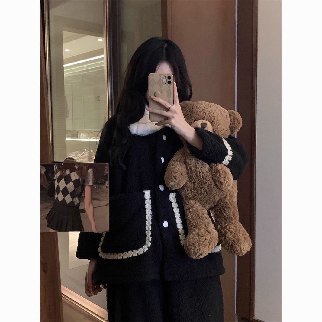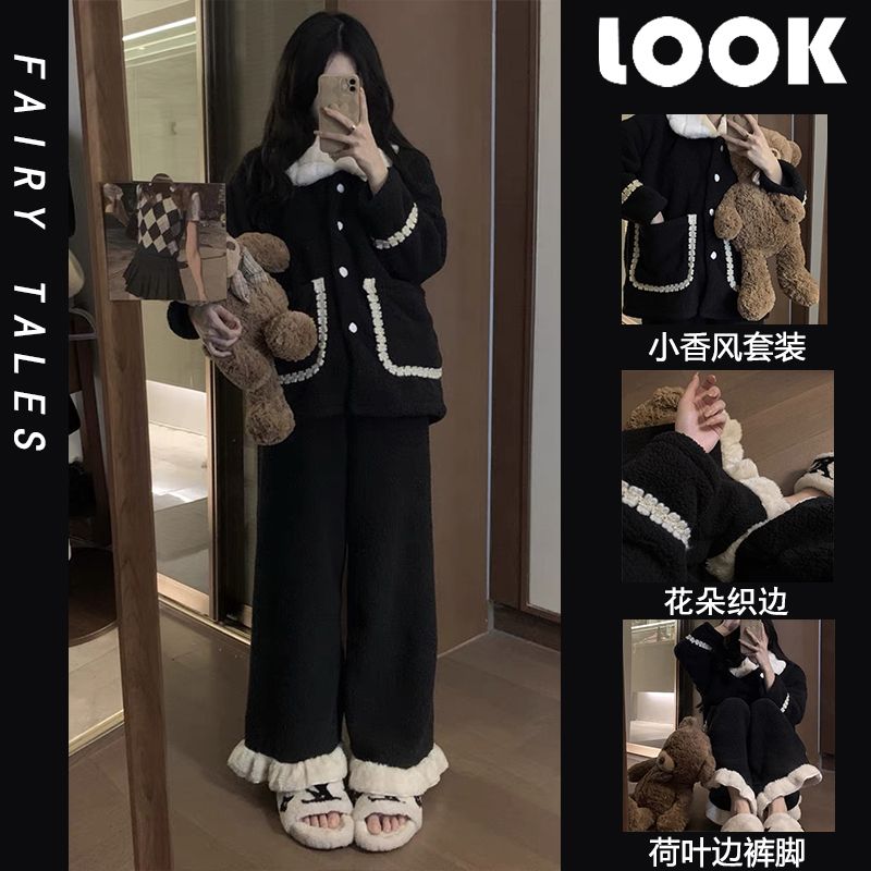 珊瑚绒睡衣女秋冬季小香风ins加绒加厚法兰绒保暖家居服套装外穿