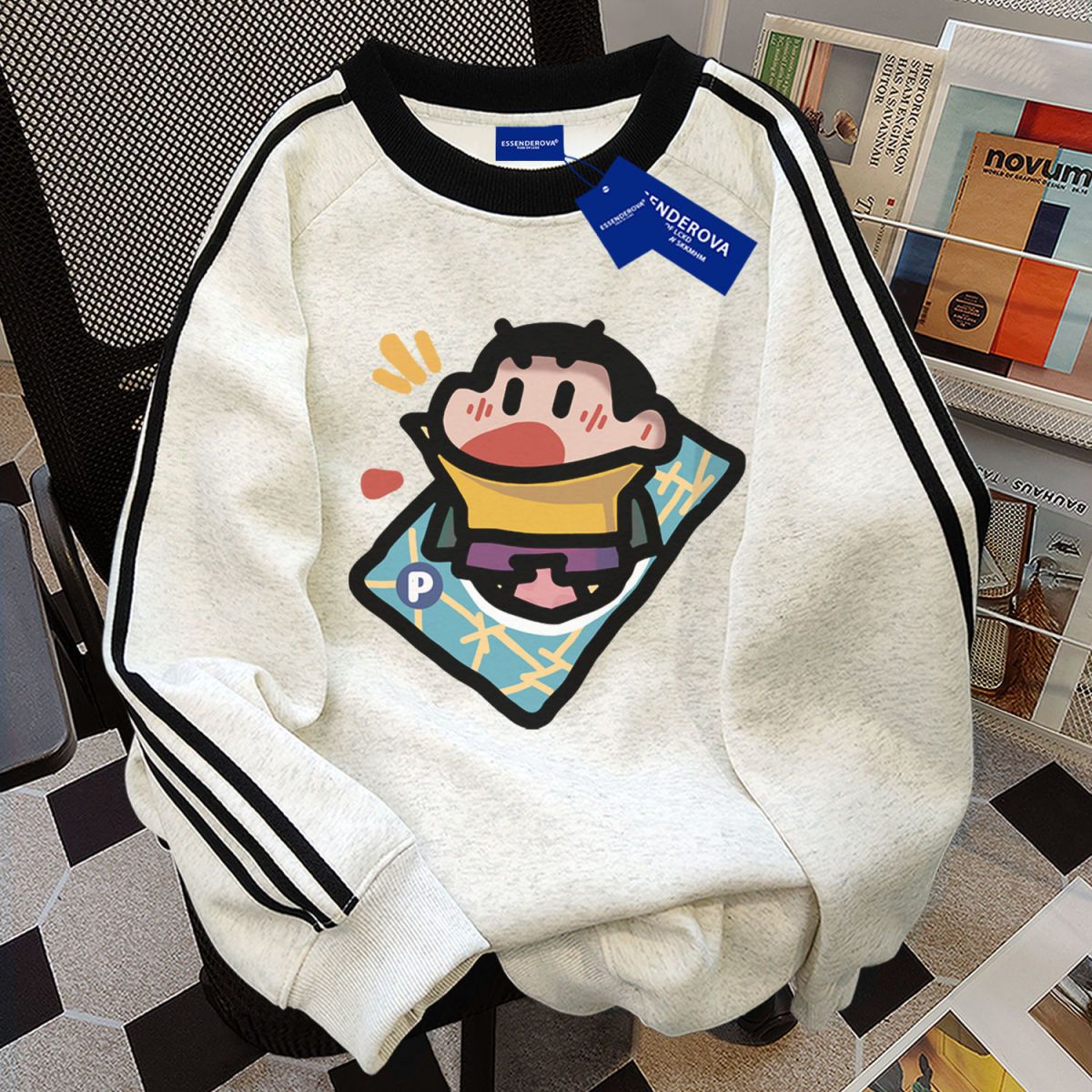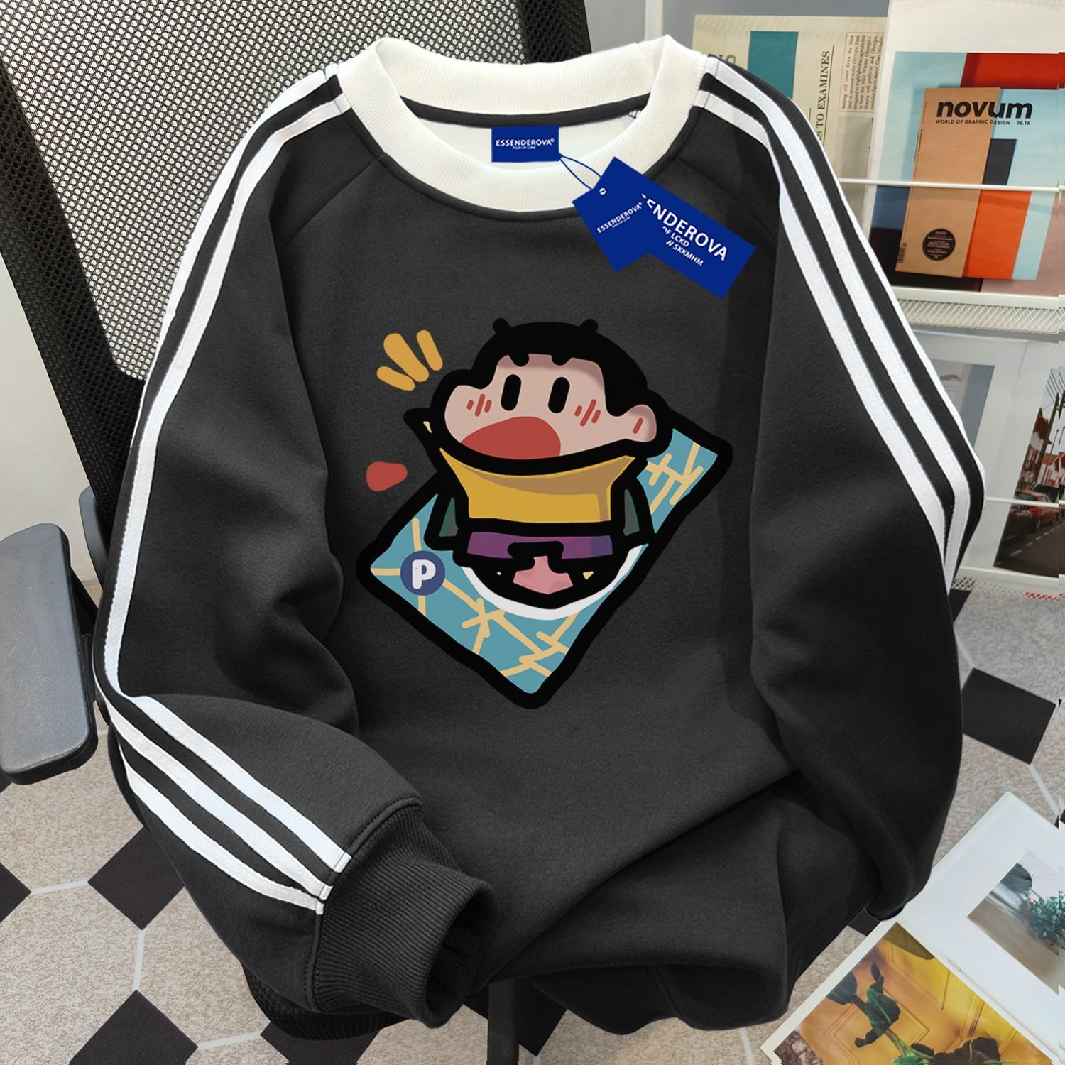 美式国潮bf风三条杠蜡笔小新印花圆领卫衣女秋冬加绒休闲百搭上衣