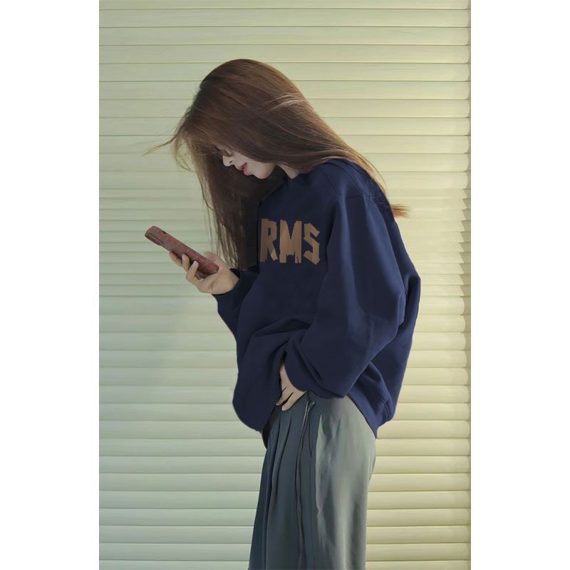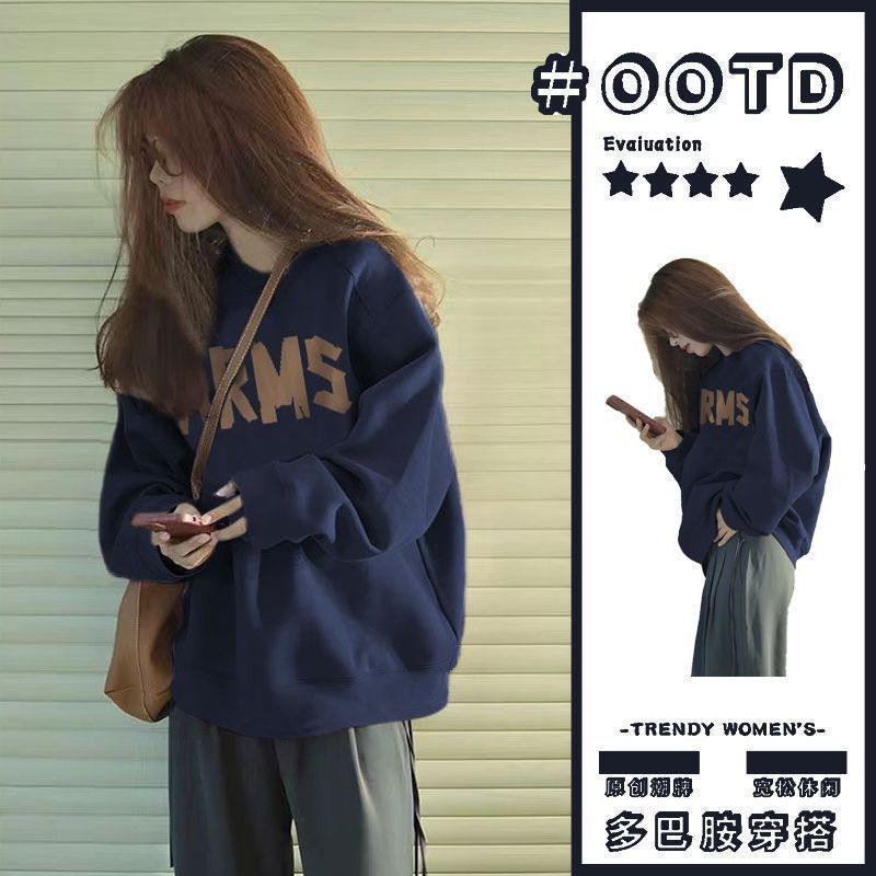 美式宽松显瘦百搭圆领卫衣女藏青色不起球秋冬加绒加厚上衣服潮流