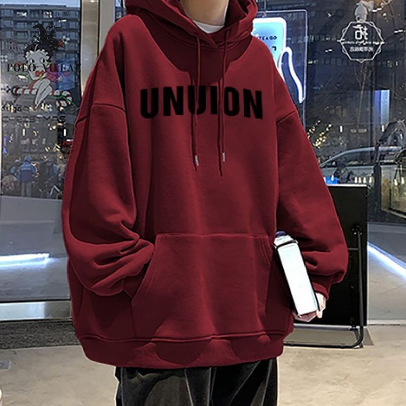 美式字母印花个性小众oversize连帽卫衣男女秋冬酒红色外套上衣潮