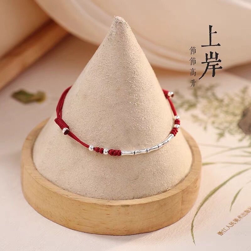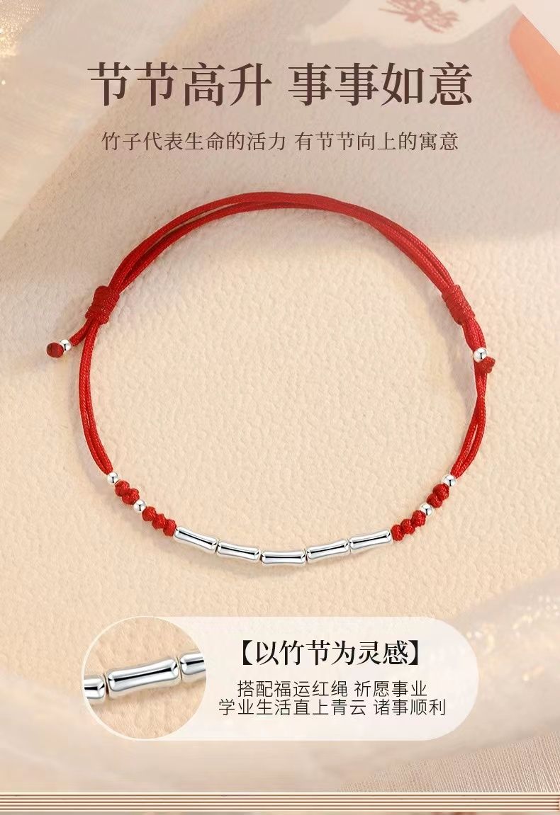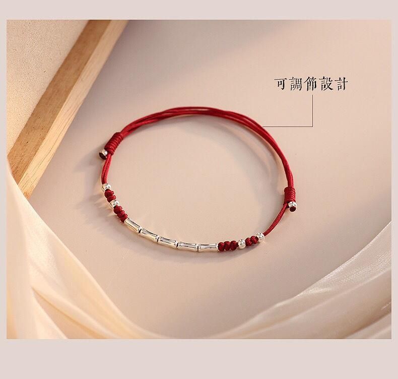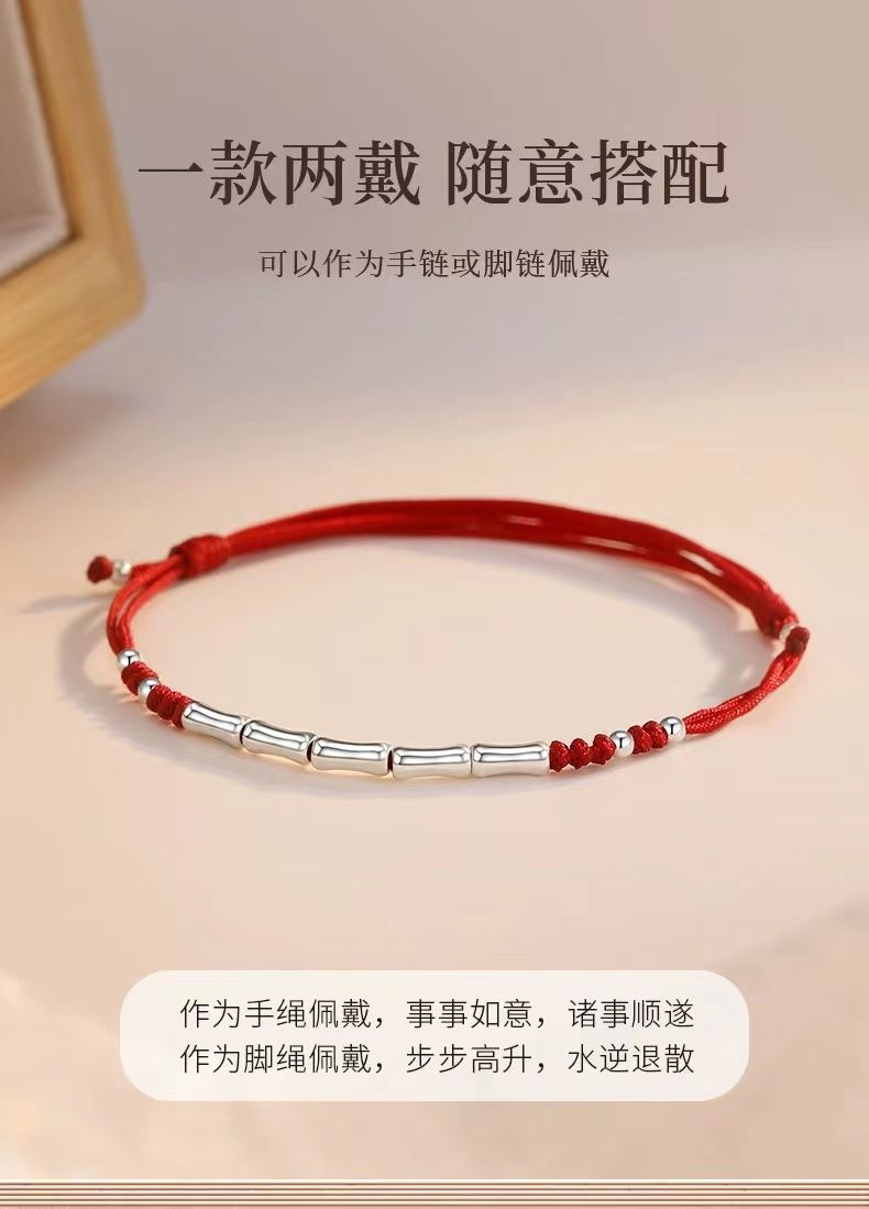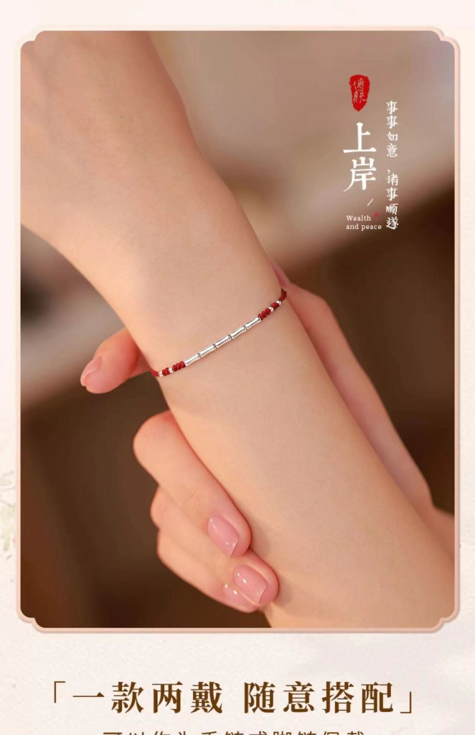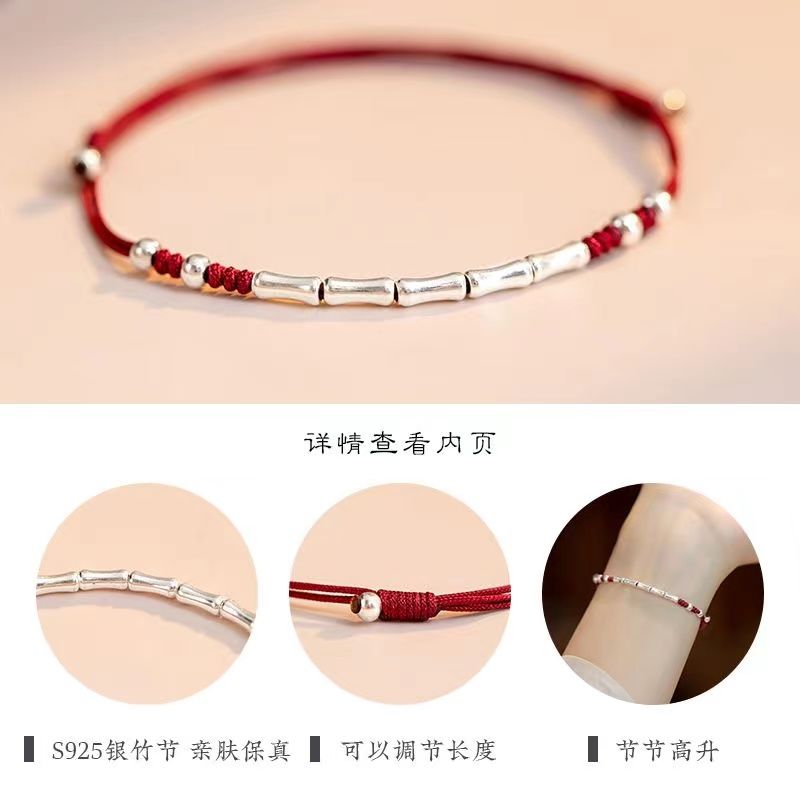 上岸S925纯银手链红绳银竹节编织脚链节节高考研手绳可调节礼物