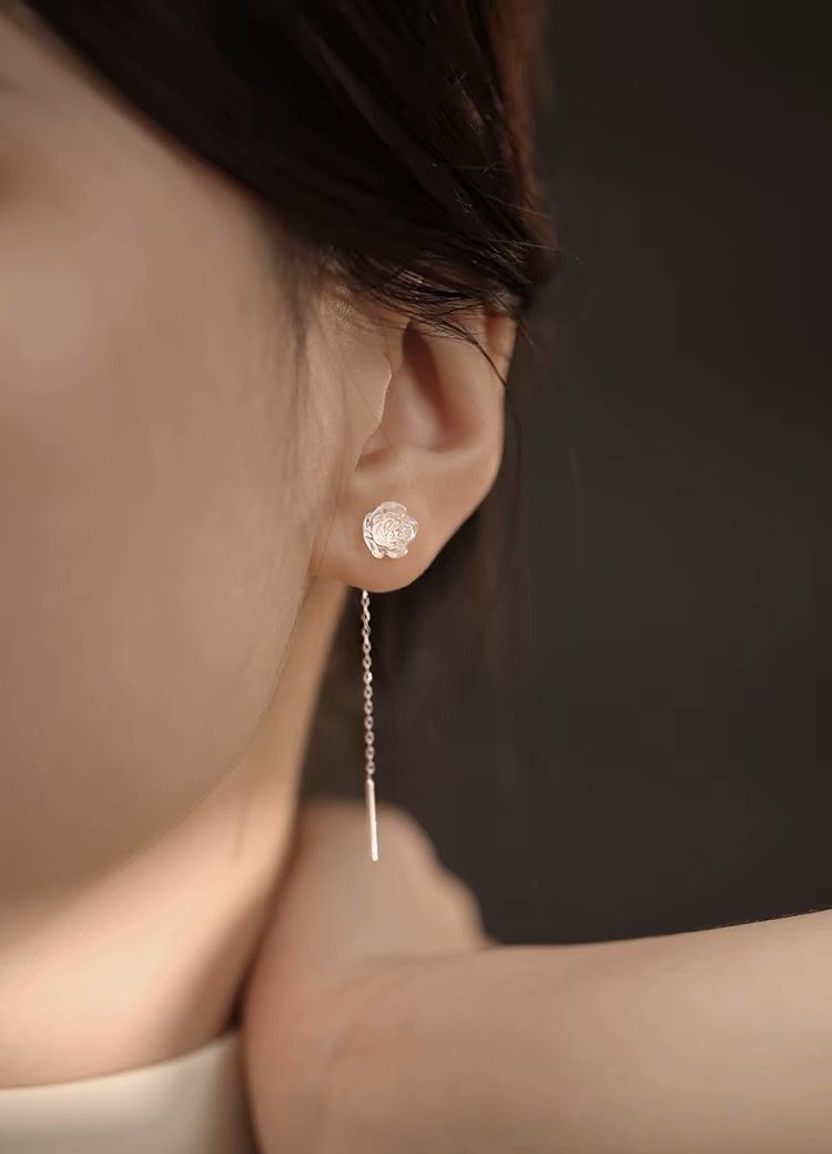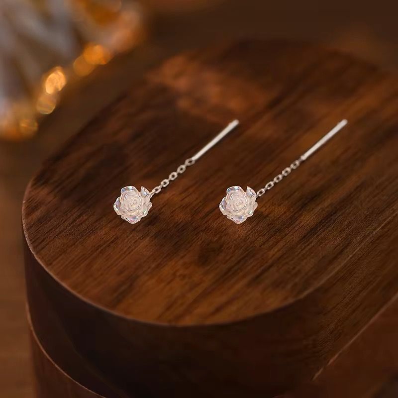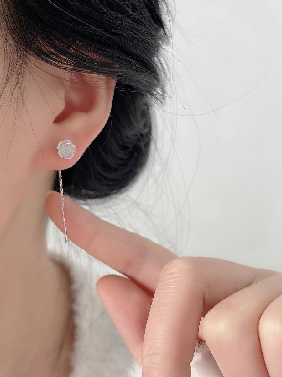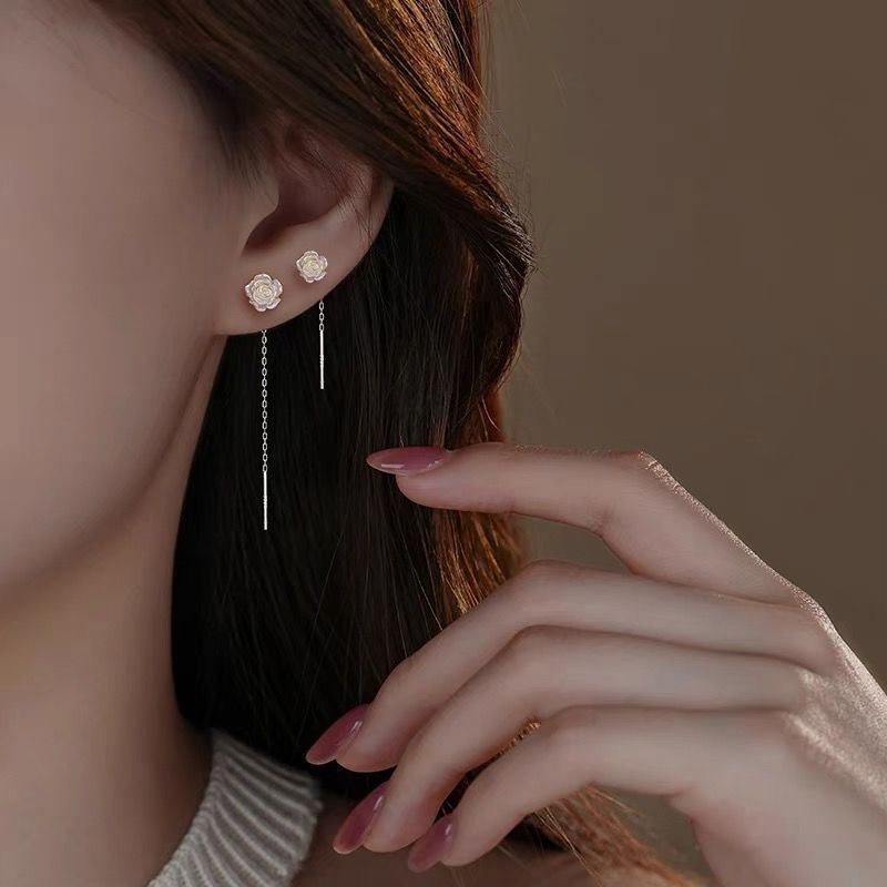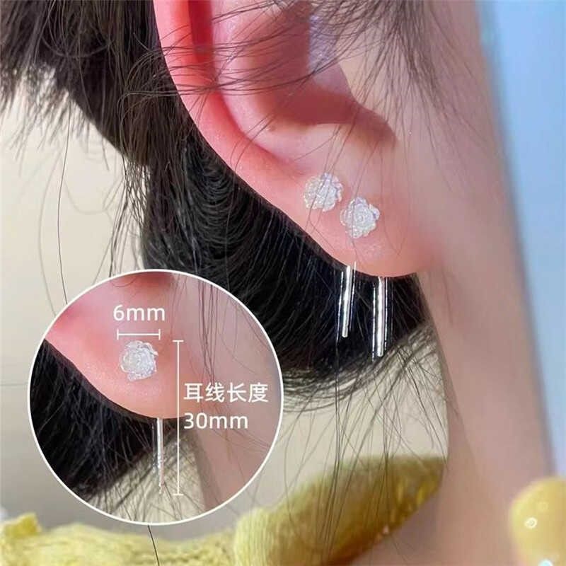 s925银玫瑰花朵耳线清新简约超仙小众设计小花朵防过敏气质耳环