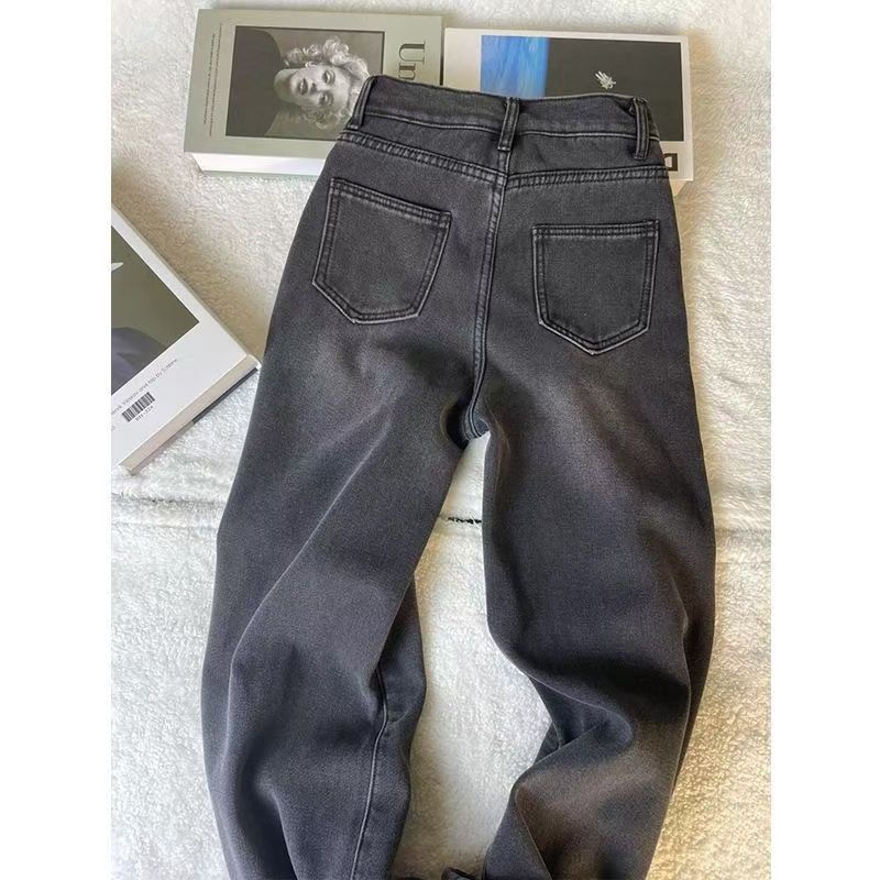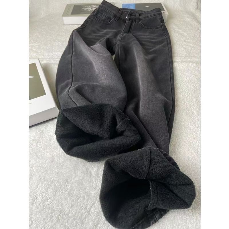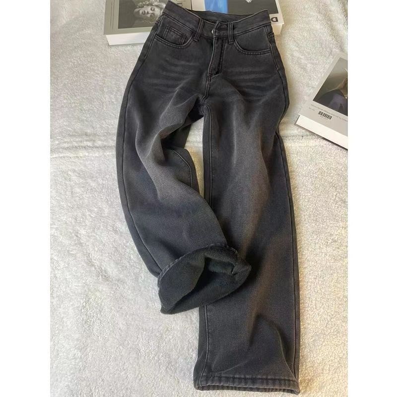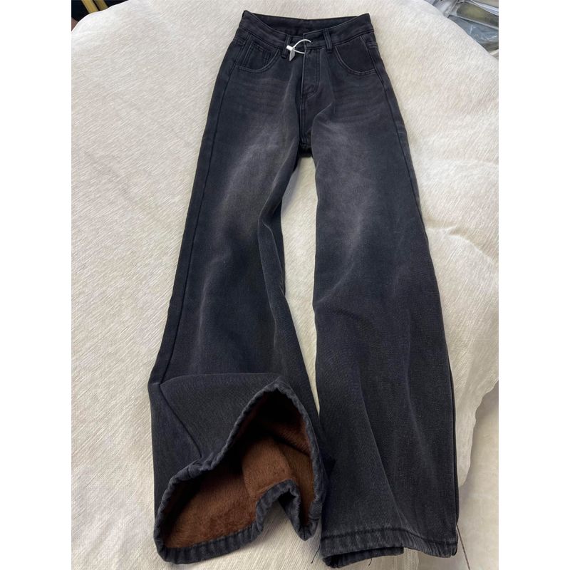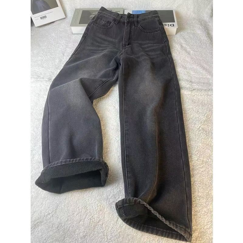 黑灰色加绒保暖宽松直筒牛仔裤女秋冬新款美式复古高腰垂感阔腿裤